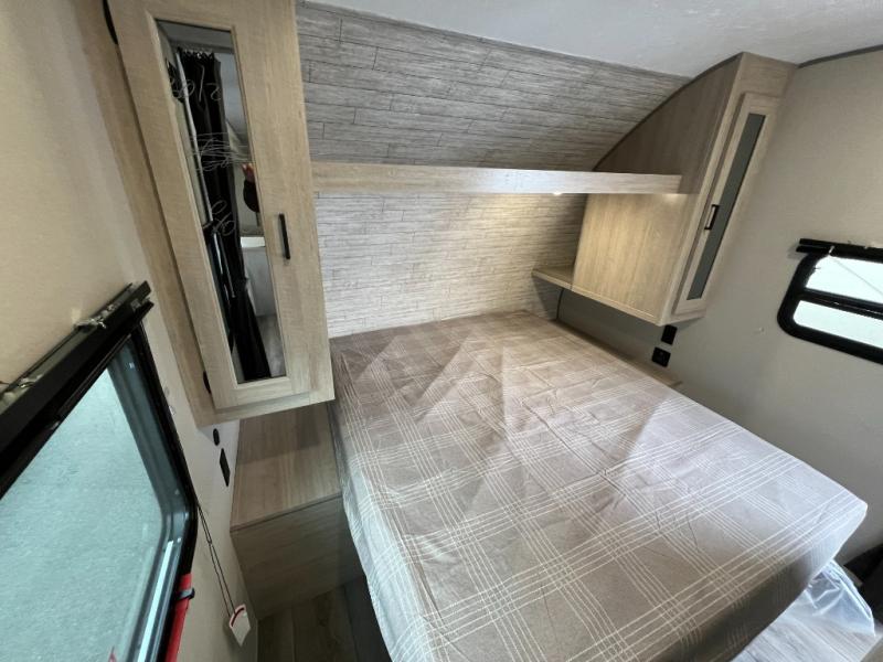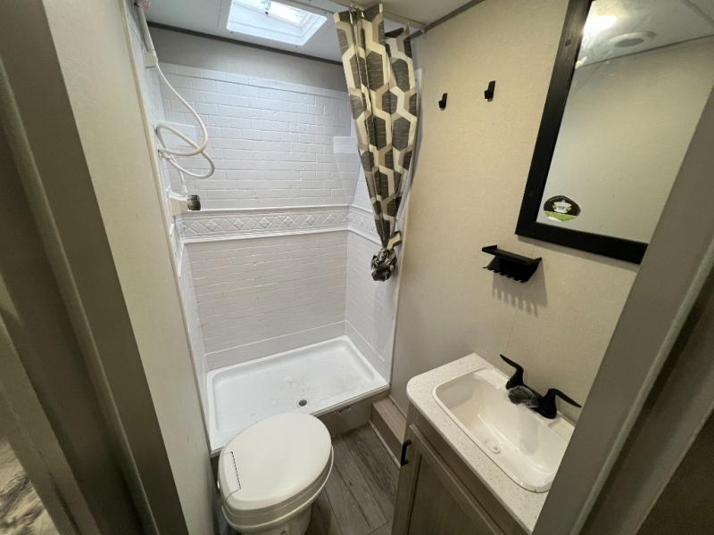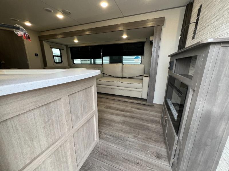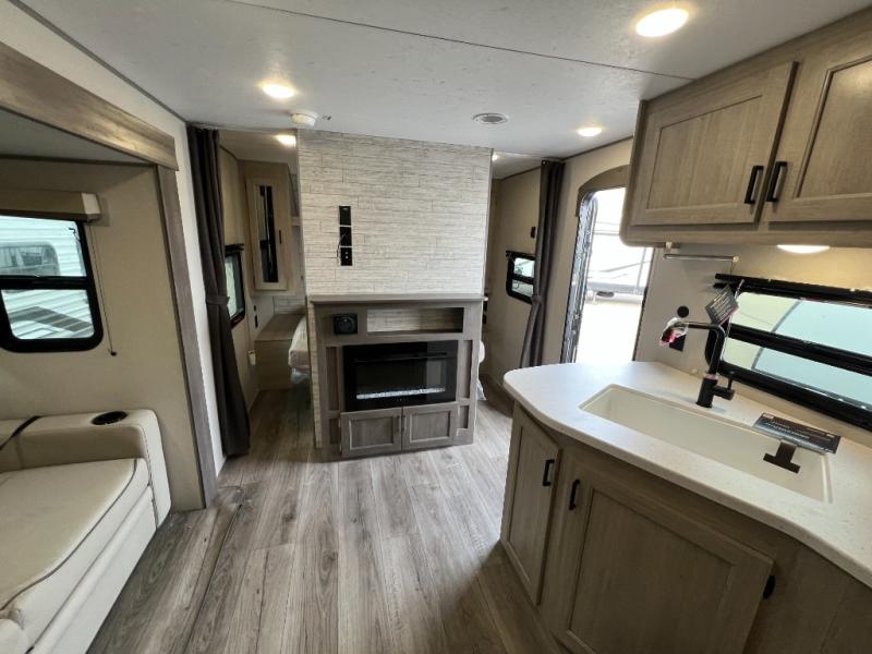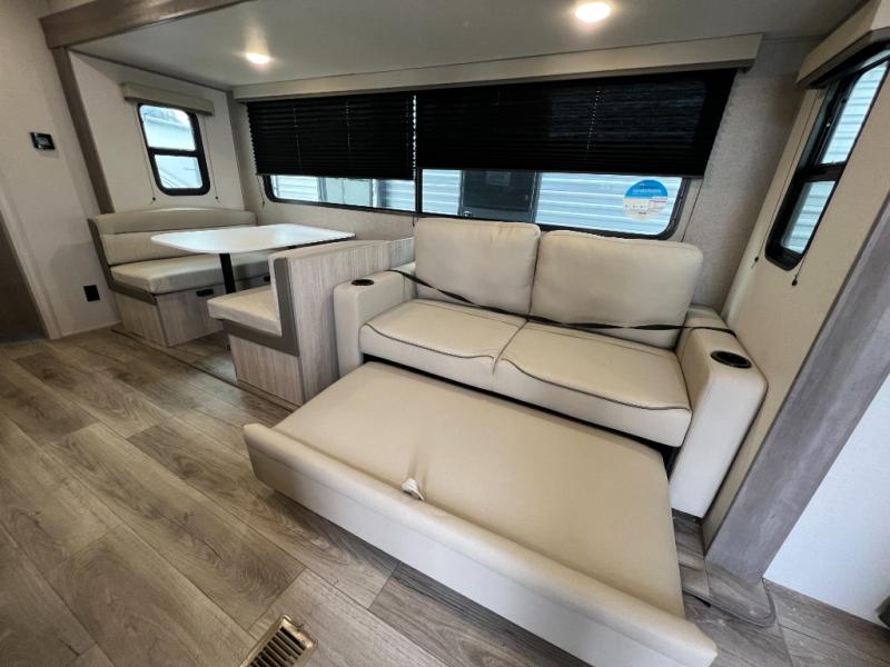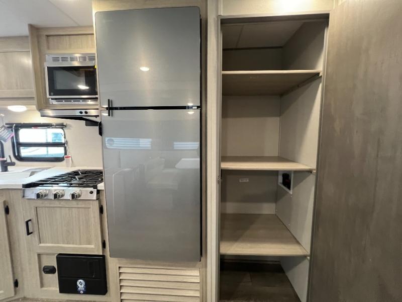 This is the perfect mid-size travel trailer for you and your family! The 46" x 74" double-size bunk beds with lower interior storage offer a comfortable sleeping space for the kids and you will have your own private sleeping space with the 60" x 74" queen bed in the front bedroom. Freshen up each morning in the rear corner bathroom with the tub/shower and a mirror to get ready each morning. You can prepare your best home cooked meals with the GE stainless three burner cooktop and GE stainless 10.7 cu. ft. 12V refrigerator, then enjoy them together at the booth dinette. The sofa is near the entertainment center for a relaxing movie night. Don't leave any of your outdoor gear behind either, thanks to the front pass-through storage area and the exterior outside storage area. You could even add the optional outside camper kitchen to grill the catch of the day on the pull out griddle!