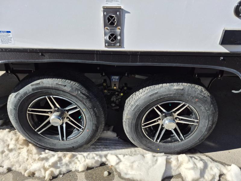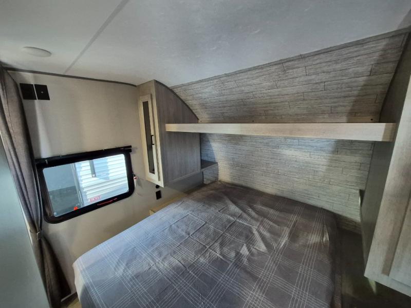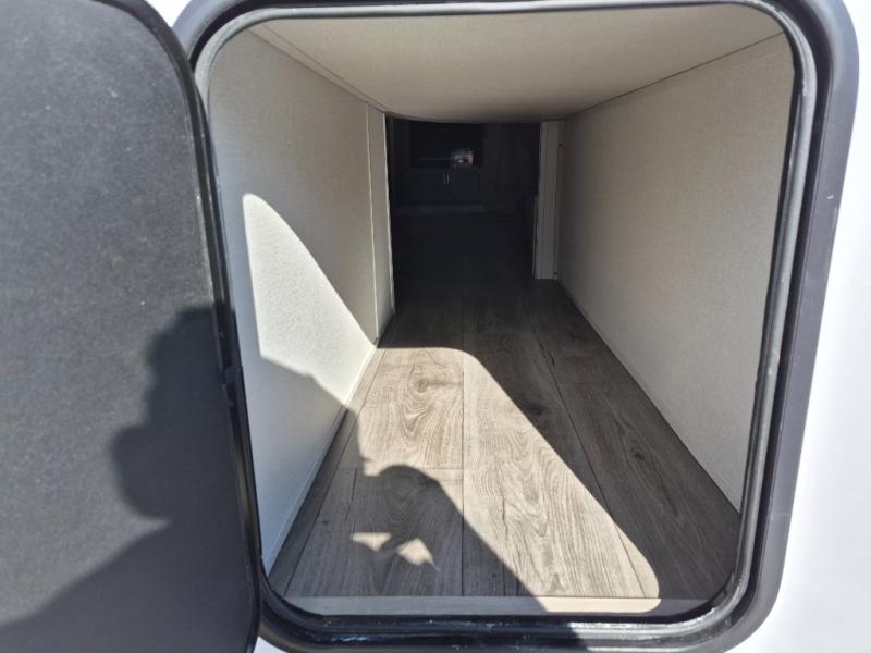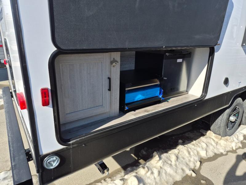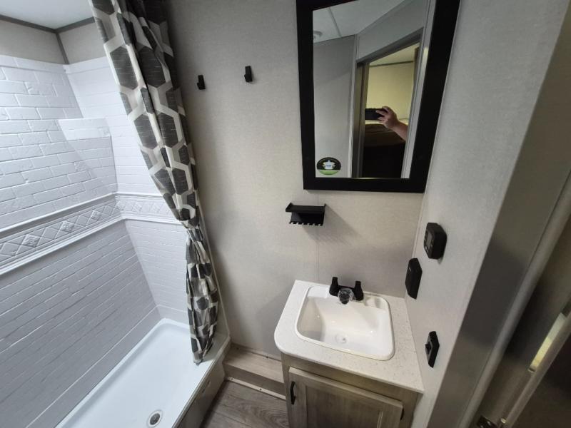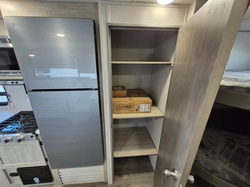 This is the perfect mid-size travel trailer for you and your family! The 46" x 74" double-size bunk beds with lower interior storage offer a comfortable sleeping space for the kids and you will have your own private sleeping space with the 60" x 74" queen bed in the front bedroom. Freshen up each morning in the rear corner bathroom with the tub/shower and a mirror to get ready each morning. You can prepare your best home cooked meals with the GE stainless three burner cooktop and GE stainless 10.7 cu. ft. 12V refrigerator, then enjoy them together at the booth dinette. The sofa is near the entertainment center for a relaxing movie night. Don't leave any of your outdoor gear behind either, thanks to the front pass-through storage area and the exterior outside storage area. You could even add the optional outside camper kitchen to grill the catch of the day on the pull out griddle!