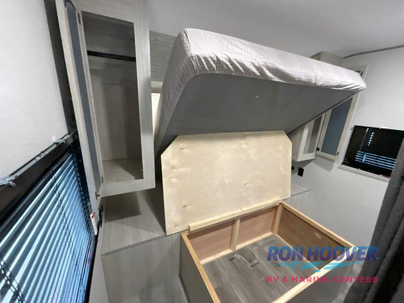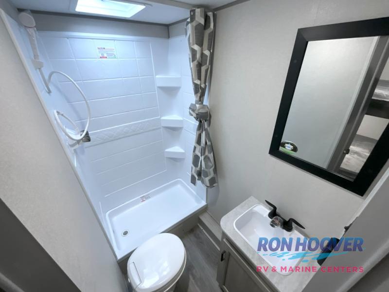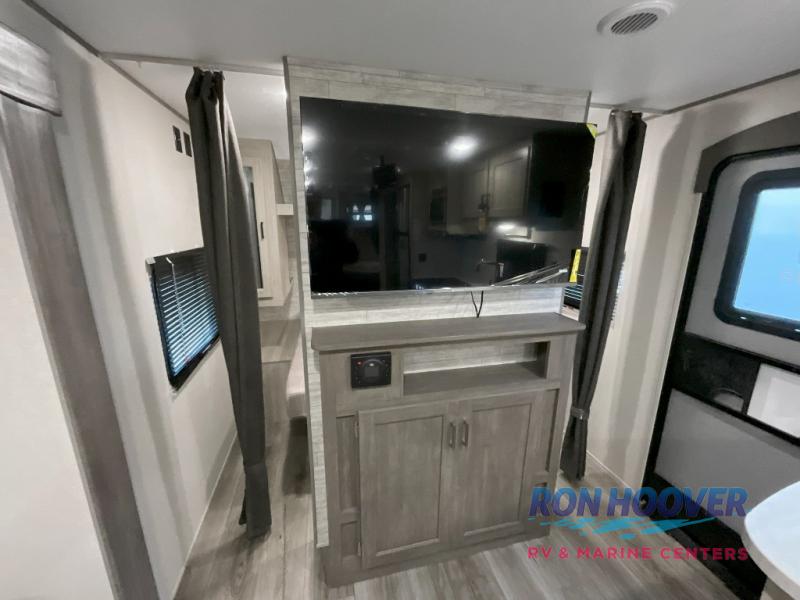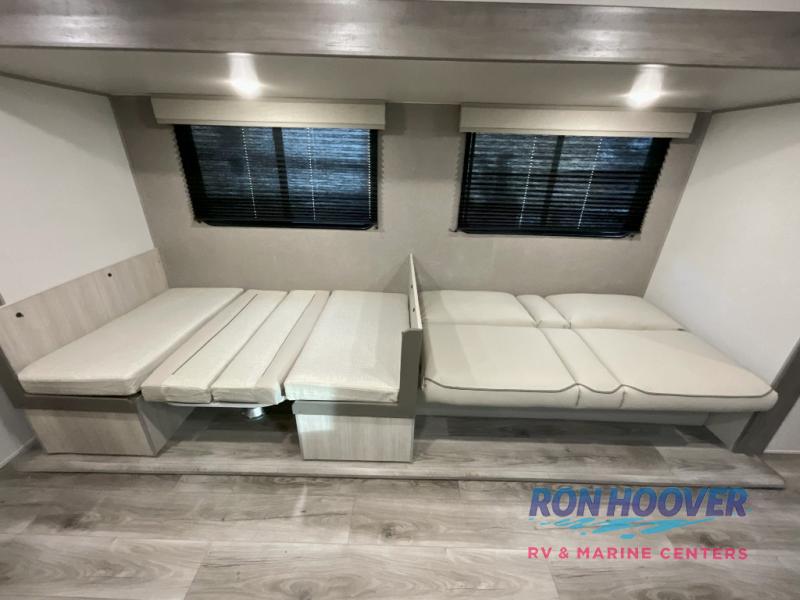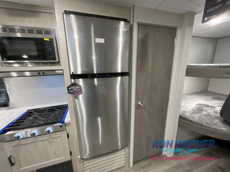 This is the perfect mid-size travel trailer for you and your family! The 46" x 74" double-size bunk beds with lower interior storage offer a comfortable sleeping space for the kids and you will have your own private sleeping space with the 60" x 74" queen bed in the front bedroom. Freshen up each morning in the rear corner bathroom with the tub/shower and a mirror to get ready each morning. You can prepare your best home cooked meals with the GE stainless three burner cooktop and GE stainless 10.7 cu. ft. 12V refrigerator, then enjoy them together at the booth dinette. The sofa is near the entertainment center for a relaxing movie night. Don't leave any of your outdoor gear behind either, thanks to the front pass-through storage area and the exterior outside storage area. You could even add the optional outside camper kitchen to grill the catch of the day on the pull out griddle!