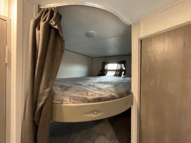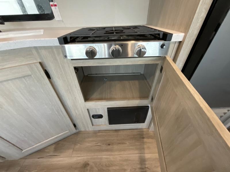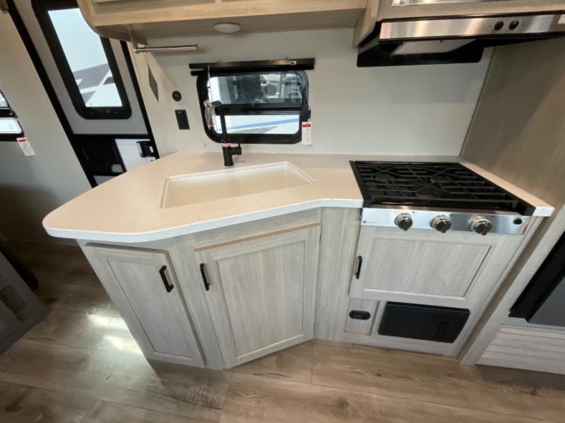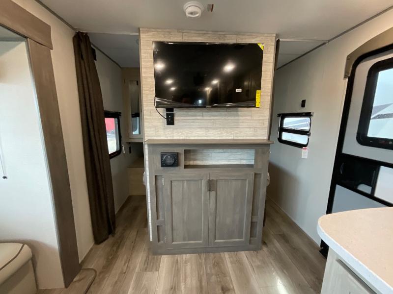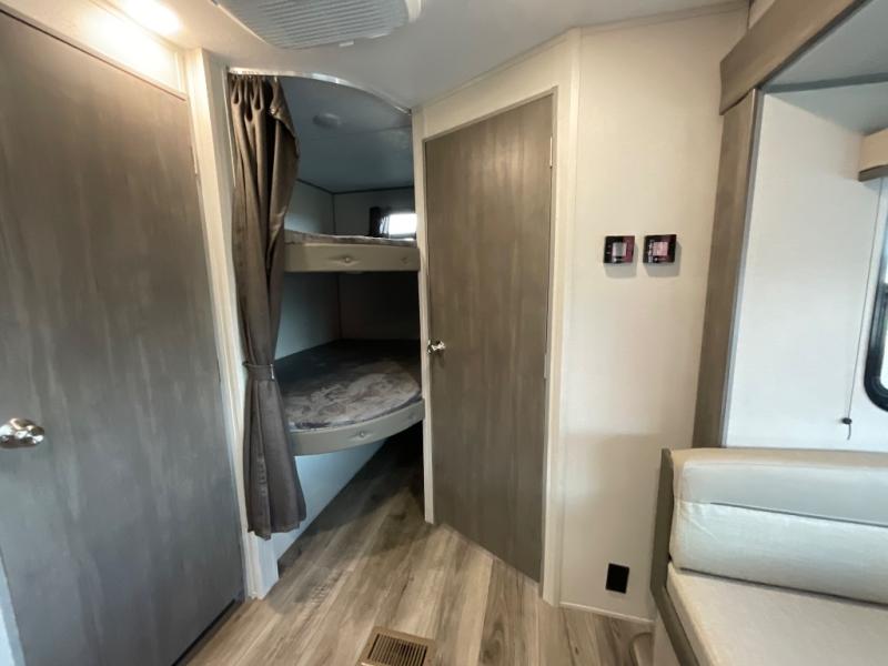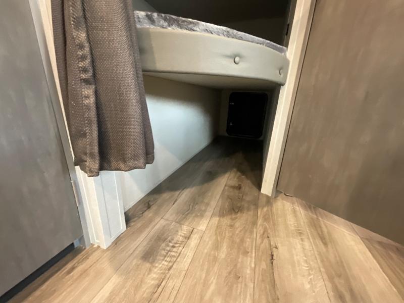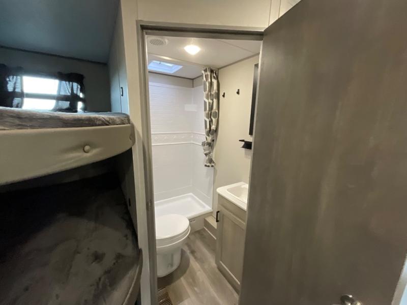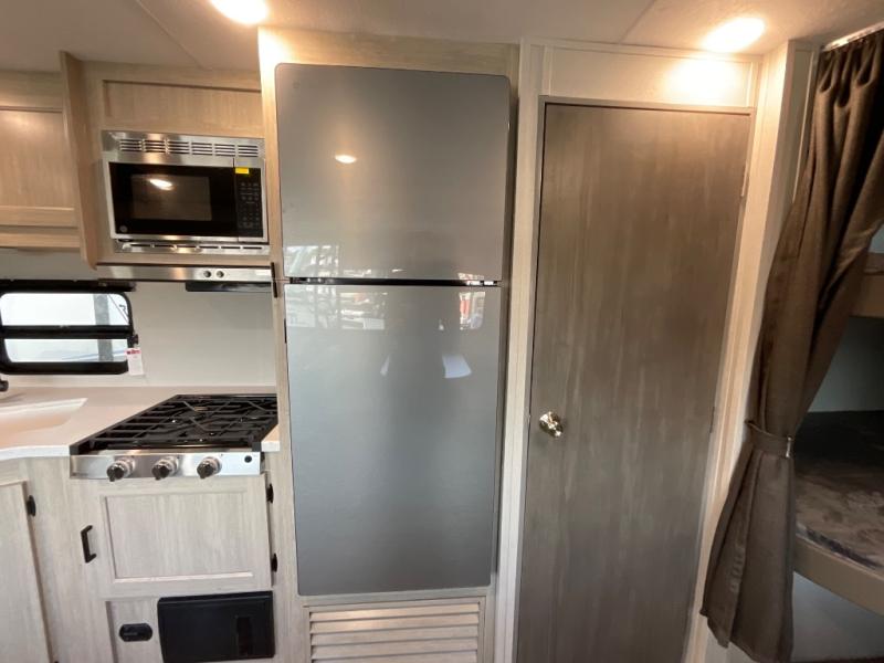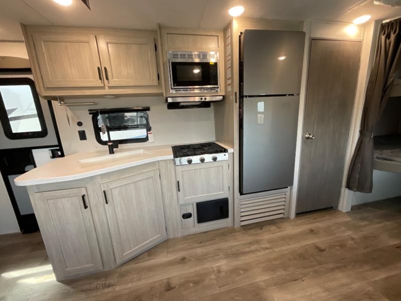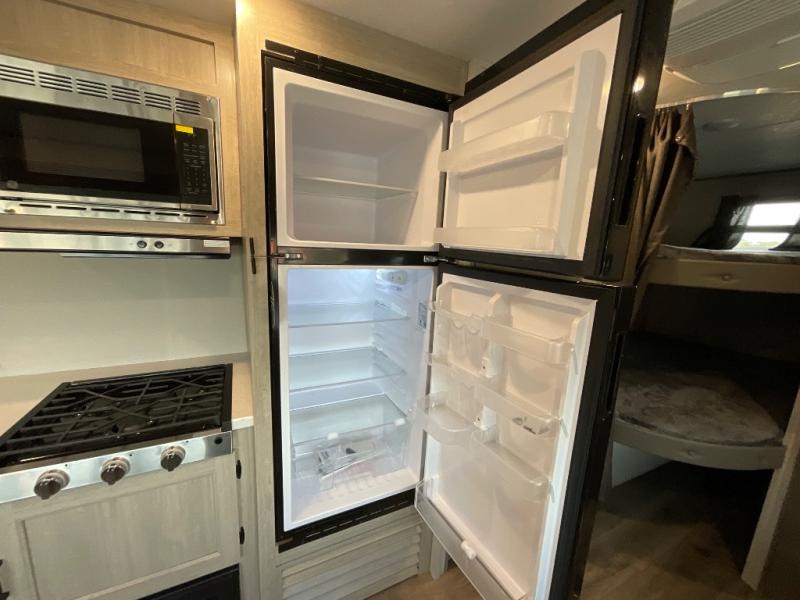 This is the perfect mid-size travel trailer for you and your family! The 46" x 74" double-size bunk beds with lower interior storage offer a comfortable sleeping space for the kids and you will have your own private sleeping space with the 60" x 74" queen bed in the front bedroom. Freshen up each morning in the rear corner bathroom with the tub/shower and a mirror to get ready each morning. You can prepare your best home cooked meals with the GE stainless three burner cooktop and GE stainless 10.7 cu. ft. 12V refrigerator, then enjoy them together at the booth dinette. The sofa is near the entertainment center for a relaxing movie night. Don't leave any of your outdoor gear behind either, thanks to the front pass-through storage area and the exterior outside storage area. You could even add the optional outside camper kitchen to grill the catch of the day on the pull out griddle!