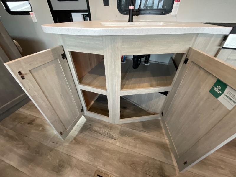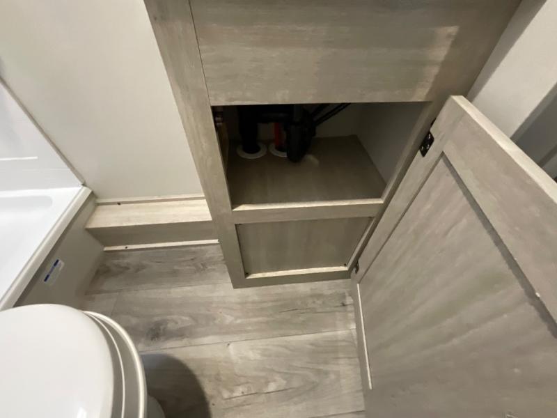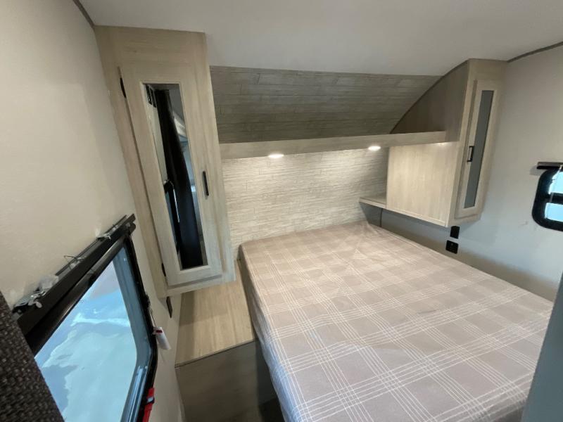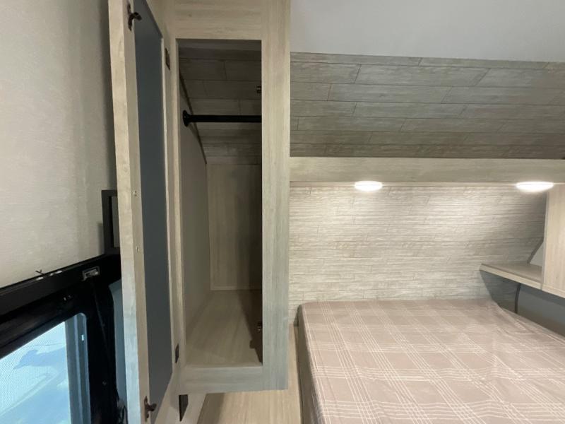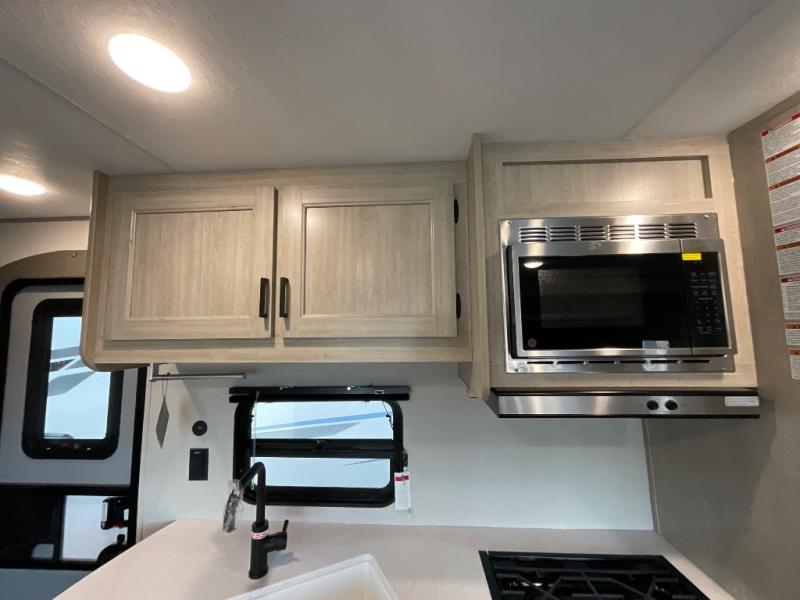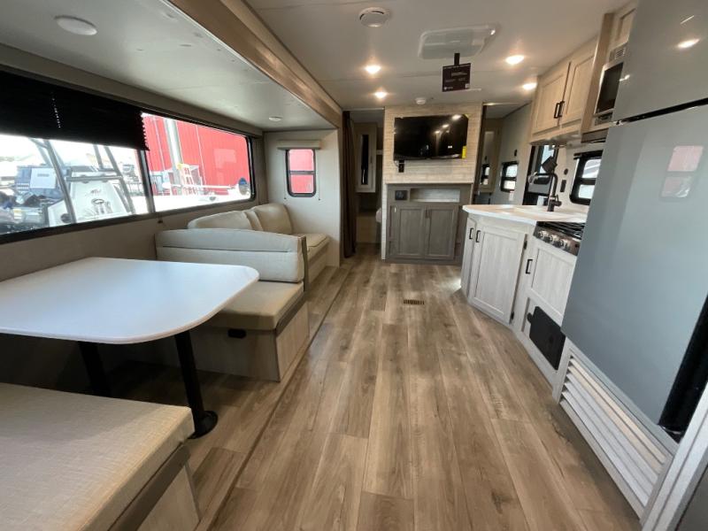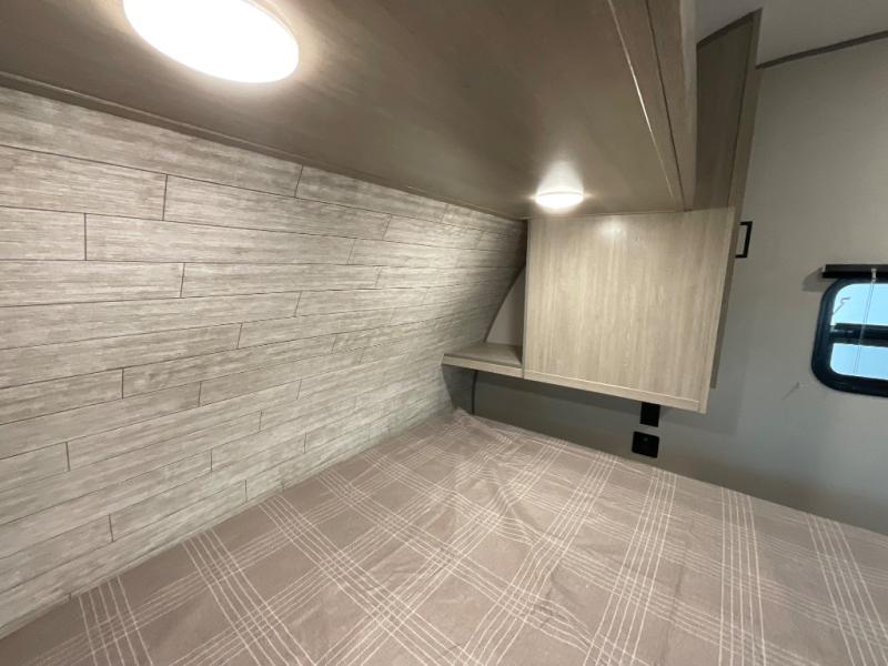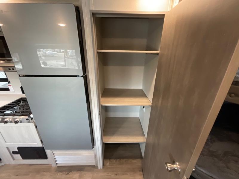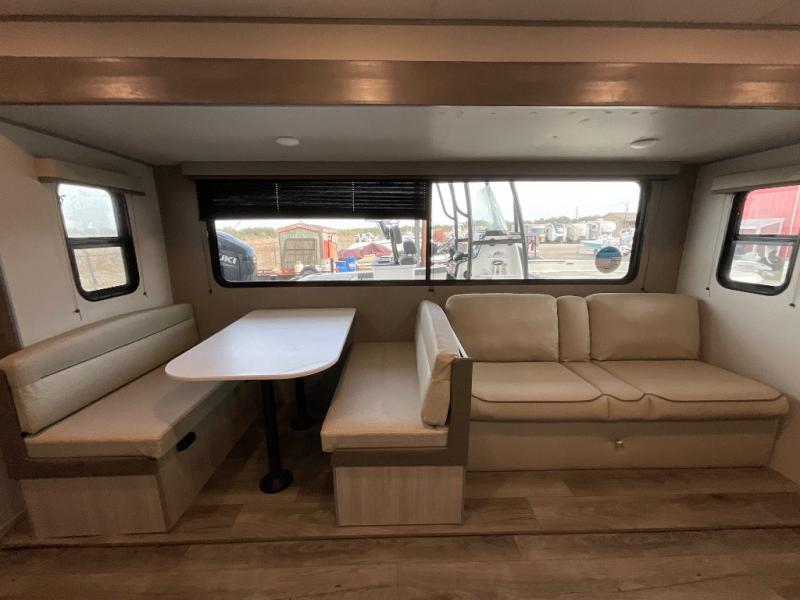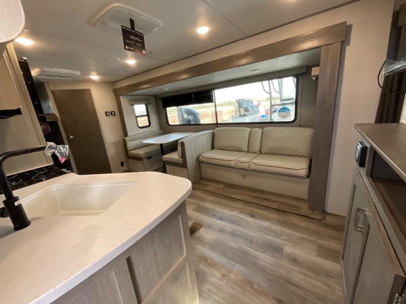This is the perfect mid-size travel trailer for you and your family! The 46" x 74" double-size bunk beds with lower interior storage offer a comfortable sleeping space for the kids and you will have your own private sleeping space with the 60" x 74" queen bed in the front bedroom. Freshen up each morning in the rear corner bathroom with the tub/shower and a mirror to get ready each morning. You can prepare your best home cooked meals with the GE stainless three burner cooktop and GE stainless 10.7 cu. ft. 12V refrigerator, then enjoy them together at the booth dinette. The sofa is near the entertainment center for a relaxing movie night. Don't leave any of your outdoor gear behind either, thanks to the front pass-through storage area and the exterior outside storage area. You could even add the optional outside camper kitchen to grill the catch of the day on the pull out griddle!