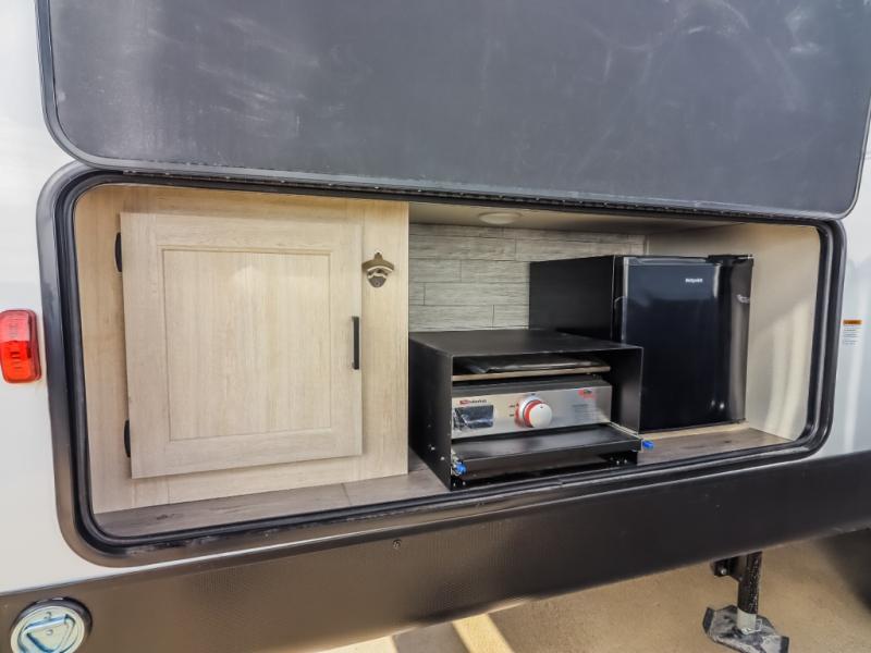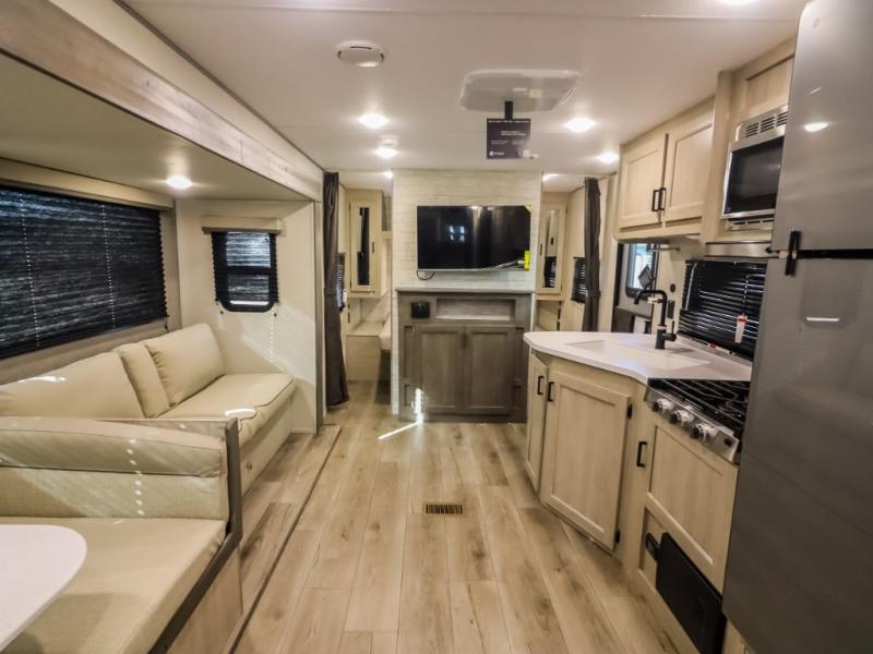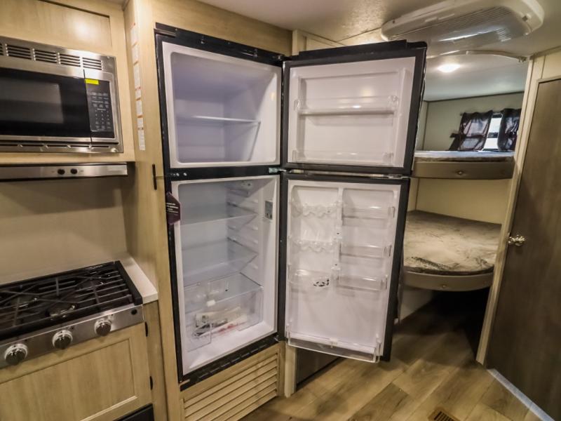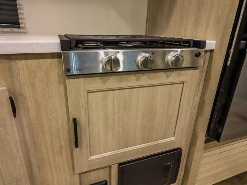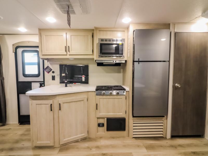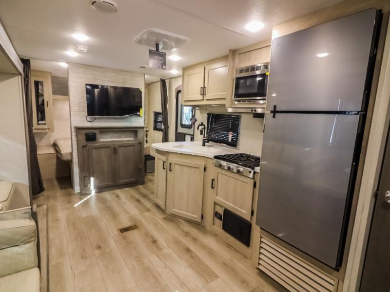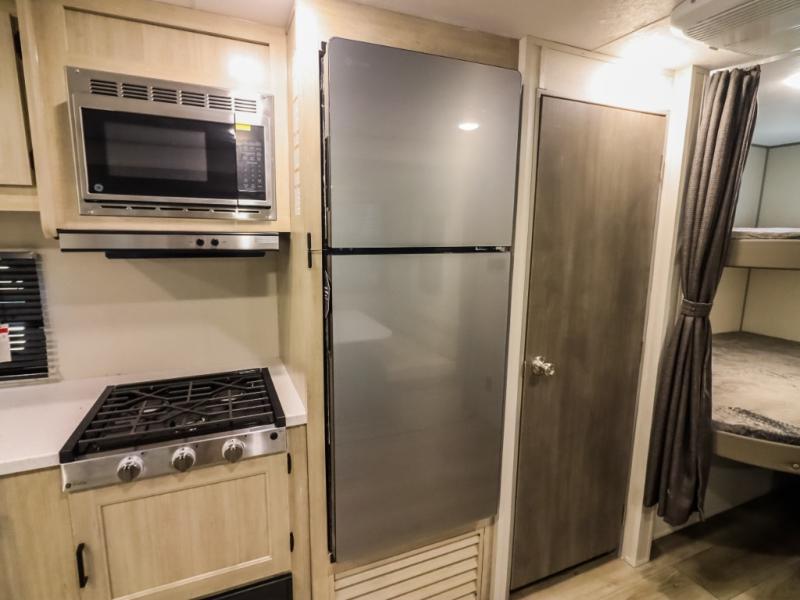 This is the perfect mid-size travel trailer for you and your family! The 46" x 74" double-size bunk beds with lower interior storage offer a comfortable sleeping space for the kids and you will have your own private sleeping space with the 60" x 74" queen bed in the front bedroom. Freshen up each morning in the rear corner bathroom with the tub/shower and a mirror to get ready each morning. You can prepare your best home cooked meals with the GE stainless three burner cooktop and GE stainless 10.7 cu. ft. 12V refrigerator, then enjoy them together at the booth dinette. The sofa is near the entertainment center for a relaxing movie night. Don't leave any of your outdoor gear behind either, thanks to the front pass-through storage area and the exterior outside storage area. You could even add the optional outside camper kitchen to grill the catch of the day on the pull out griddle!
