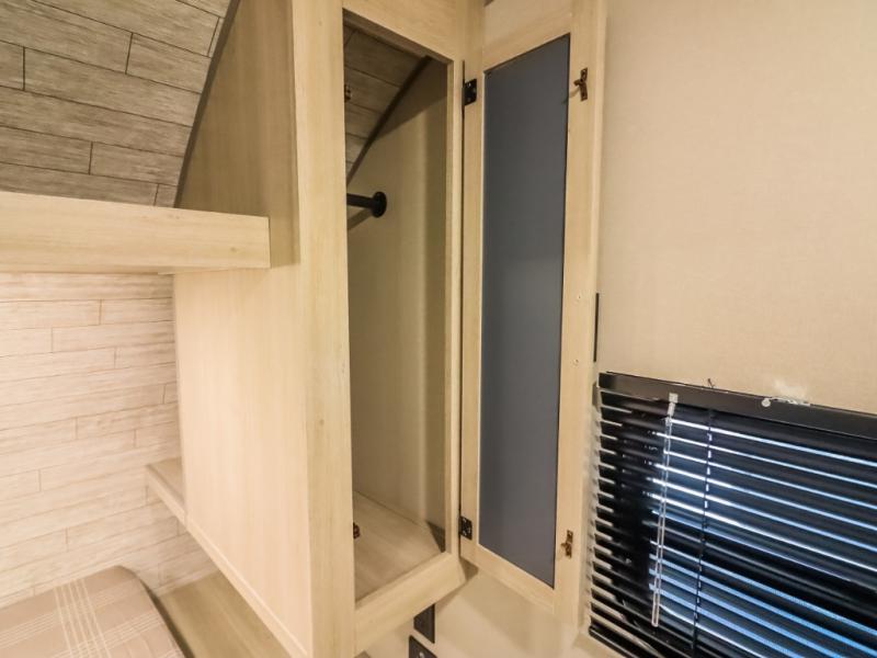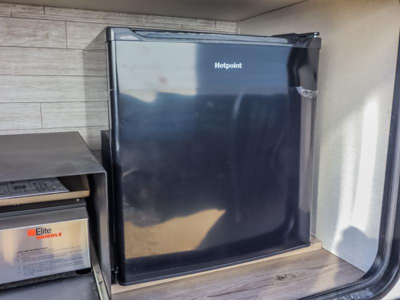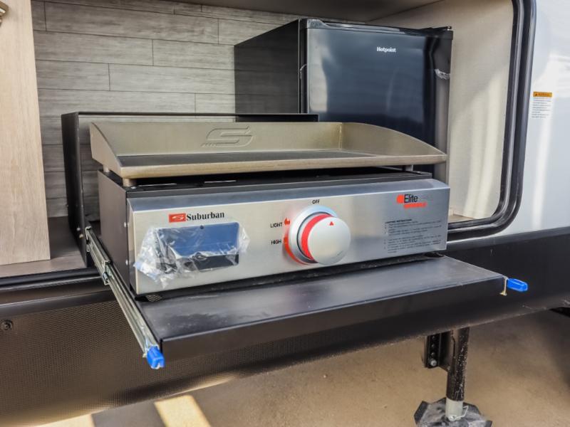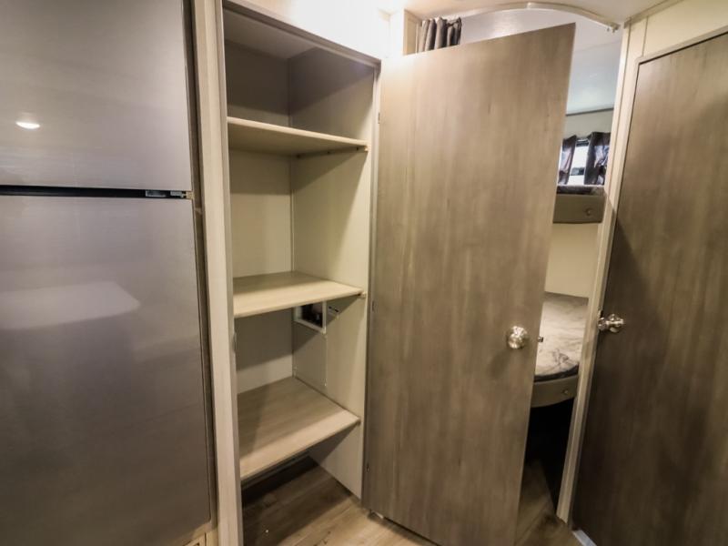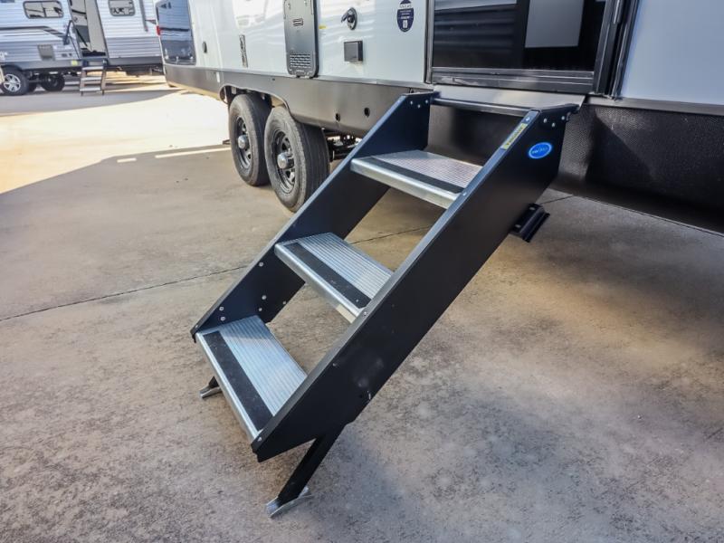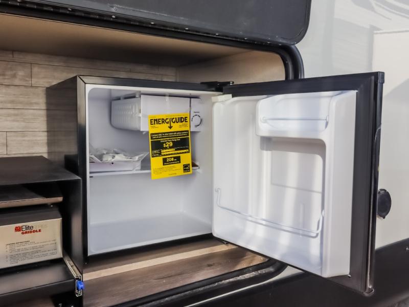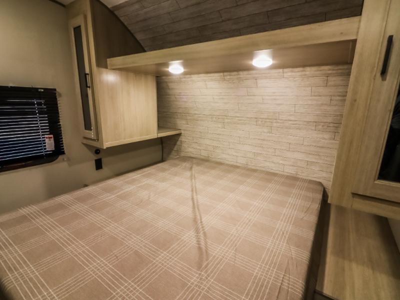 This is the perfect mid-size travel trailer for you and your family! The 46" x 74" double-size bunk beds with lower interior storage offer a comfortable sleeping space for the kids and you will have your own private sleeping space with the 60" x 74" queen bed in the front bedroom. Freshen up each morning in the rear corner bathroom with the tub/shower and a mirror to get ready each morning. You can prepare your best home cooked meals with the GE stainless three burner cooktop and GE stainless 10.7 cu. ft. 12V refrigerator, then enjoy them together at the booth dinette. The sofa is near the entertainment center for a relaxing movie night. Don't leave any of your outdoor gear behind either, thanks to the front pass-through storage area and the exterior outside storage area. You could even add the optional outside camper kitchen to grill the catch of the day on the pull out griddle!