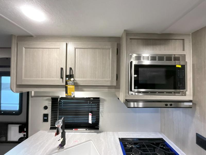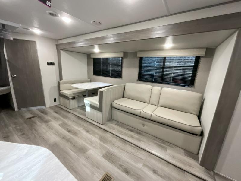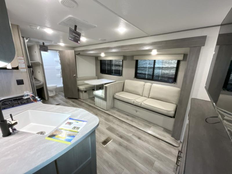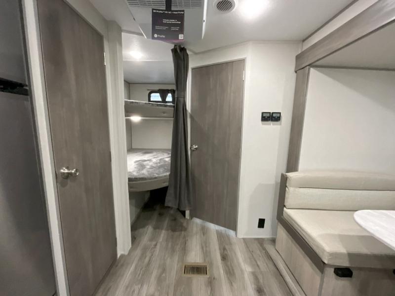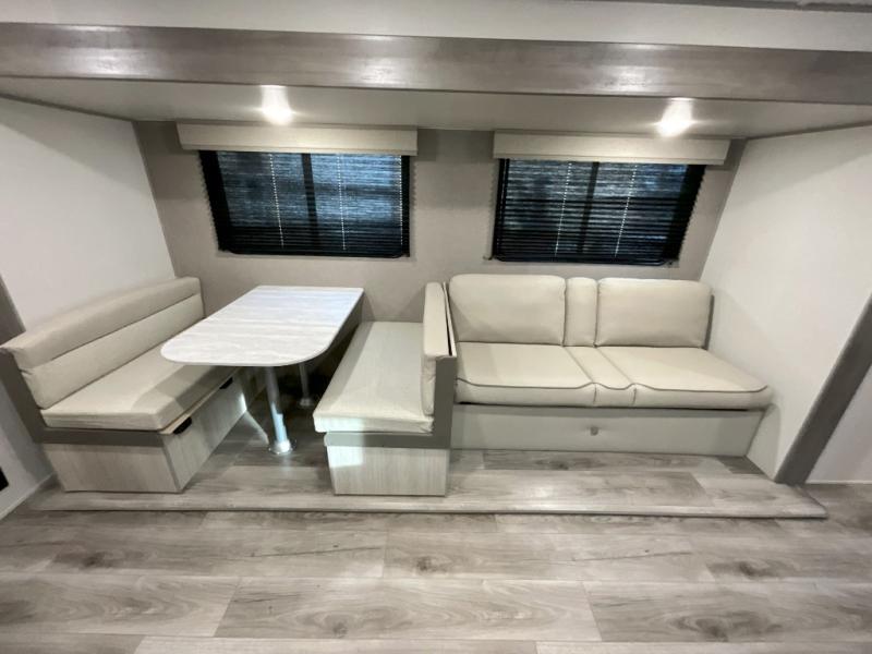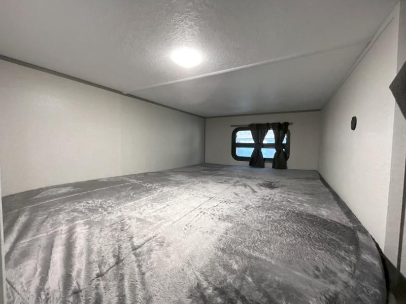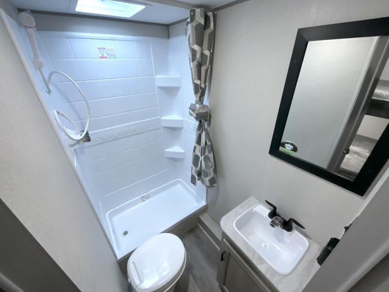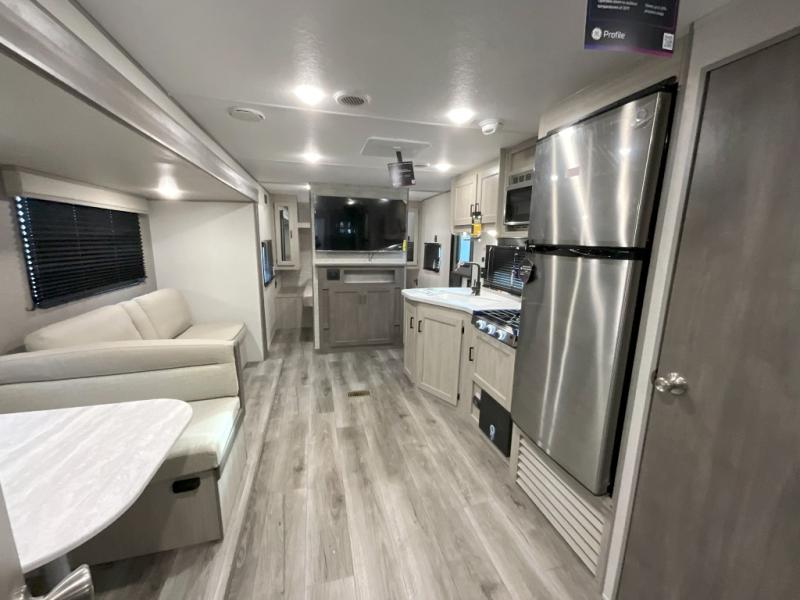 This is the perfect mid-size travel trailer for you and your family! The 46" x 74" double-size bunk beds with lower interior storage offer a comfortable sleeping space for the kids and you will have your own private sleeping space with the 60" x 74" queen bed in the front bedroom. Freshen up each morning in the rear corner bathroom with the tub/shower and a mirror to get ready each morning. You can prepare your best home cooked meals with the GE stainless three burner cooktop and GE stainless 10.7 cu. ft. 12V refrigerator, then enjoy them together at the booth dinette. The sofa is near the entertainment center for a relaxing movie night. Don't leave any of your outdoor gear behind either, thanks to the front pass-through storage area and the exterior outside storage area. You could even add the optional outside camper kitchen to grill the catch of the day on the pull out griddle!