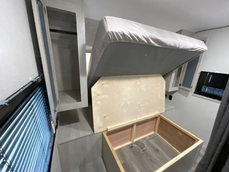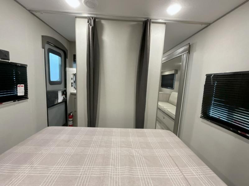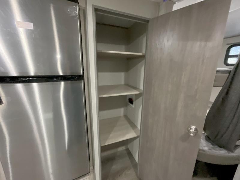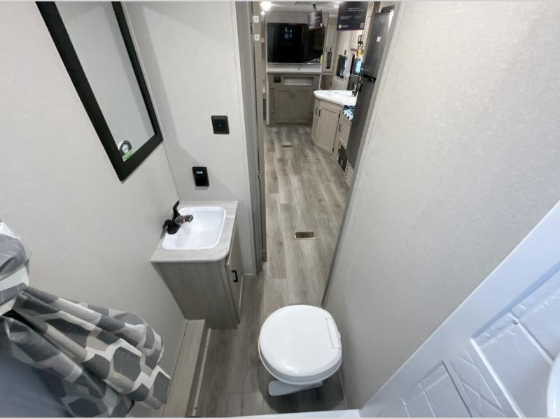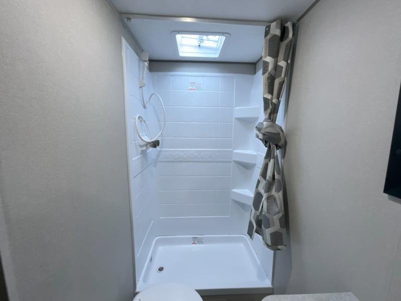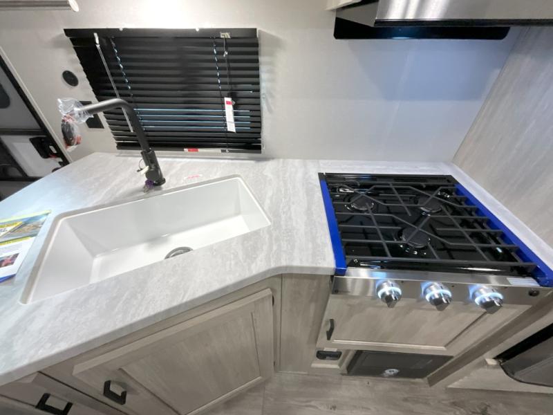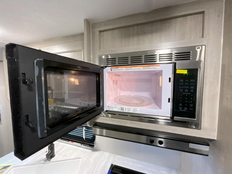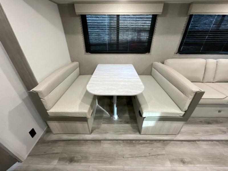 This is the perfect mid-size travel trailer for you and your family! The 46" x 74" double-size bunk beds with lower interior storage offer a comfortable sleeping space for the kids and you will have your own private sleeping space with the 60" x 74" queen bed in the front bedroom. Freshen up each morning in the rear corner bathroom with the tub/shower and a mirror to get ready each morning. You can prepare your best home cooked meals with the GE stainless three burner cooktop and GE stainless 10.7 cu. ft. 12V refrigerator, then enjoy them together at the booth dinette. The sofa is near the entertainment center for a relaxing movie night. Don't leave any of your outdoor gear behind either, thanks to the front pass-through storage area and the exterior outside storage area. You could even add the optional outside camper kitchen to grill the catch of the day on the pull out griddle!