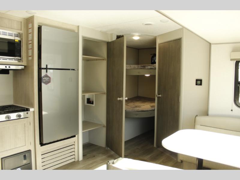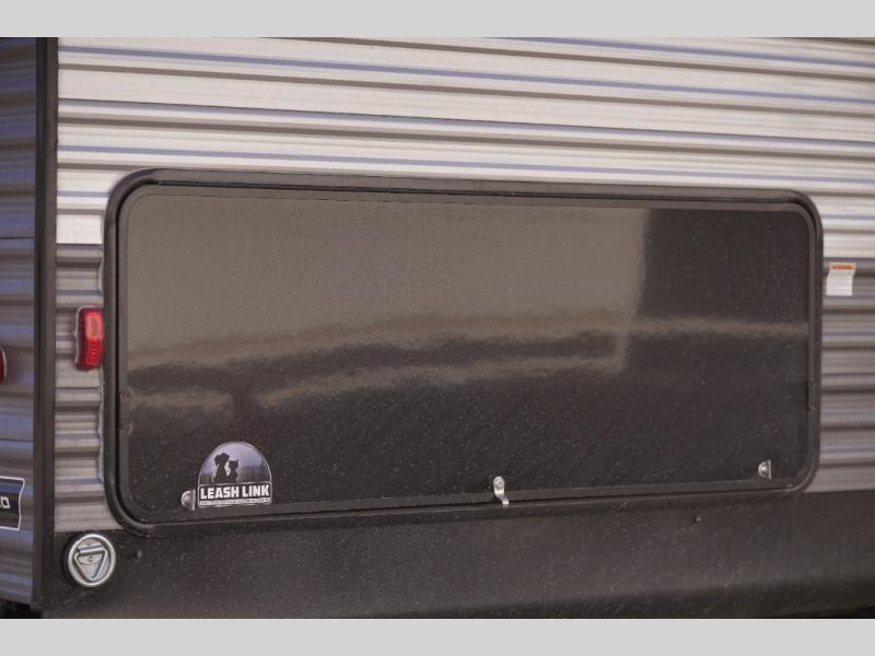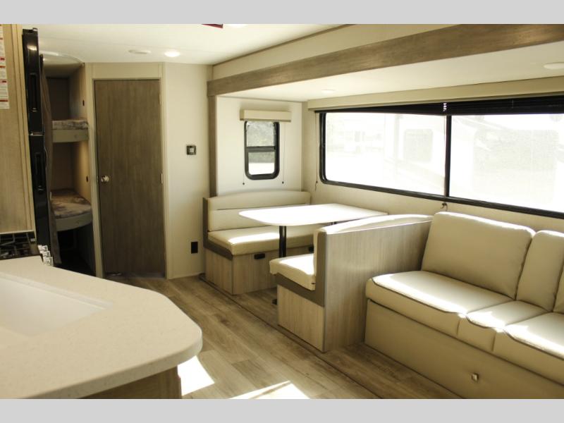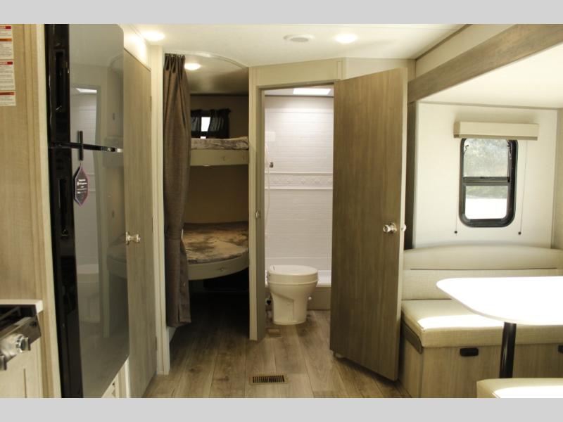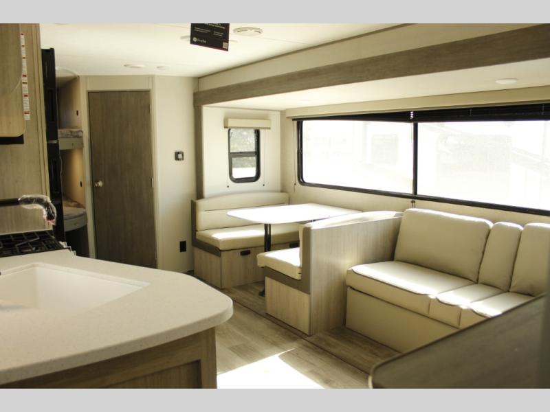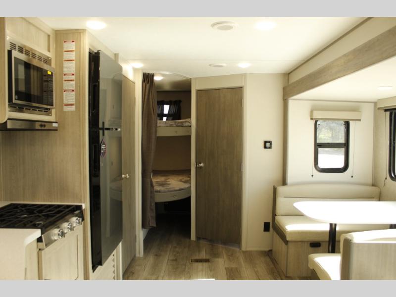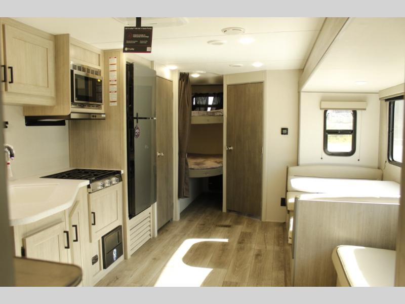 This is the perfect mid-size travel trailer for you and your family! The 46" x 74" double-size bunk beds with lower interior storage offer a comfortable sleeping space for the kids and you will have your own private sleeping space with the 60" x 74" queen bed in the front bedroom. Freshen up each morning in the rear corner bathroom with the tub/shower and a mirror to get ready each morning. You can prepare your best home cooked meals with the GE stainless three burner cooktop and GE stainless 10.7 cu. ft. 12V refrigerator, then enjoy them together at the booth dinette. The sofa is near the entertainment center for a relaxing movie night. Don't leave any of your outdoor gear behind either, thanks to the front pass-through storage area and the exterior outside storage area. You could even add the optional outside camper kitchen to grill the catch of the day on the pull out griddle!