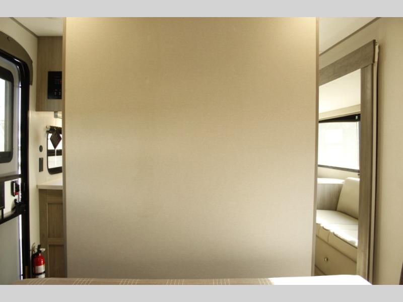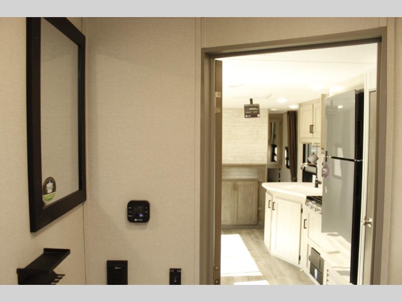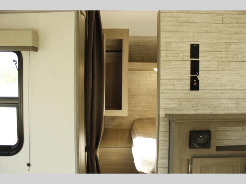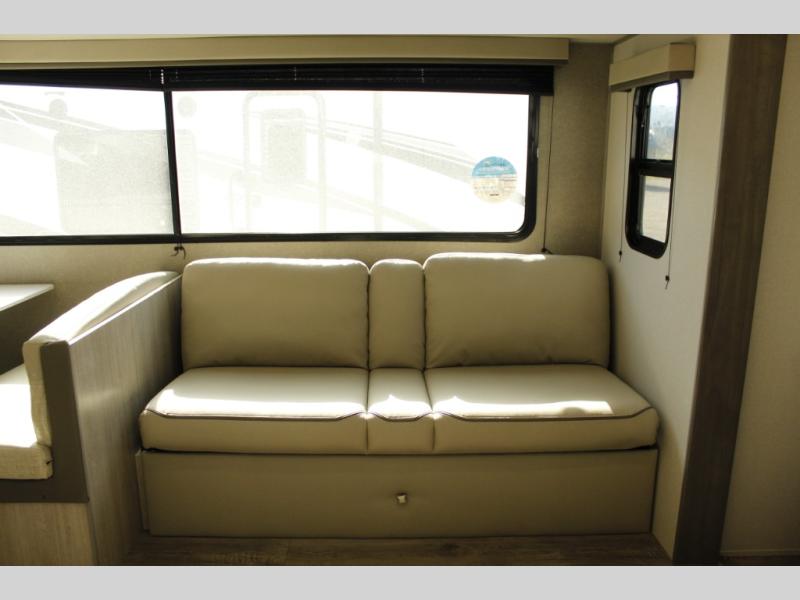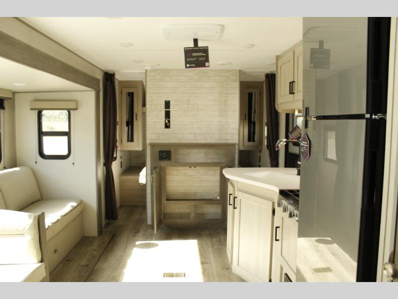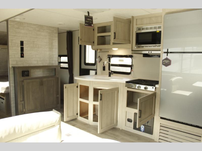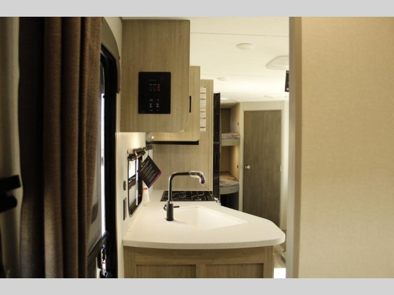 This is the perfect mid-size travel trailer for you and your family! The 46" x 74" double-size bunk beds with lower interior storage offer a comfortable sleeping space for the kids and you will have your own private sleeping space with the 60" x 74" queen bed in the front bedroom. Freshen up each morning in the rear corner bathroom with the tub/shower and a mirror to get ready each morning. You can prepare your best home cooked meals with the GE stainless three burner cooktop and GE stainless 10.7 cu. ft. 12V refrigerator, then enjoy them together at the booth dinette. The sofa is near the entertainment center for a relaxing movie night. Don't leave any of your outdoor gear behind either, thanks to the front pass-through storage area and the exterior outside storage area. You could even add the optional outside camper kitchen to grill the catch of the day on the pull out griddle!