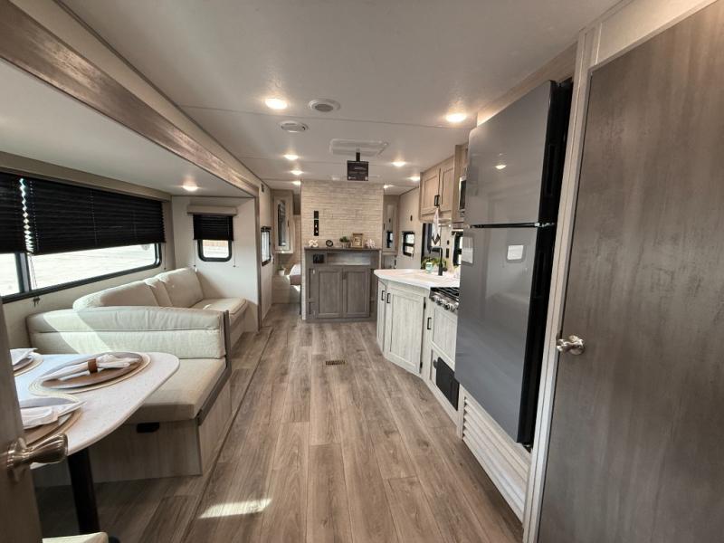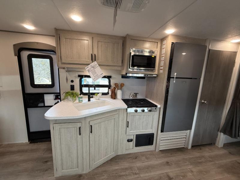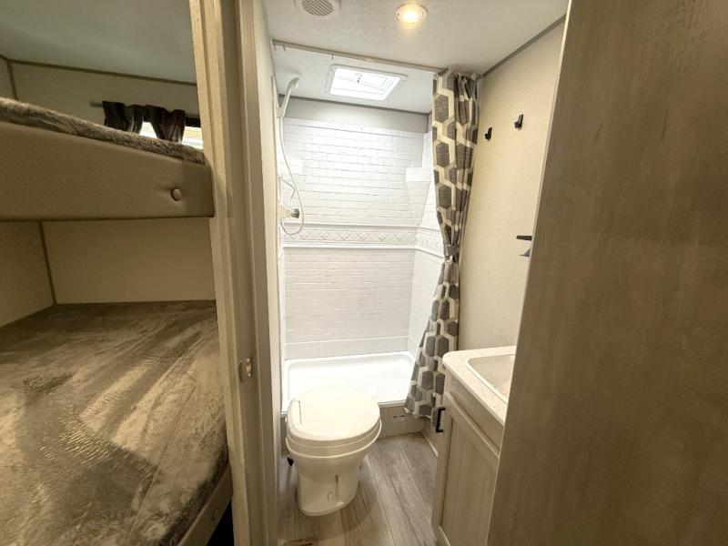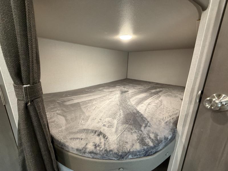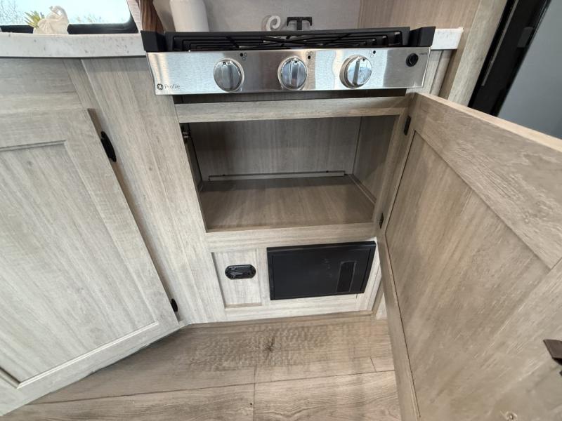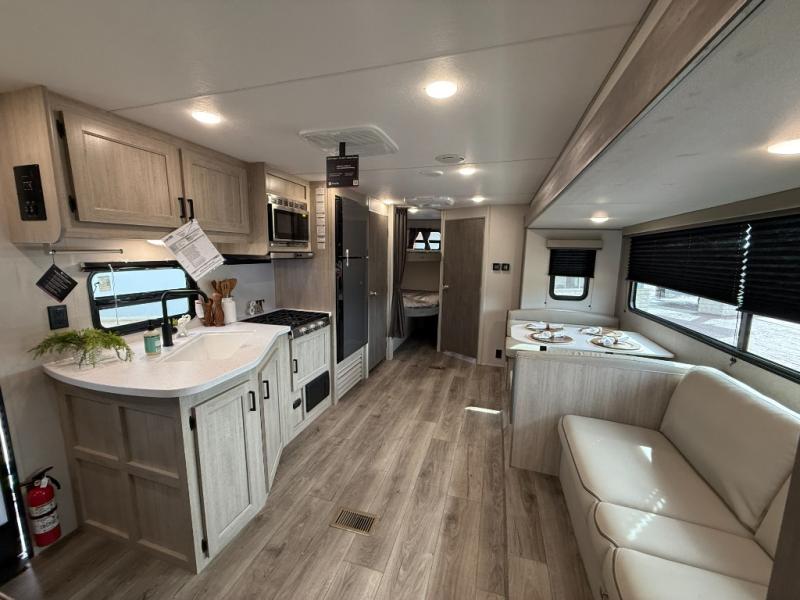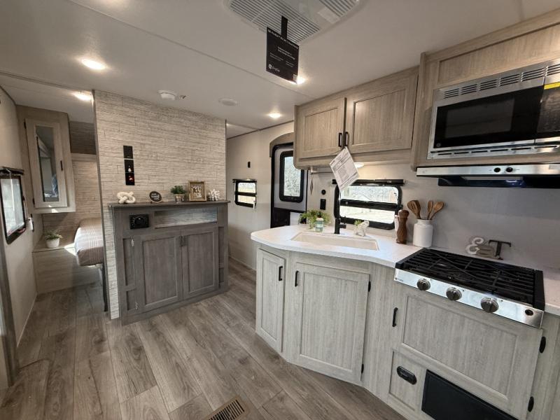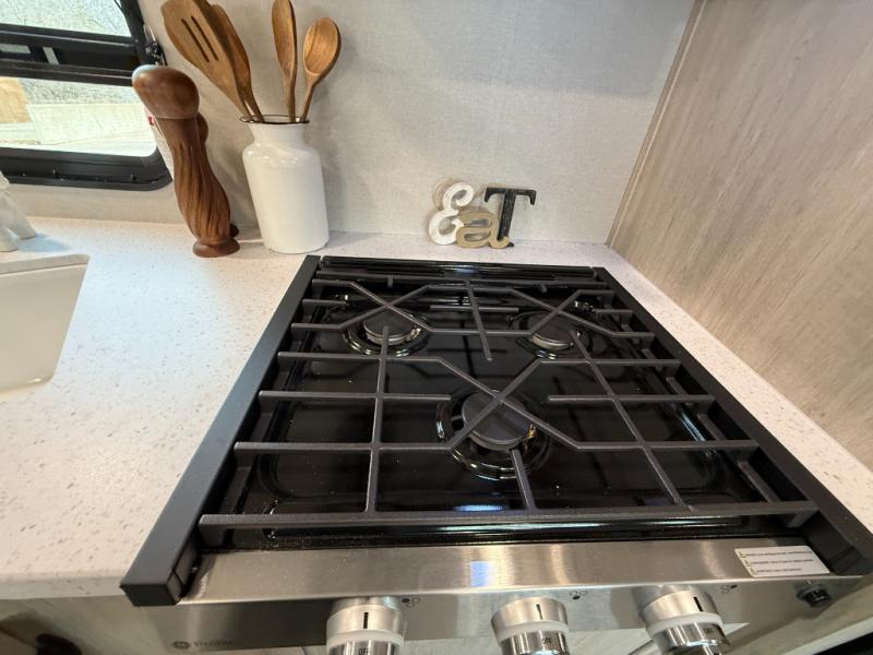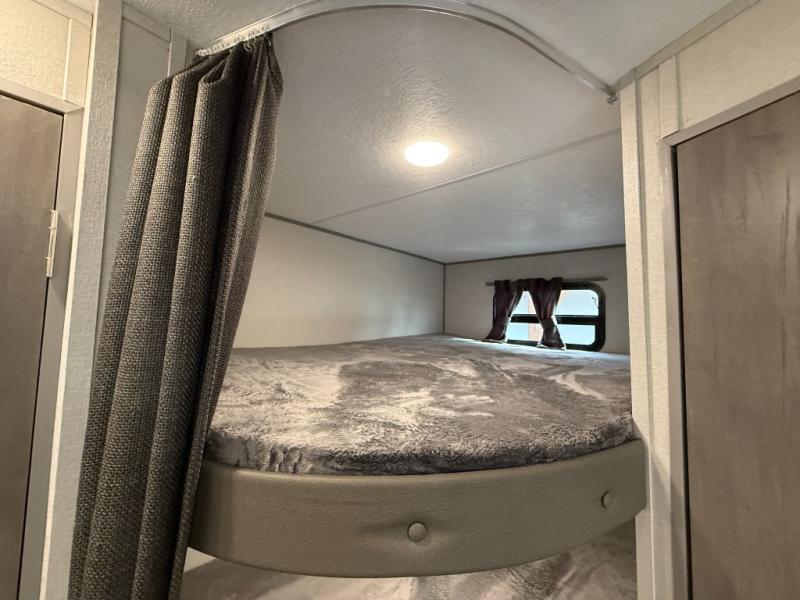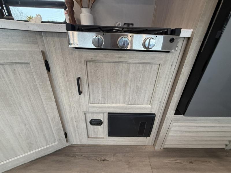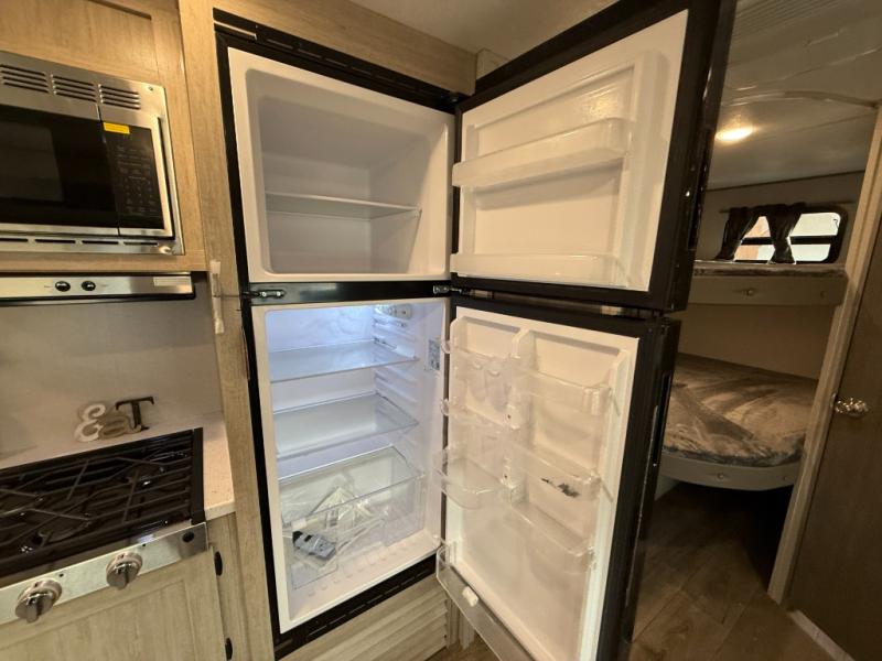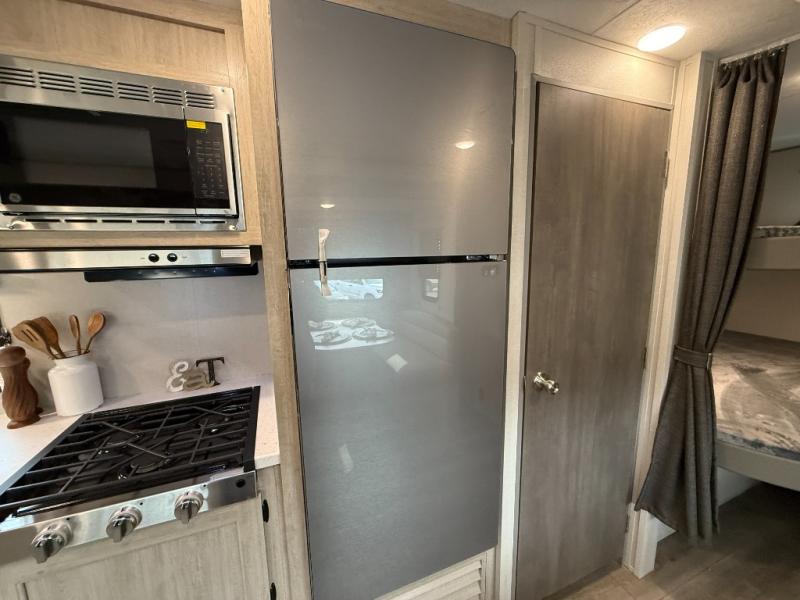This is the perfect mid-size travel trailer for you and your family! The 46" x 74" double-size bunk beds with lower interior storage offer a comfortable sleeping space for the kids and you will have your own private sleeping space with the 60" x 74" queen bed in the front bedroom. Freshen up each morning in the rear corner bathroom with the tub/shower and a mirror to get ready each morning. You can prepare your best home cooked meals with the GE stainless three burner cooktop and GE stainless 10.7 cu. ft. 12V refrigerator, then enjoy them together at the booth dinette. The sofa is near the entertainment center for a relaxing movie night. Don't leave any of your outdoor gear behind either, thanks to the front pass-through storage area and the exterior outside storage area. You could even add the optional outside camper kitchen to grill the catch of the day on the pull out griddle!