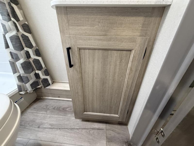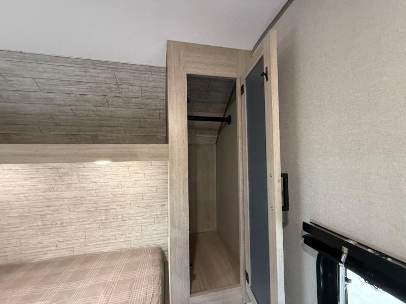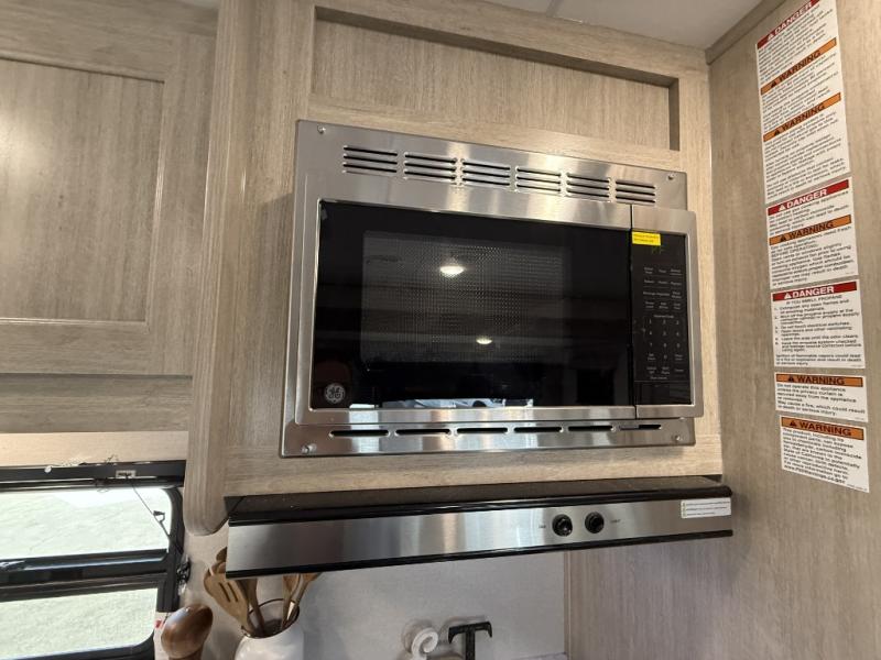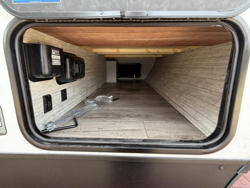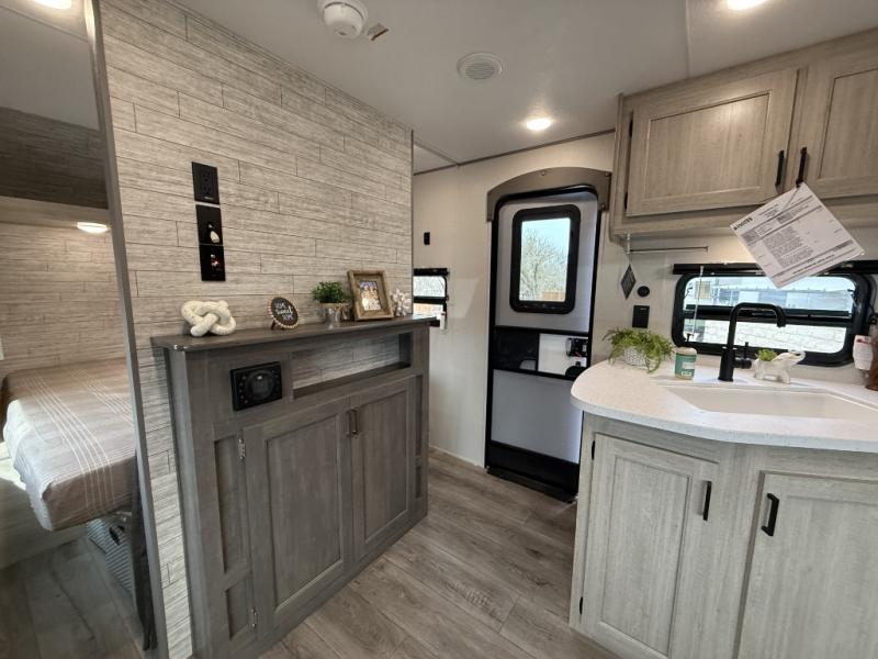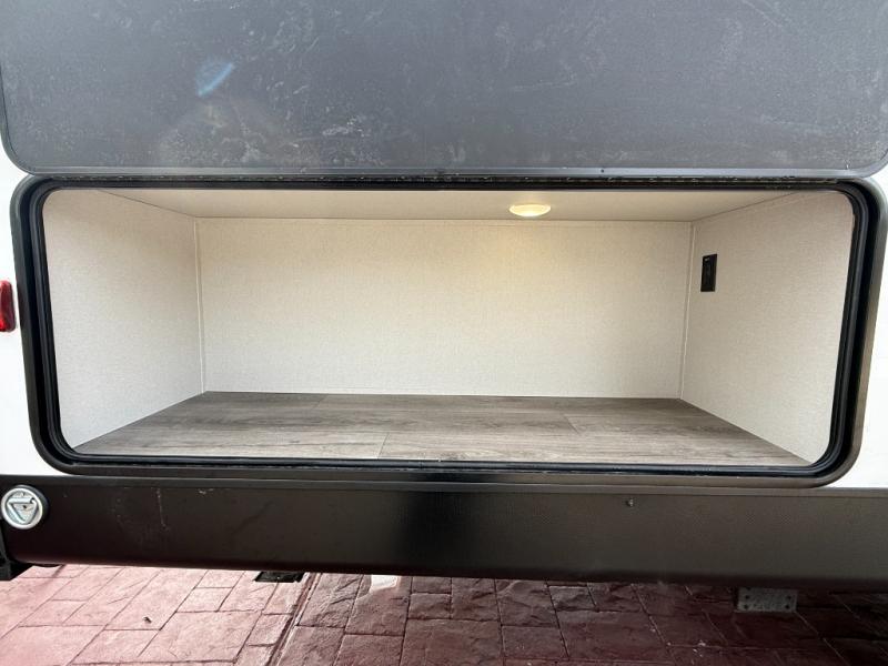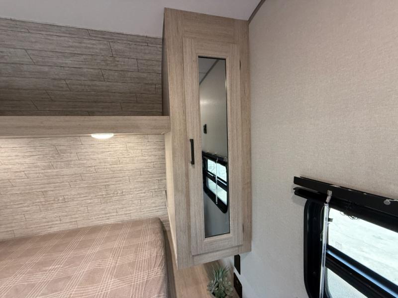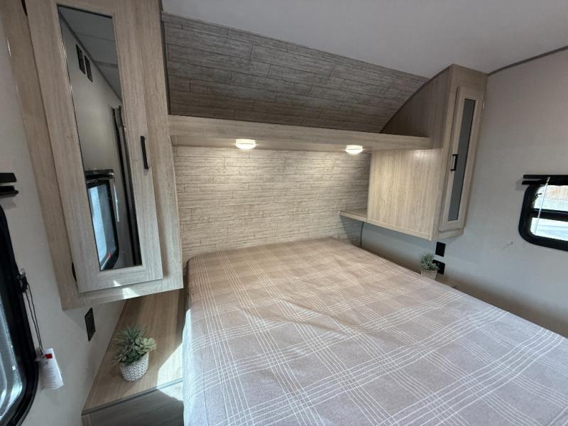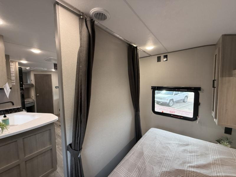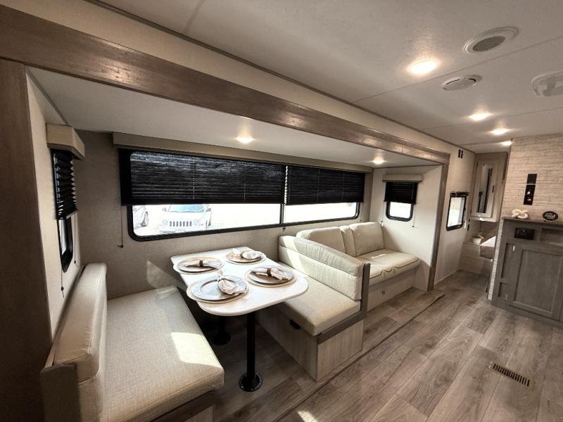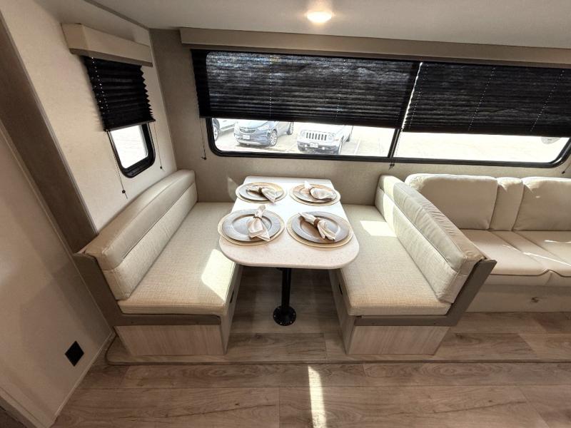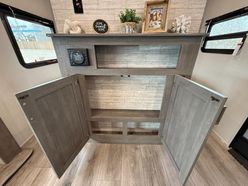 This is the perfect mid-size travel trailer for you and your family! The 46" x 74" double-size bunk beds with lower interior storage offer a comfortable sleeping space for the kids and you will have your own private sleeping space with the 60" x 74" queen bed in the front bedroom. Freshen up each morning in the rear corner bathroom with the tub/shower and a mirror to get ready each morning. You can prepare your best home cooked meals with the GE stainless three burner cooktop and GE stainless 10.7 cu. ft. 12V refrigerator, then enjoy them together at the booth dinette. The sofa is near the entertainment center for a relaxing movie night. Don't leave any of your outdoor gear behind either, thanks to the front pass-through storage area and the exterior outside storage area. You could even add the optional outside camper kitchen to grill the catch of the day on the pull out griddle!
