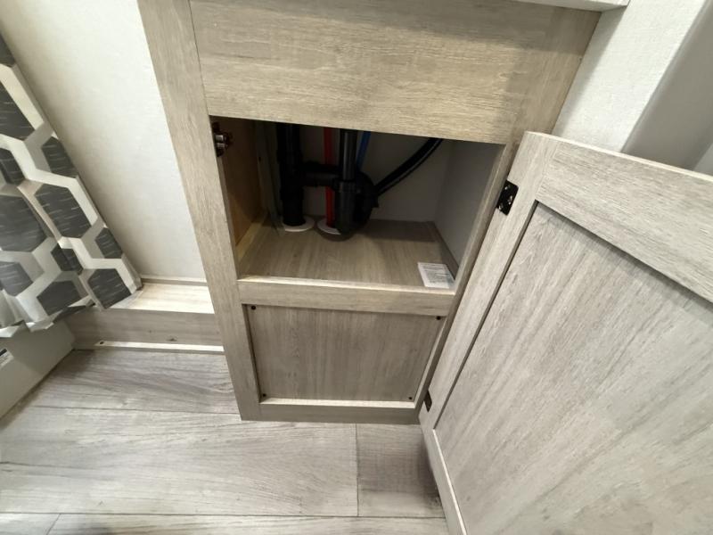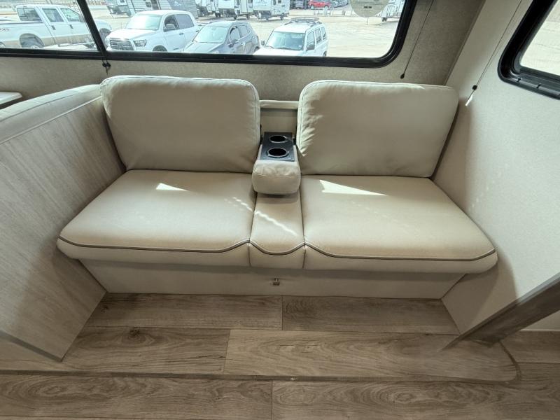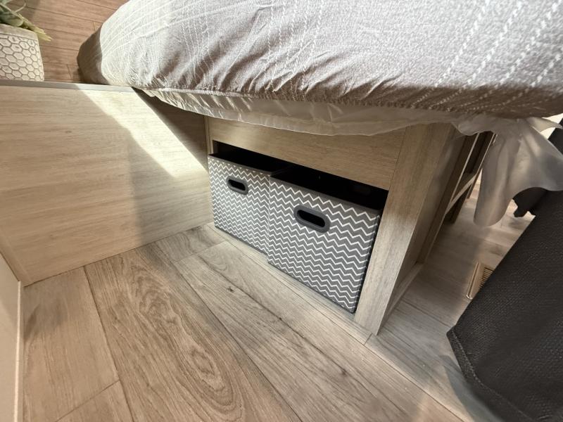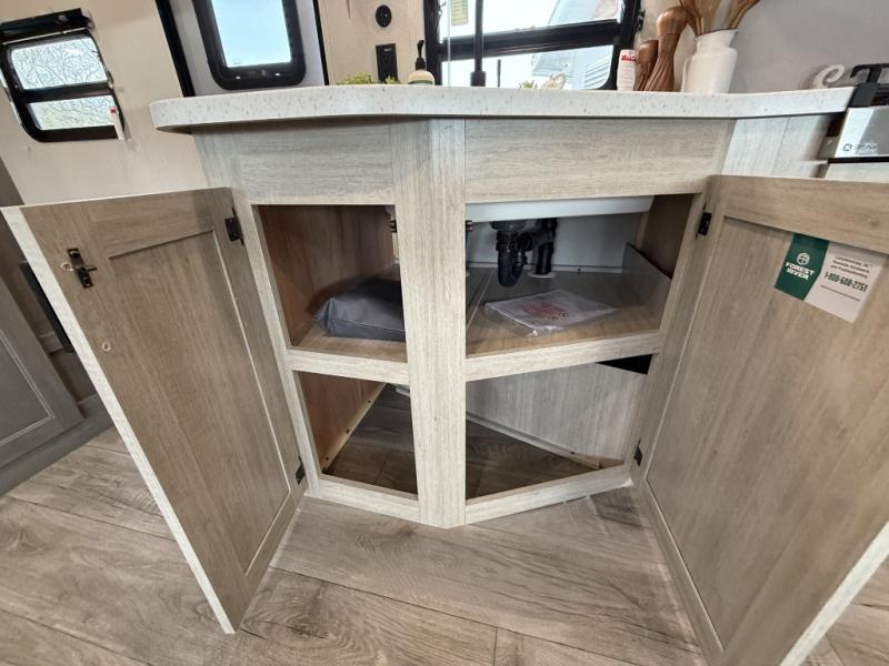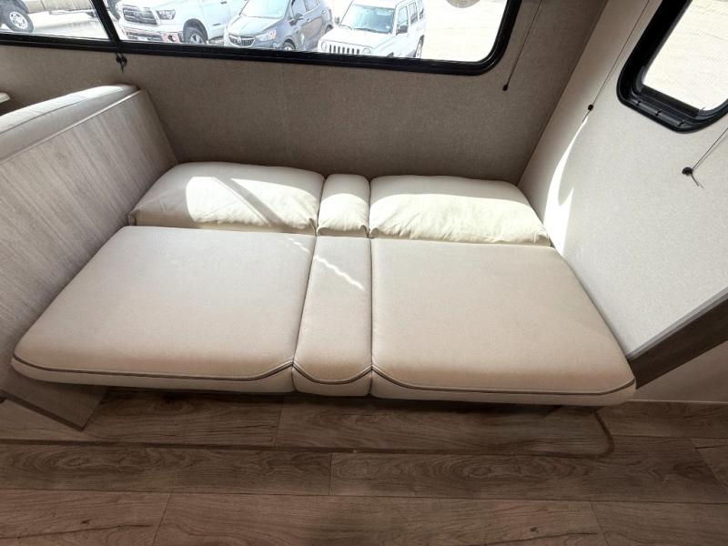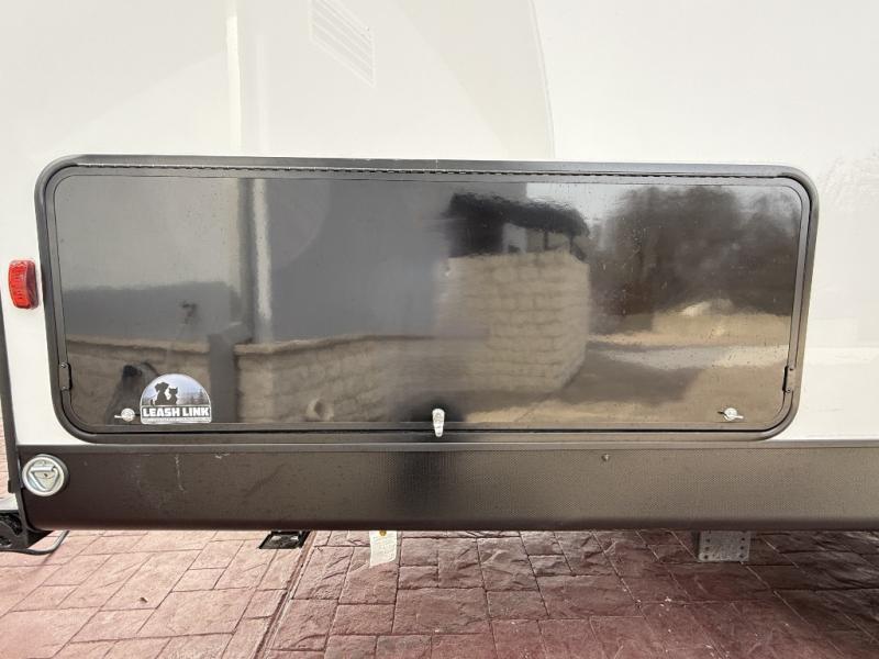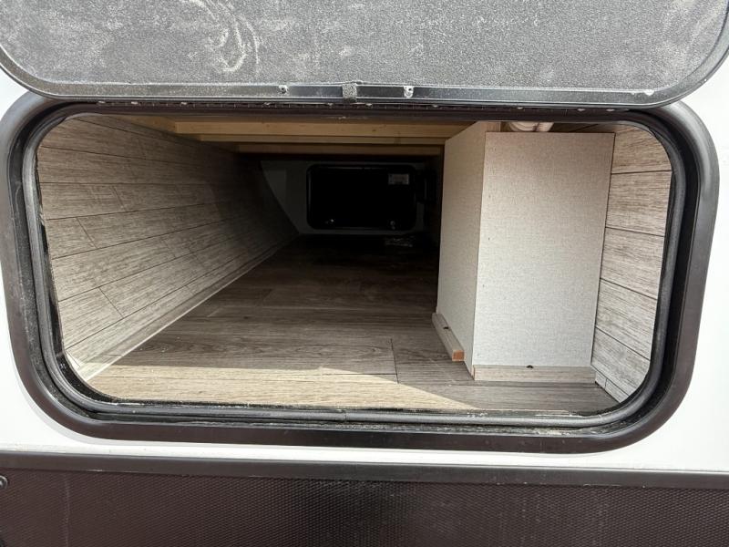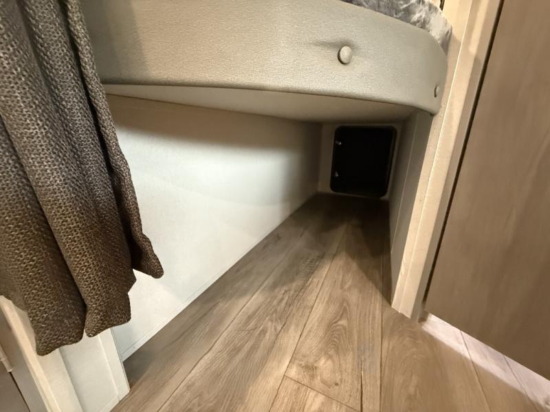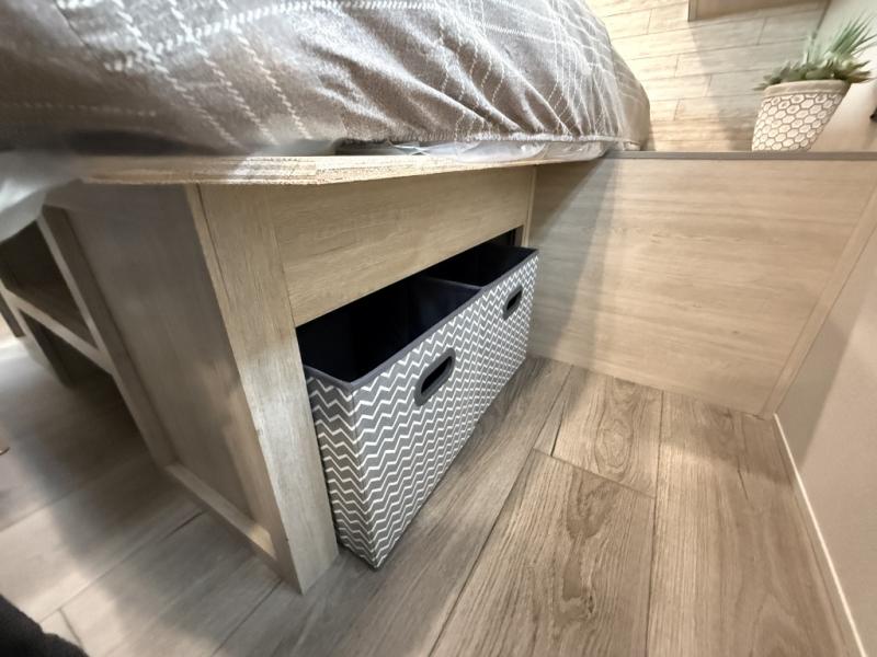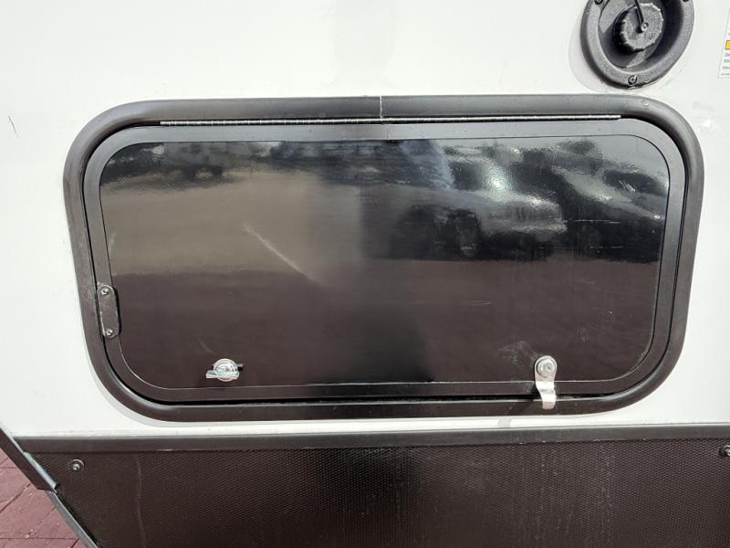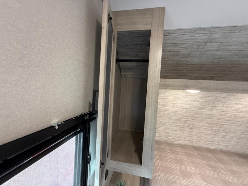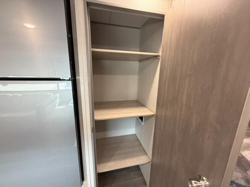 This is the perfect mid-size travel trailer for you and your family! The 46" x 74" double-size bunk beds with lower interior storage offer a comfortable sleeping space for the kids and you will have your own private sleeping space with the 60" x 74" queen bed in the front bedroom. Freshen up each morning in the rear corner bathroom with the tub/shower and a mirror to get ready each morning. You can prepare your best home cooked meals with the GE stainless three burner cooktop and GE stainless 10.7 cu. ft. 12V refrigerator, then enjoy them together at the booth dinette. The sofa is near the entertainment center for a relaxing movie night. Don't leave any of your outdoor gear behind either, thanks to the front pass-through storage area and the exterior outside storage area. You could even add the optional outside camper kitchen to grill the catch of the day on the pull out griddle!