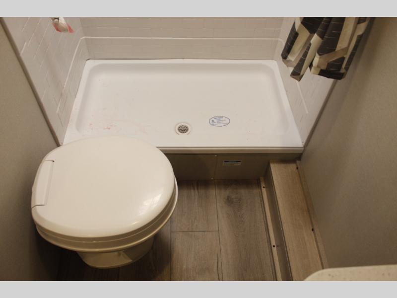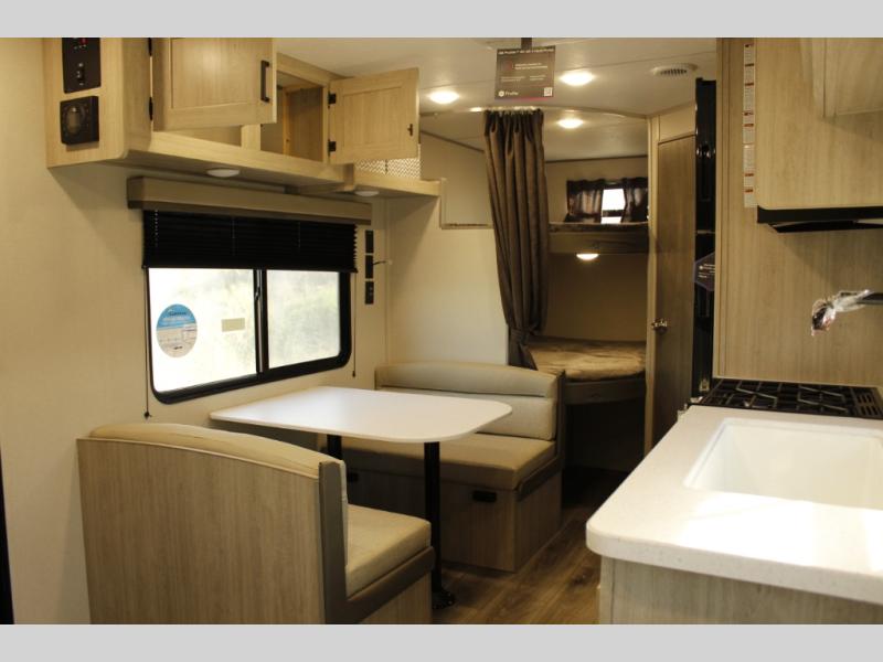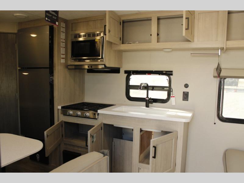 This is the perfect mid-size travel trailer for you and your family! The 46" x 74" double-size bunk beds with lower interior storage offer a comfortable sleeping space for the kids and you will have your own private sleeping space with the 60" x 74" queen bed in the front bedroom. Freshen up each morning in the rear corner bathroom with the tub/shower and a mirror to get ready each morning. You can prepare your best home cooked meals with the GE stainless three burner cooktop and GE stainless 10.7 cu. ft. 12V refrigerator, then enjoy them together at the booth dinette. The sofa is near the entertainment center for a relaxing movie night. Don't leave any of your outdoor gear behind either, thanks to the front pass-through storage area and the exterior outside storage area. You could even add the optional outside camper kitchen to grill the catch of the day on the pull out griddle!