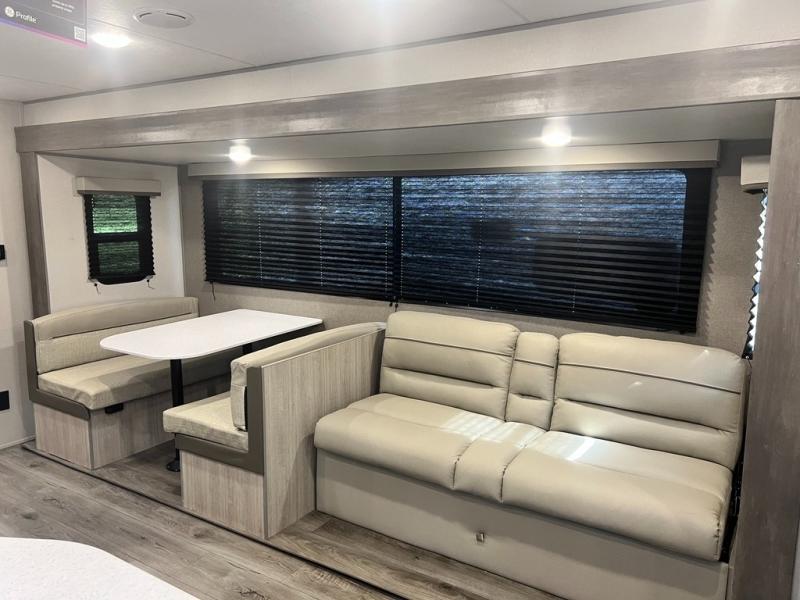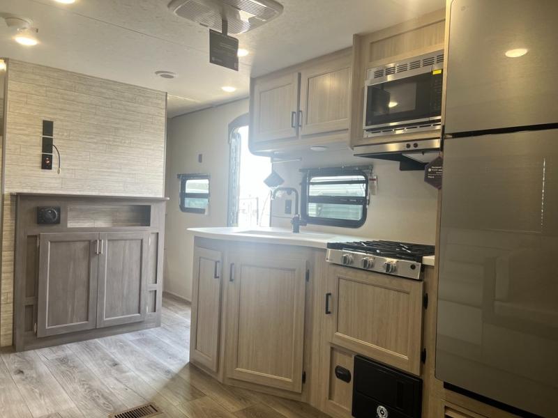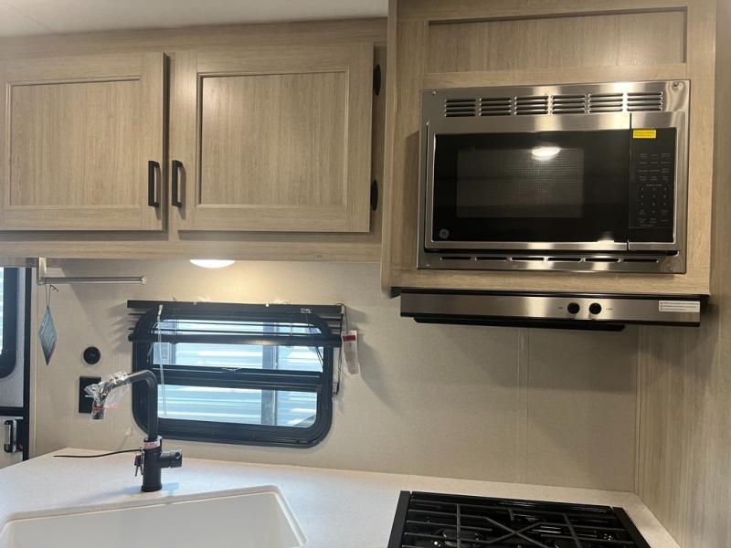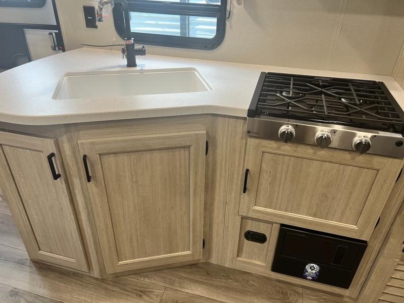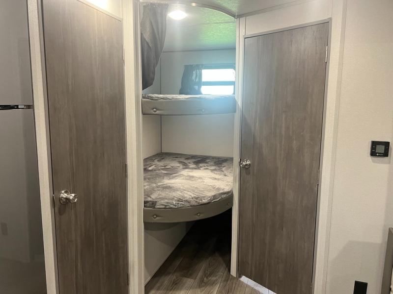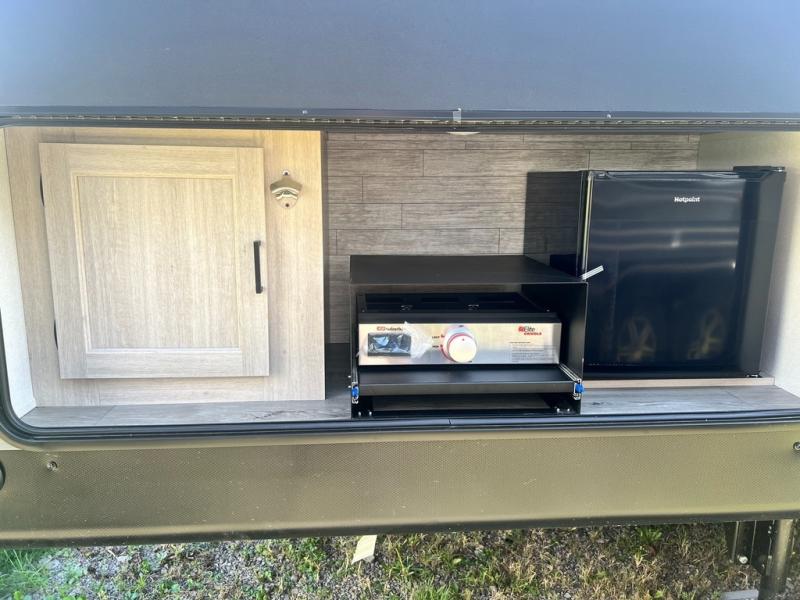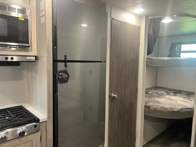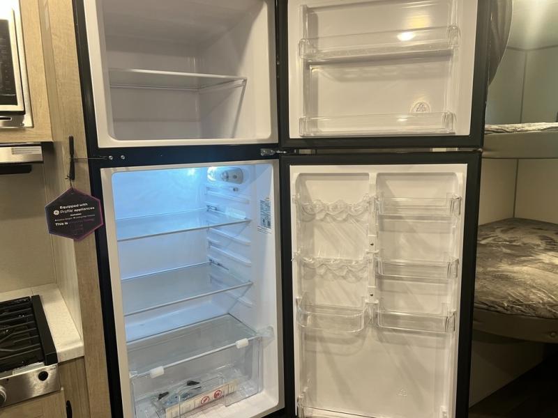 This is the perfect mid-size travel trailer for you and your family! The 46" x 74" double-size bunk beds with lower interior storage offer a comfortable sleeping space for the kids and you will have your own private sleeping space with the 60" x 74" queen bed in the front bedroom. Freshen up each morning in the rear corner bathroom with the tub/shower and a mirror to get ready each morning. You can prepare your best home cooked meals with the GE stainless three burner cooktop and GE stainless 10.7 cu. ft. 12V refrigerator, then enjoy them together at the booth dinette. The sofa is near the entertainment center for a relaxing movie night. Don't leave any of your outdoor gear behind either, thanks to the front pass-through storage area and the exterior outside storage area. You could even add the optional outside camper kitchen to grill the catch of the day on the pull out griddle!
