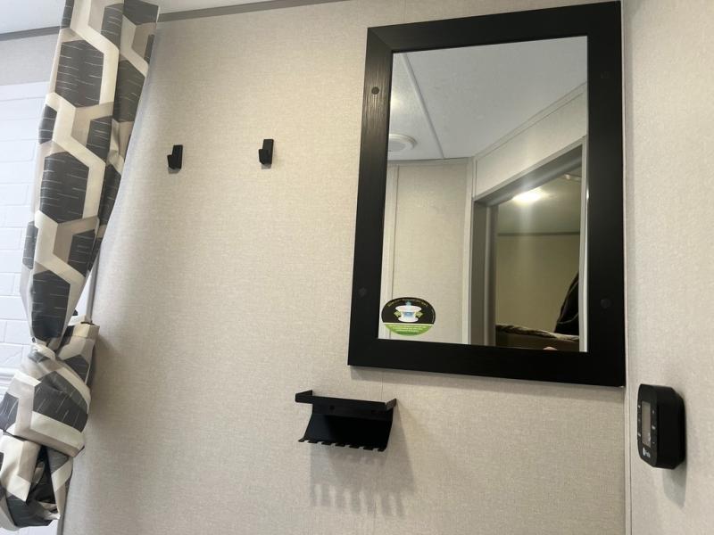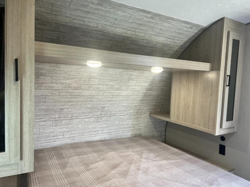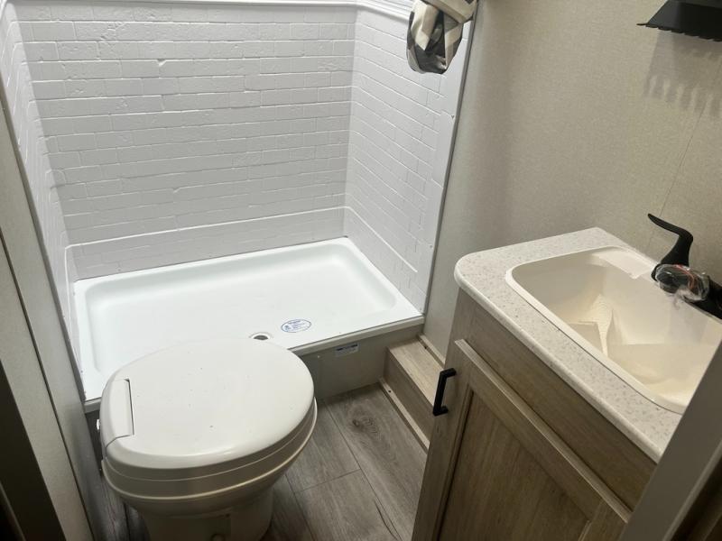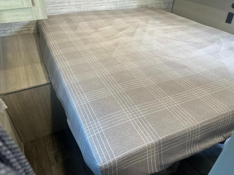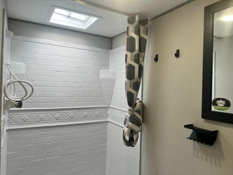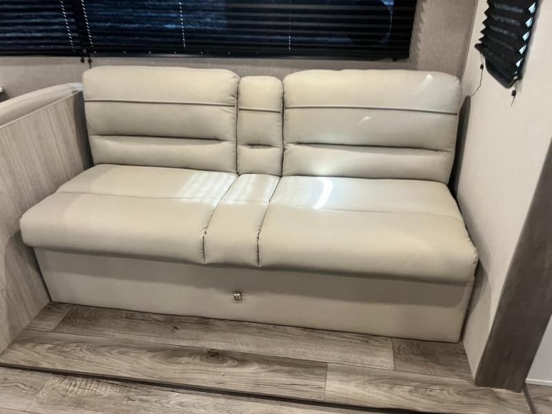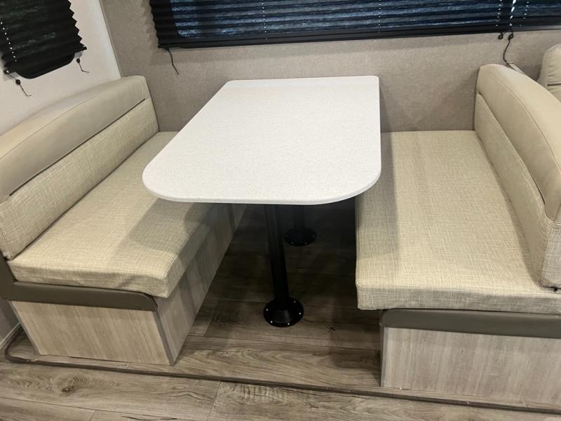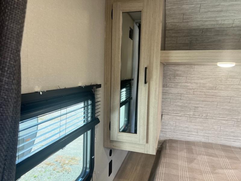 This is the perfect mid-size travel trailer for you and your family! The 46" x 74" double-size bunk beds with lower interior storage offer a comfortable sleeping space for the kids and you will have your own private sleeping space with the 60" x 74" queen bed in the front bedroom. Freshen up each morning in the rear corner bathroom with the tub/shower and a mirror to get ready each morning. You can prepare your best home cooked meals with the GE stainless three burner cooktop and GE stainless 10.7 cu. ft. 12V refrigerator, then enjoy them together at the booth dinette. The sofa is near the entertainment center for a relaxing movie night. Don't leave any of your outdoor gear behind either, thanks to the front pass-through storage area and the exterior outside storage area. You could even add the optional outside camper kitchen to grill the catch of the day on the pull out griddle!