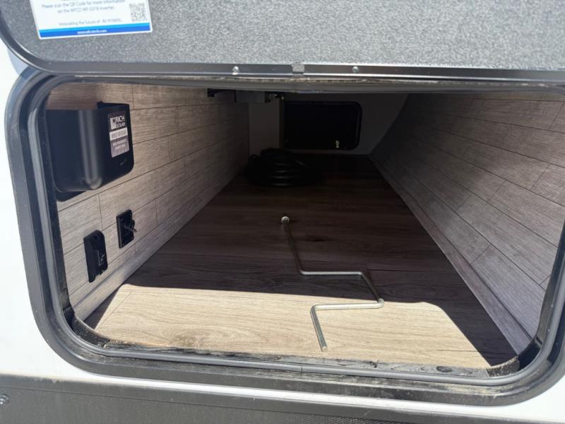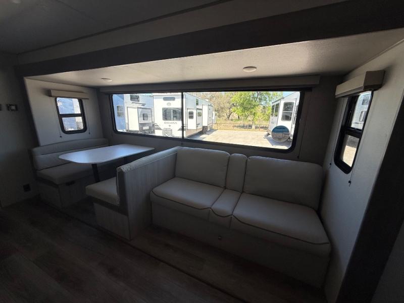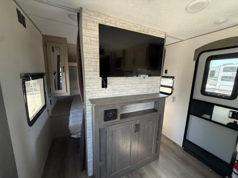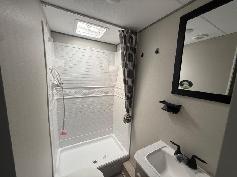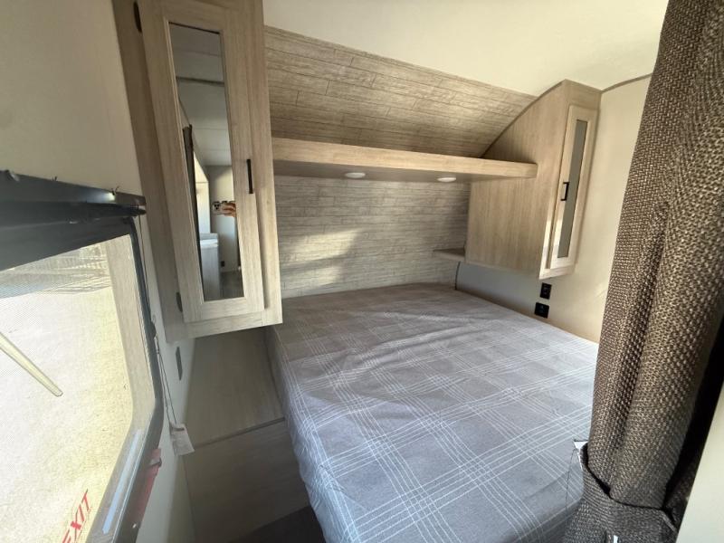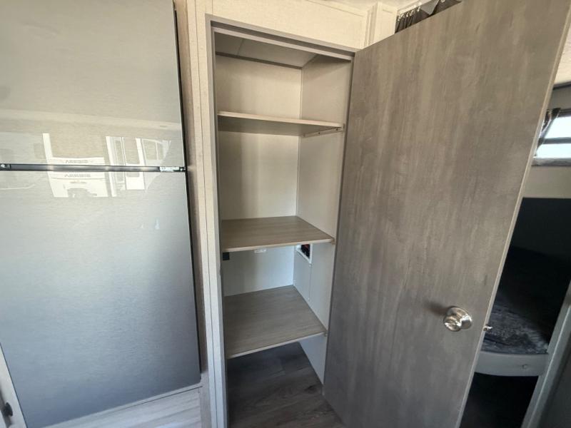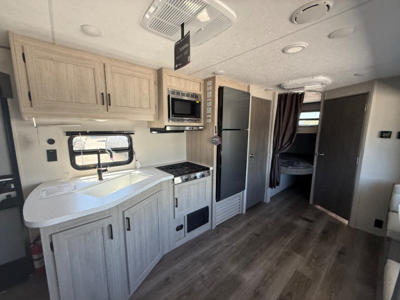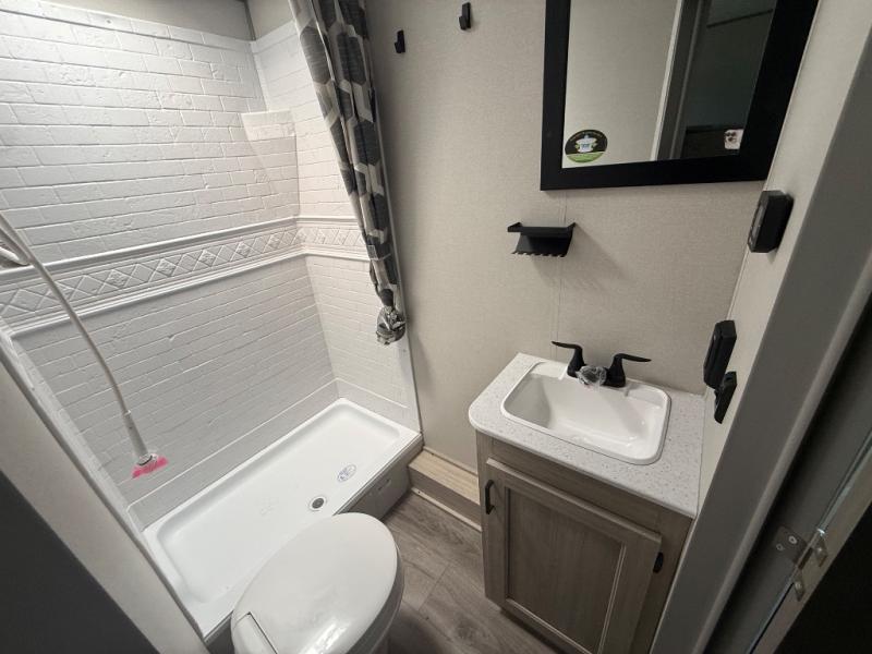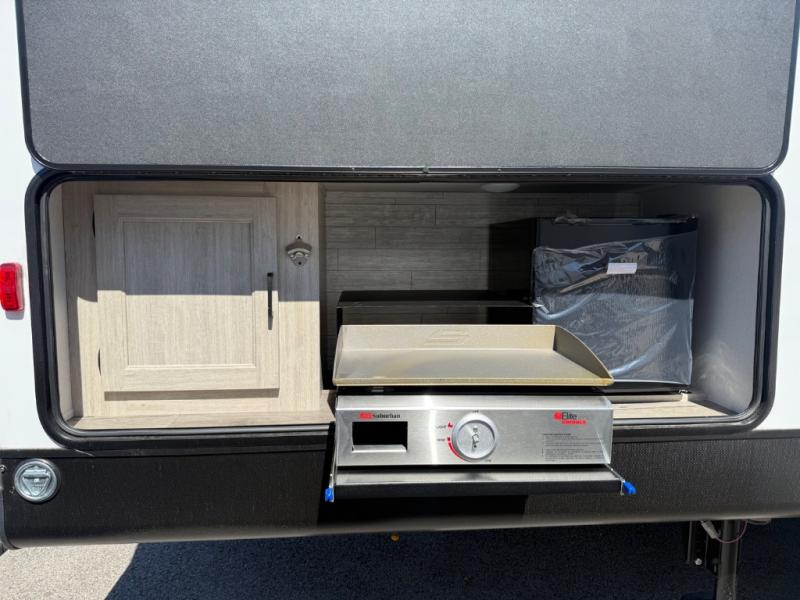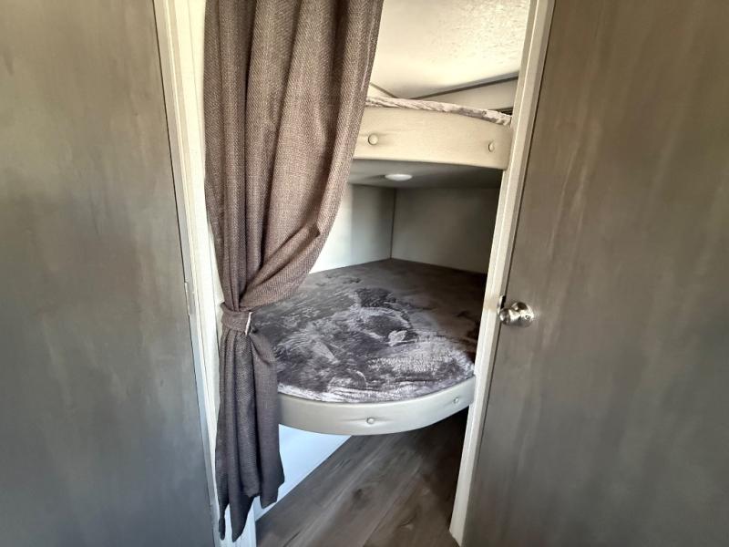 This is the perfect mid-size travel trailer for you and your family! The 46" x 74" double-size bunk beds with lower interior storage offer a comfortable sleeping space for the kids and you will have your own private sleeping space with the 60" x 74" queen bed in the front bedroom. Freshen up each morning in the rear corner bathroom with the tub/shower and a mirror to get ready each morning. You can prepare your best home cooked meals with the GE stainless three burner cooktop and GE stainless 10.7 cu. ft. 12V refrigerator, then enjoy them together at the booth dinette. The sofa is near the entertainment center for a relaxing movie night. Don't leave any of your outdoor gear behind either, thanks to the front pass-through storage area and the exterior outside storage area. You could even add the optional outside camper kitchen to grill the catch of the day on the pull out griddle!