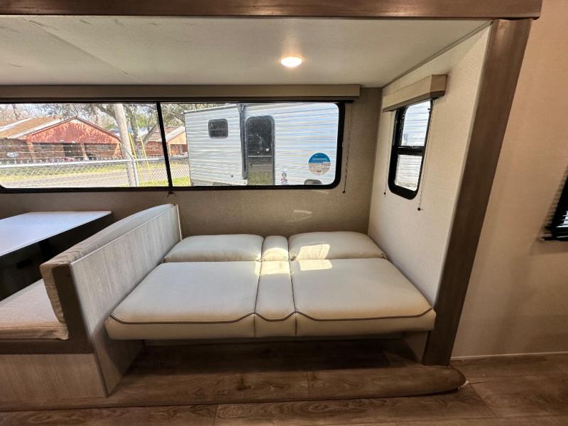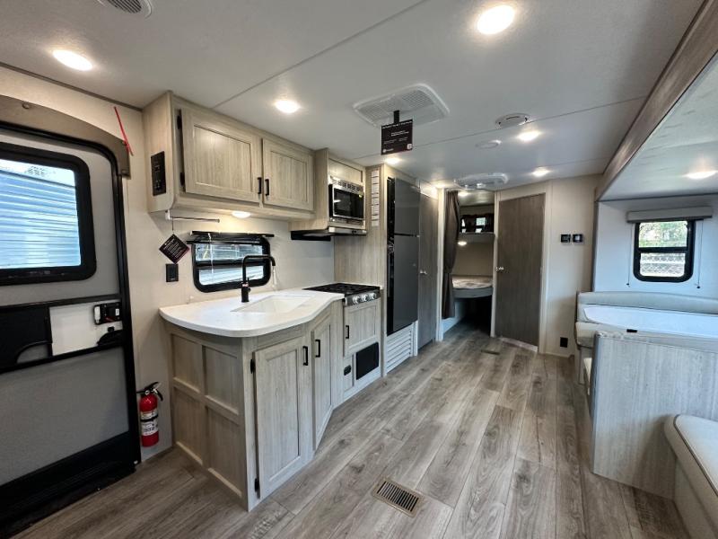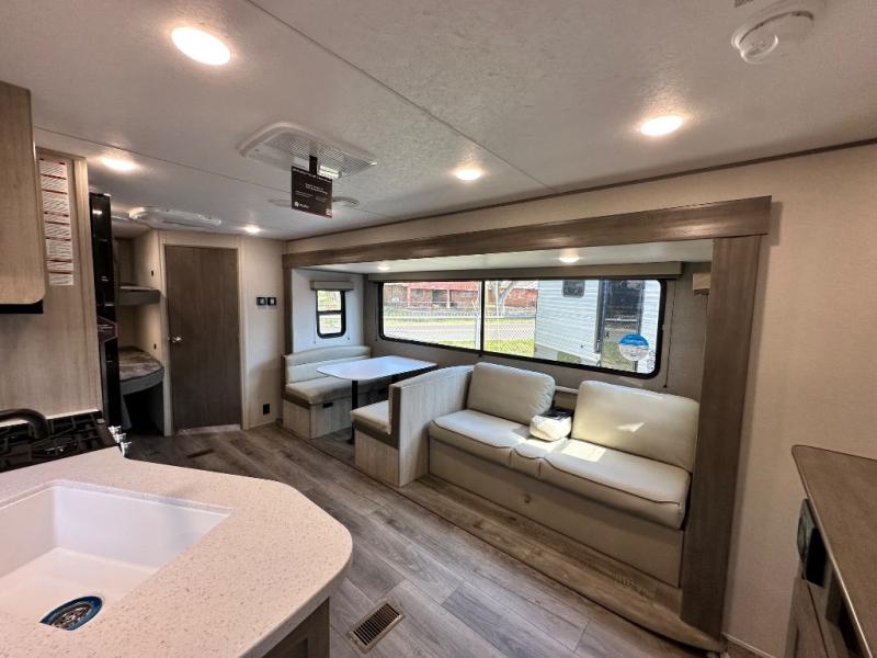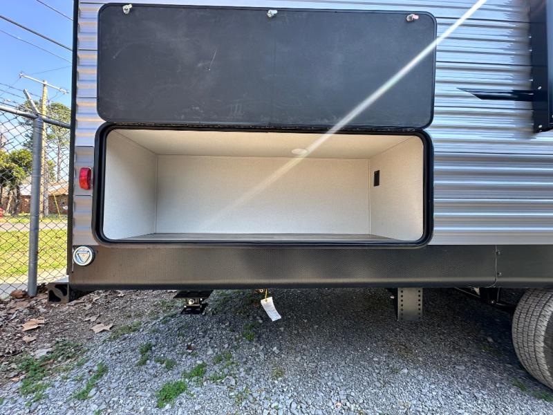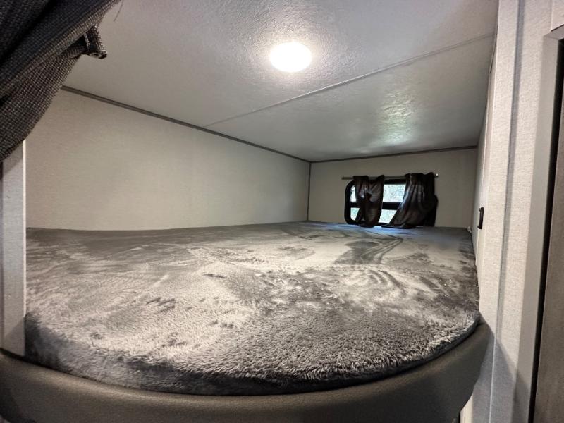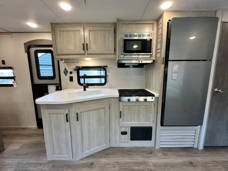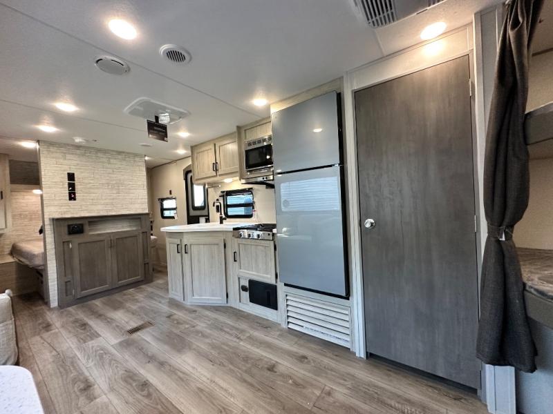 This is the perfect mid-size travel trailer for you and your family! The 46" x 74" double-size bunk beds with lower interior storage offer a comfortable sleeping space for the kids and you will have your own private sleeping space with the 60" x 74" queen bed in the front bedroom. Freshen up each morning in the rear corner bathroom with the tub/shower and a mirror to get ready each morning. You can prepare your best home cooked meals with the GE stainless three burner cooktop and GE stainless 10.7 cu. ft. 12V refrigerator, then enjoy them together at the booth dinette. The sofa is near the entertainment center for a relaxing movie night. Don't leave any of your outdoor gear behind either, thanks to the front pass-through storage area and the exterior outside storage area. You could even add the optional outside camper kitchen to grill the catch of the day on the pull out griddle!