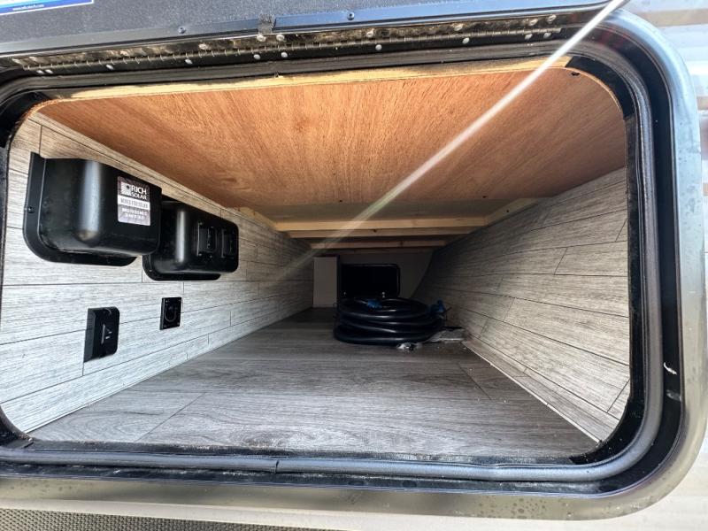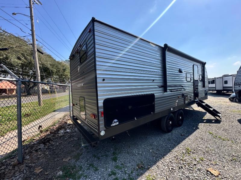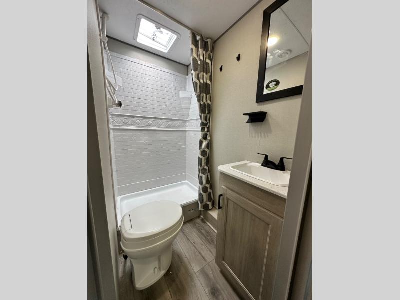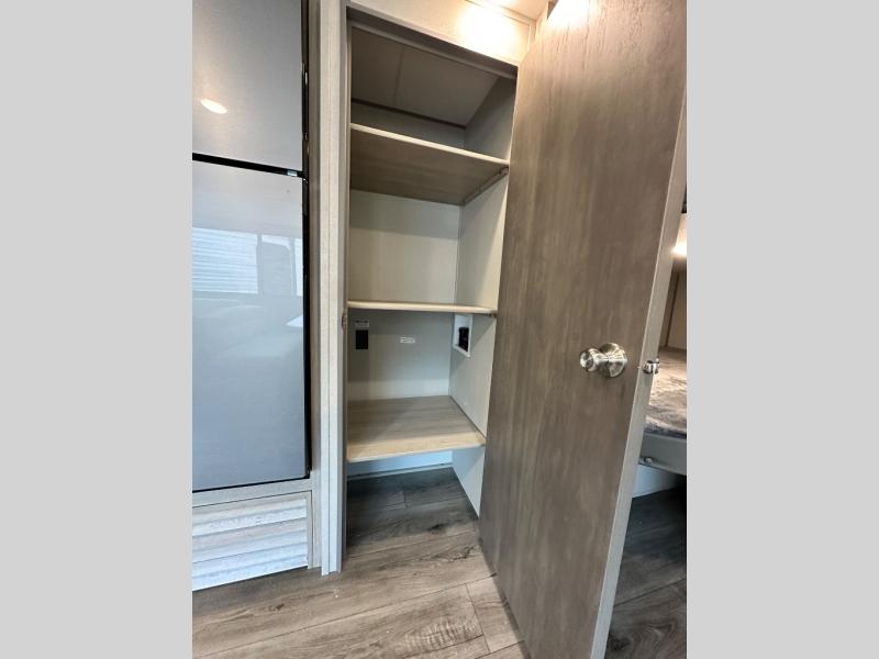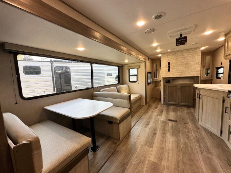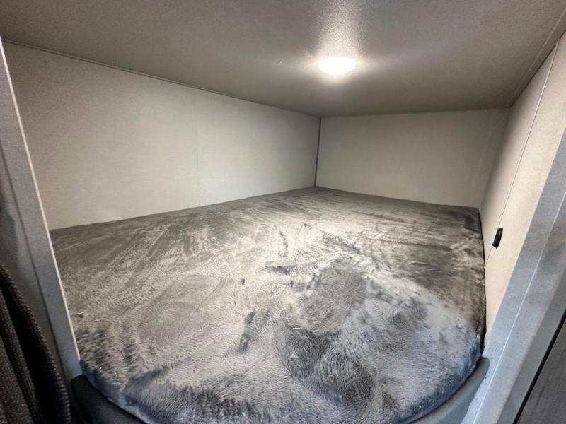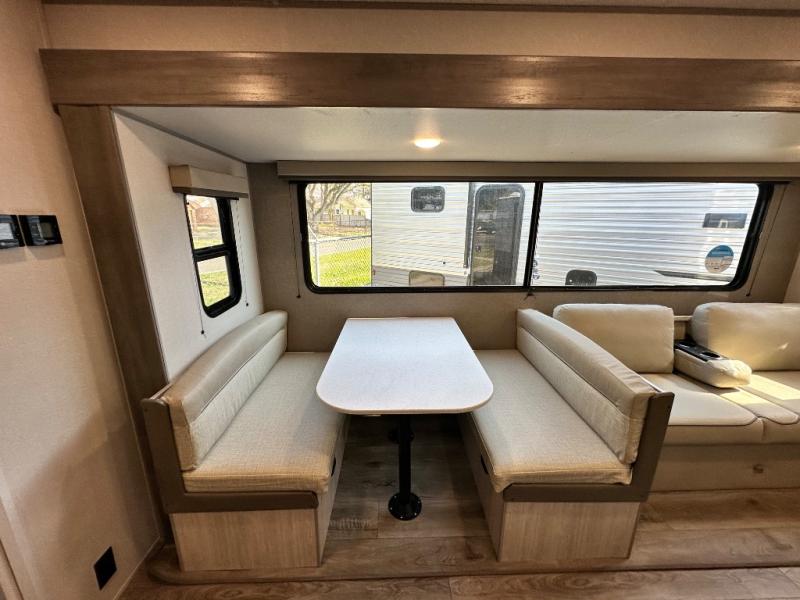 This is the perfect mid-size travel trailer for you and your family! The 46" x 74" double-size bunk beds with lower interior storage offer a comfortable sleeping space for the kids and you will have your own private sleeping space with the 60" x 74" queen bed in the front bedroom. Freshen up each morning in the rear corner bathroom with the tub/shower and a mirror to get ready each morning. You can prepare your best home cooked meals with the GE stainless three burner cooktop and GE stainless 10.7 cu. ft. 12V refrigerator, then enjoy them together at the booth dinette. The sofa is near the entertainment center for a relaxing movie night. Don't leave any of your outdoor gear behind either, thanks to the front pass-through storage area and the exterior outside storage area. You could even add the optional outside camper kitchen to grill the catch of the day on the pull out griddle!