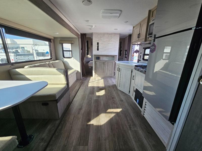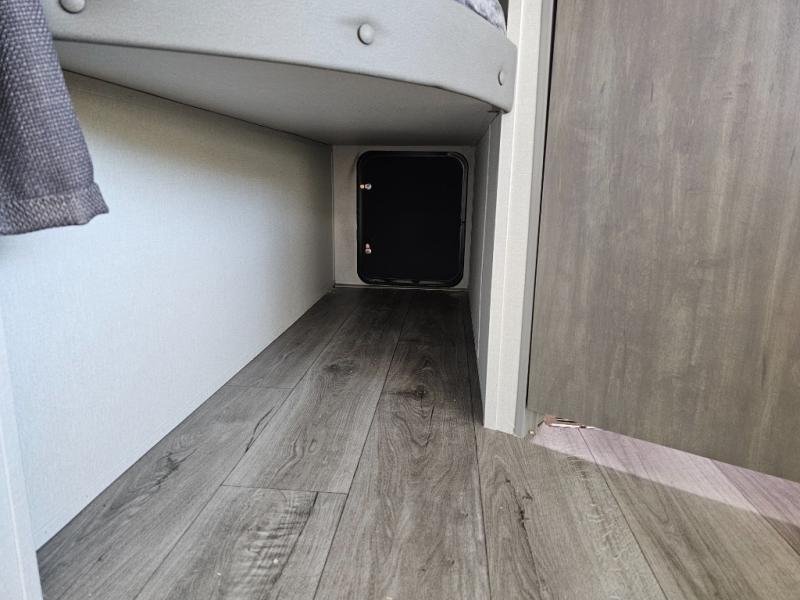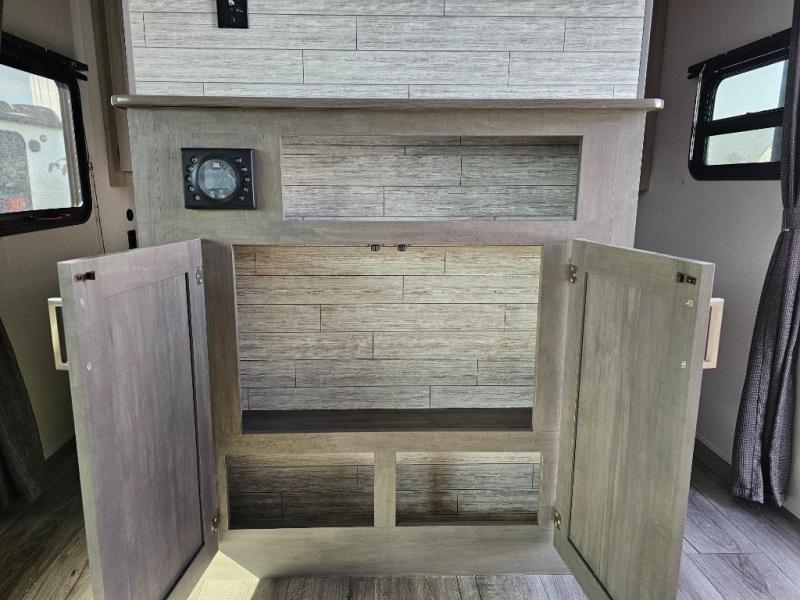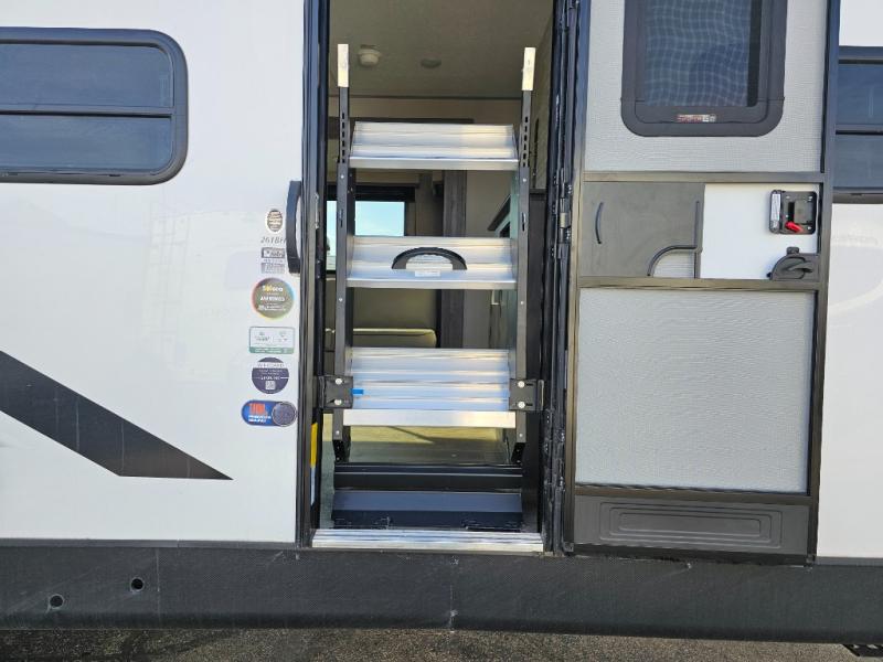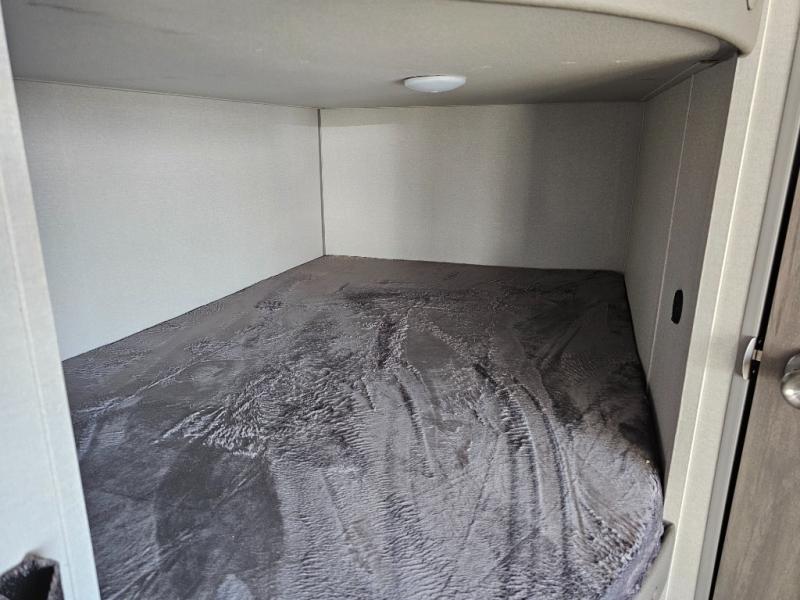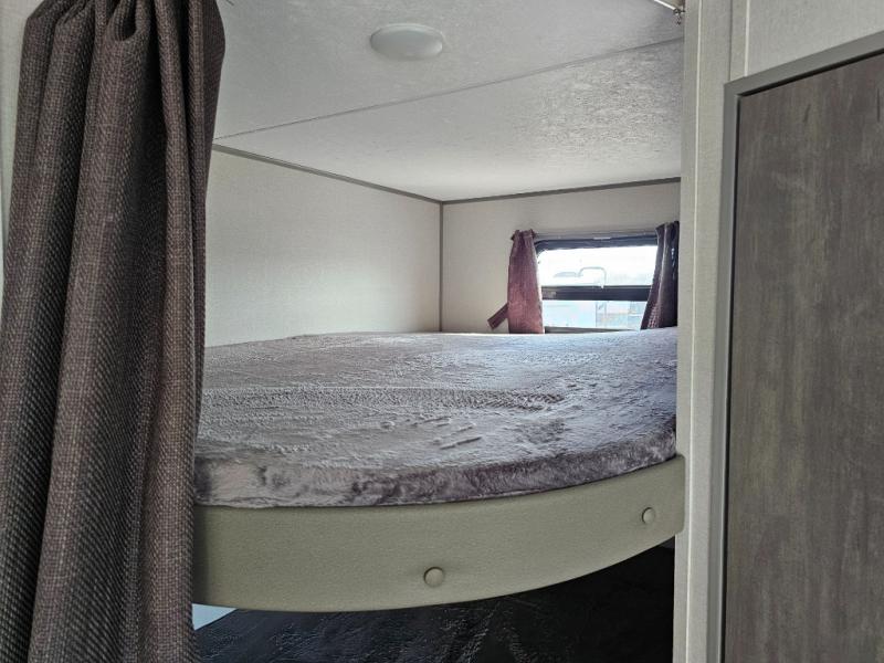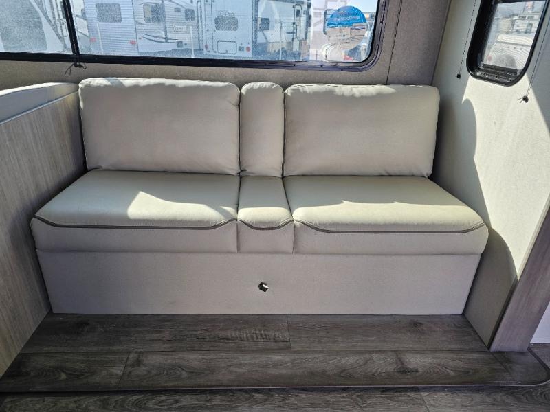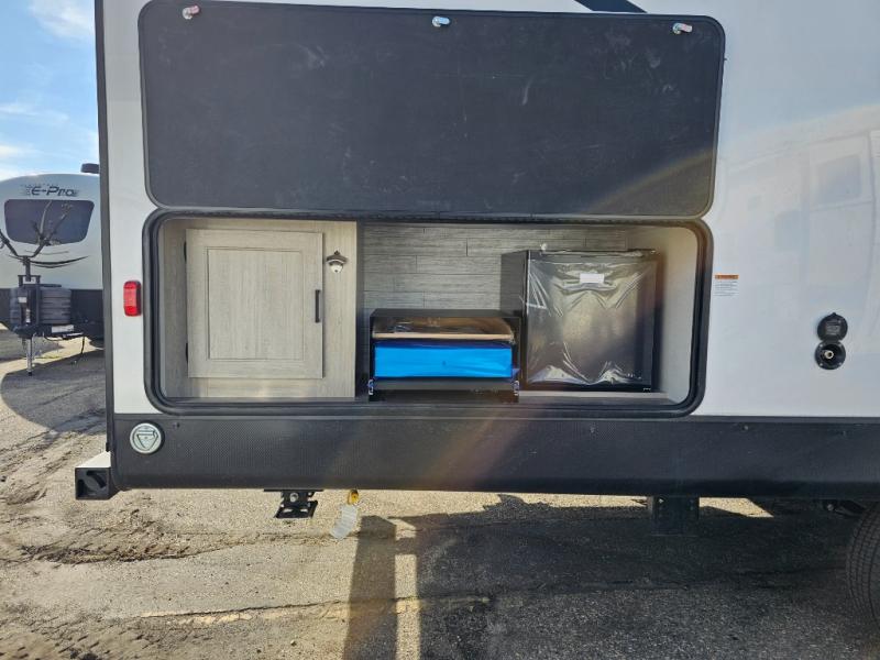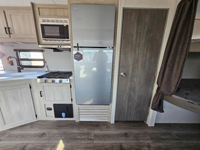 This is the perfect mid-size travel trailer for you and your family! The 46" x 74" double-size bunk beds with lower interior storage offer a comfortable sleeping space for the kids and you will have your own private sleeping space with the 60" x 74" queen bed in the front bedroom. Freshen up each morning in the rear corner bathroom with the tub/shower and a mirror to get ready each morning. You can prepare your best home cooked meals with the GE stainless three burner cooktop and GE stainless 10.7 cu. ft. 12V refrigerator, then enjoy them together at the booth dinette. The sofa is near the entertainment center for a relaxing movie night. Don't leave any of your outdoor gear behind either, thanks to the front pass-through storage area and the exterior outside storage area. You could even add the optional outside camper kitchen to grill the catch of the day on the pull out griddle!