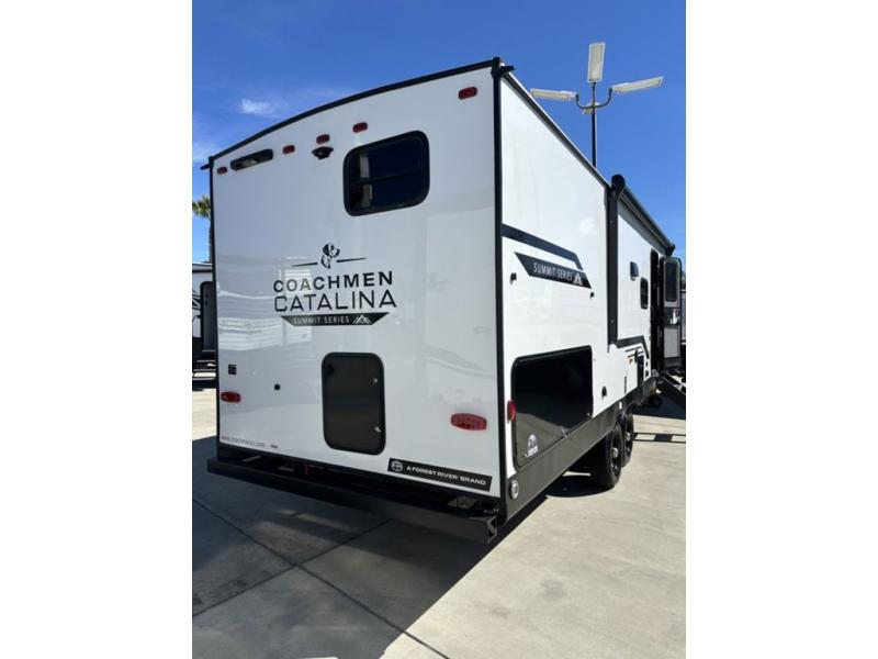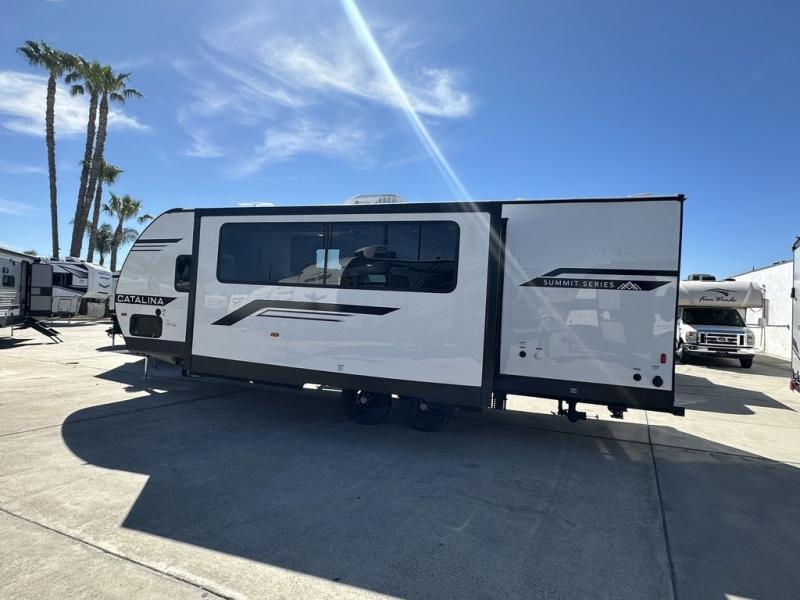 With any Catalina Summit Series 8 by Coachmen you will enjoy an affordable travel trailer packed with at-home comforts! The solid construction includes a Norco electromagnetic powder coated chassis, a seamless Alpha roof membrane, and full length frame outriggers for maximum support and durability. EZ lube axles with leaf spring suspension and self-adjusting brakes provide smooth towing from home to campground, and the premium exterior graphics package is sure to turn heads as you travel down the highway. You will love the features included, such as a JBL Aura Cube media center, magnetic baggage door latches, 4,000 lumen interior touch lighting, and the list goes on!