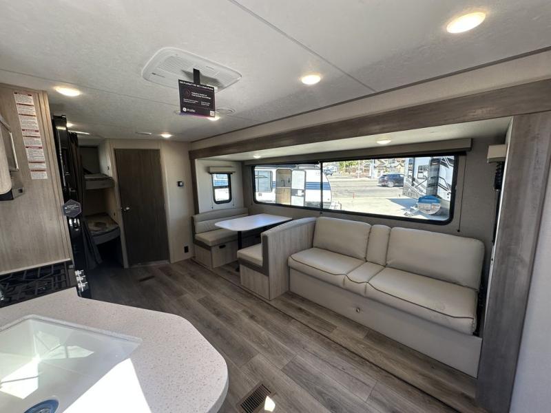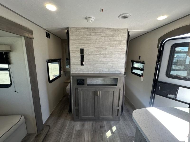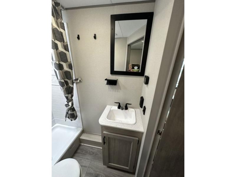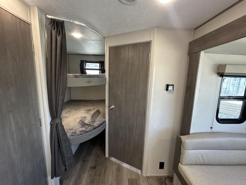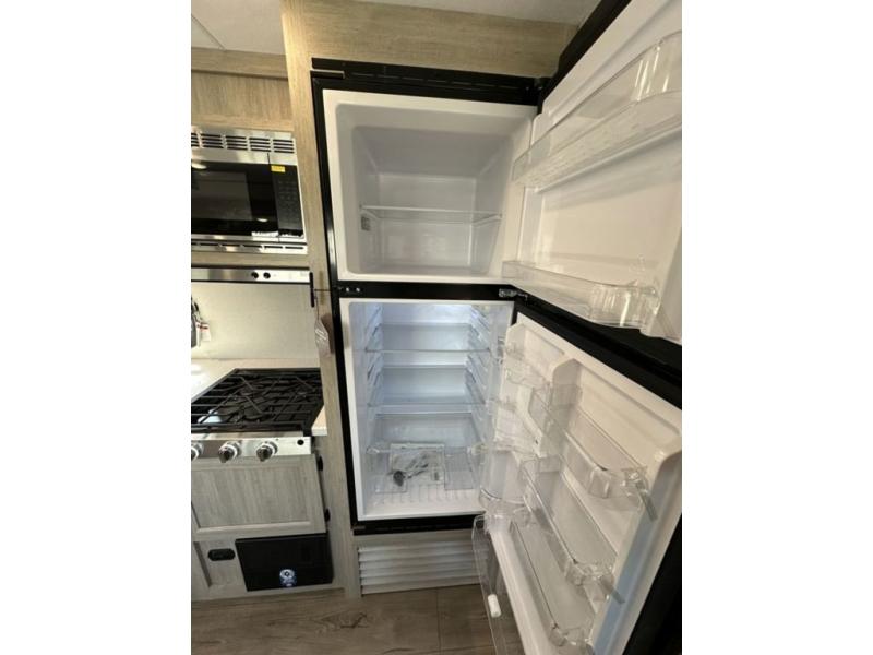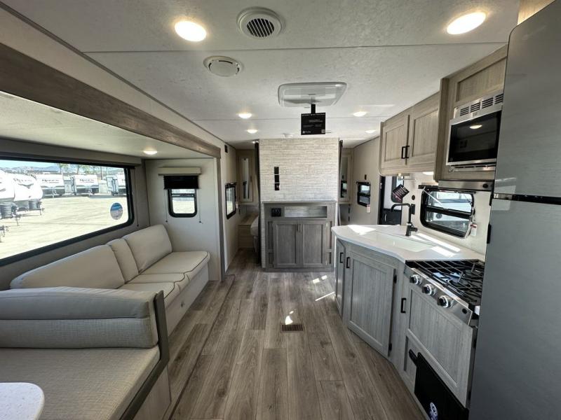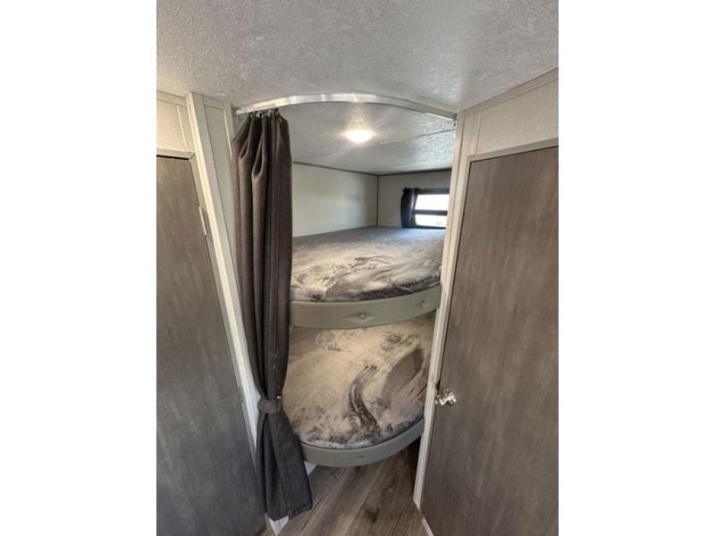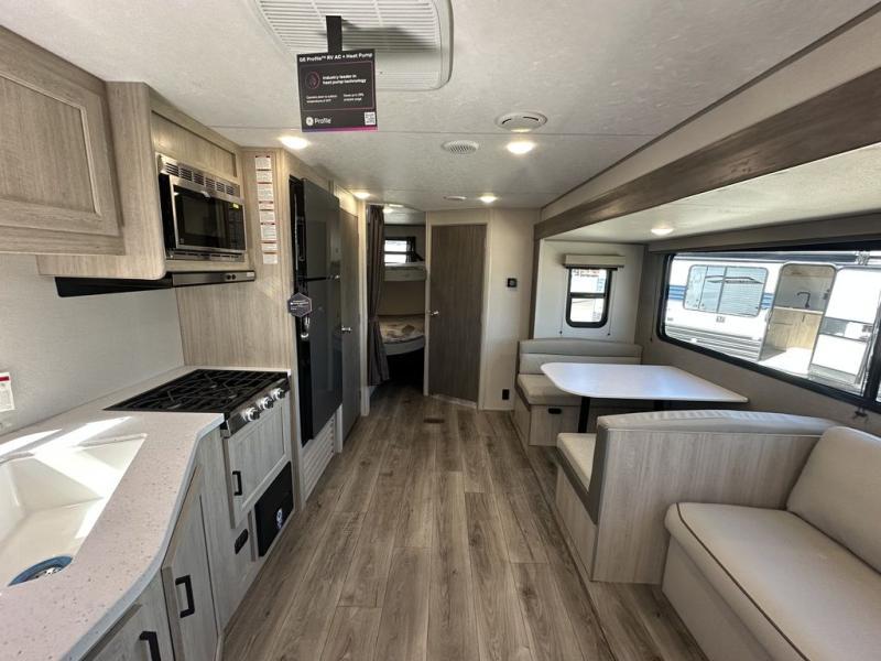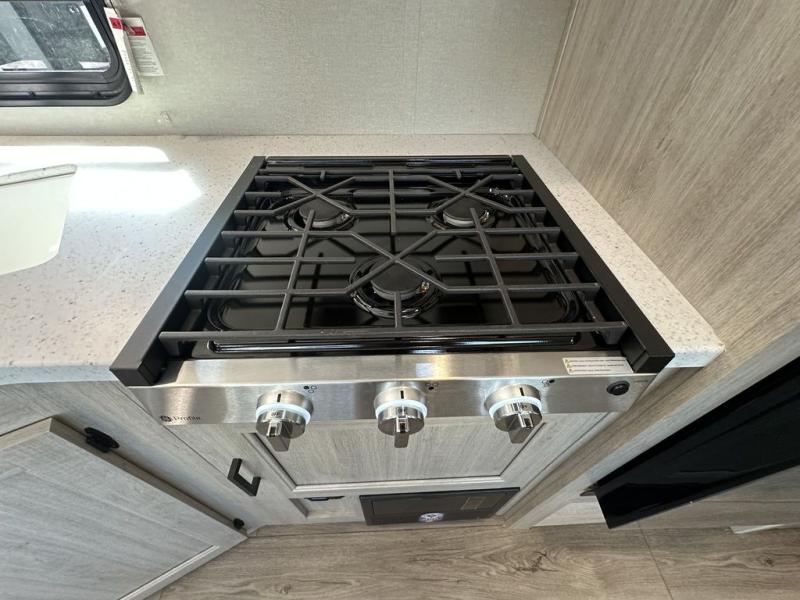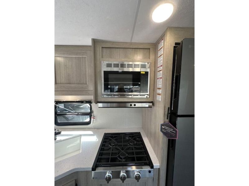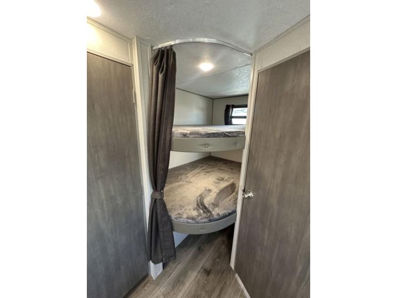 This is the perfect mid-size travel trailer for you and your family! The 46" x 74" double-size bunk beds with lower interior storage offer a comfortable sleeping space for the kids and you will have your own private sleeping space with the 60" x 74" queen bed in the front bedroom. Freshen up each morning in the rear corner bathroom with the tub/shower and a mirror to get ready each morning. You can prepare your best home cooked meals with the GE stainless three burner cooktop and GE stainless 10.7 cu. ft. 12V refrigerator, then enjoy them together at the booth dinette. The sofa is near the entertainment center for a relaxing movie night. Don't leave any of your outdoor gear behind either, thanks to the front pass-through storage area and the exterior outside storage area. You could even add the optional outside camper kitchen to grill the catch of the day on the pull out griddle!
