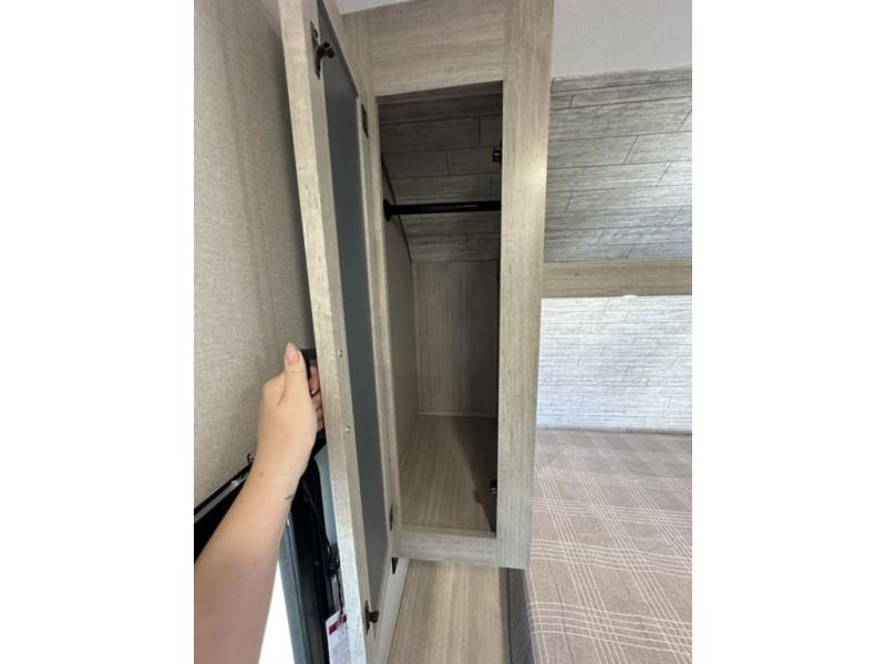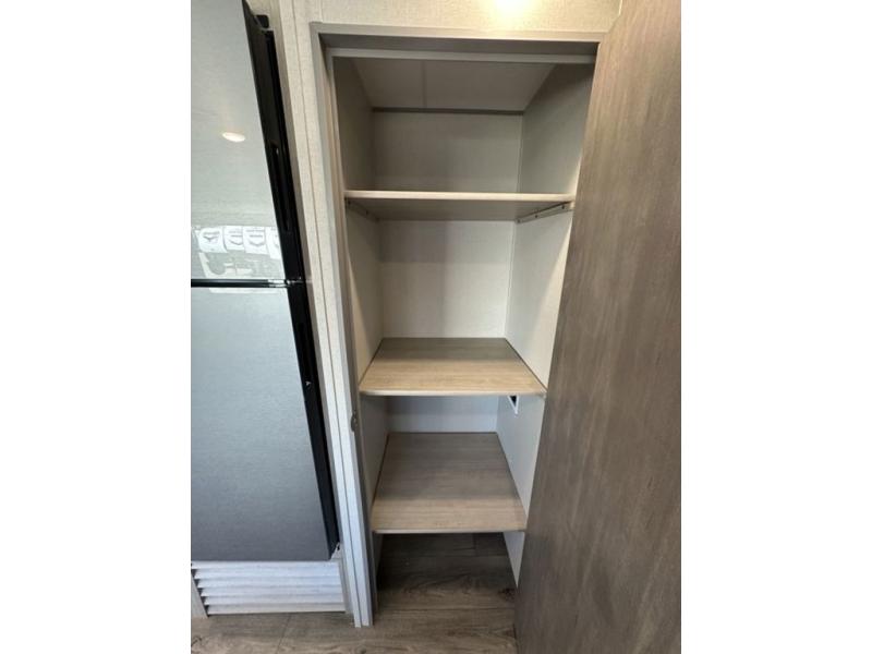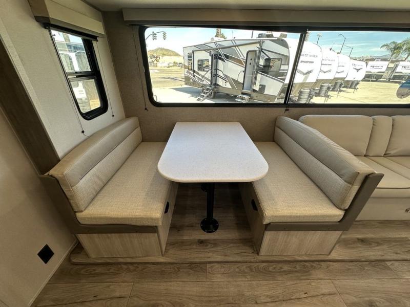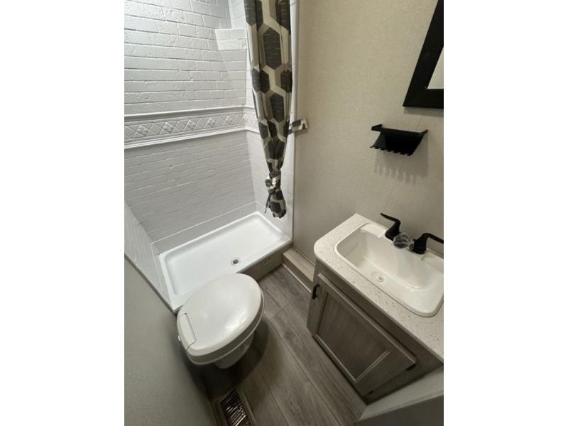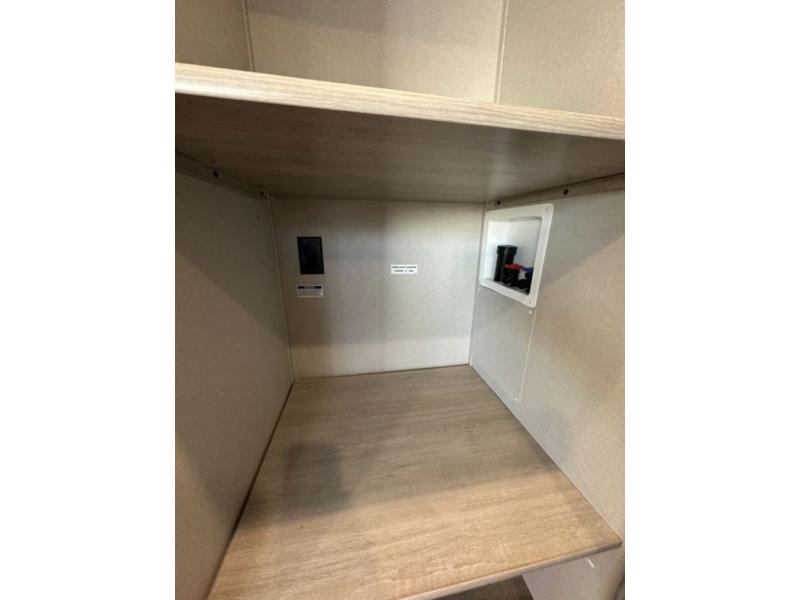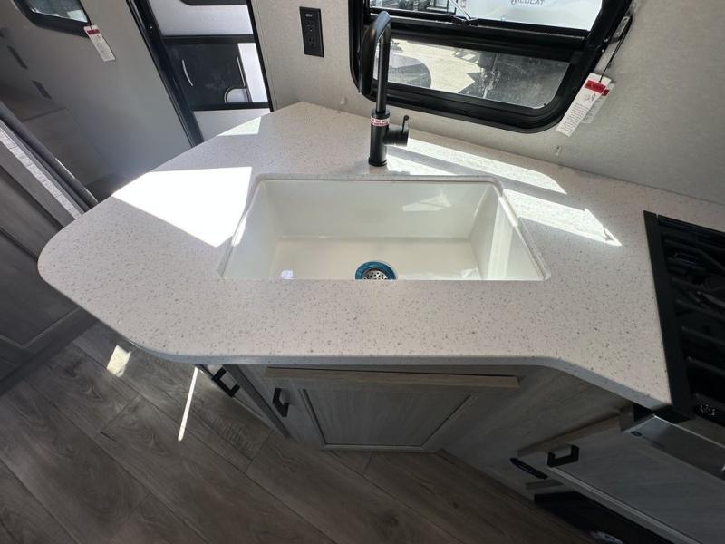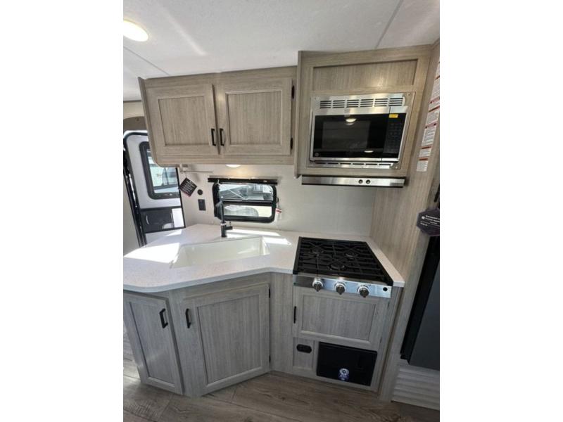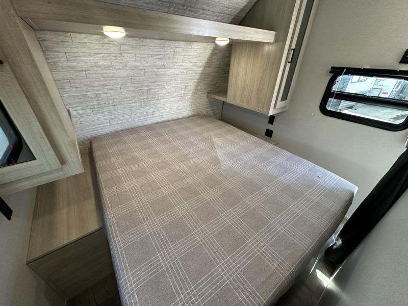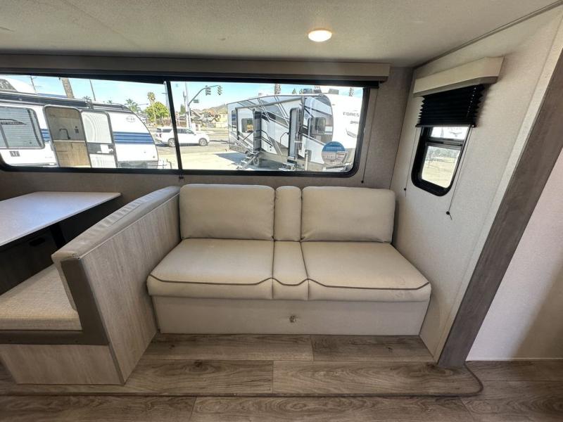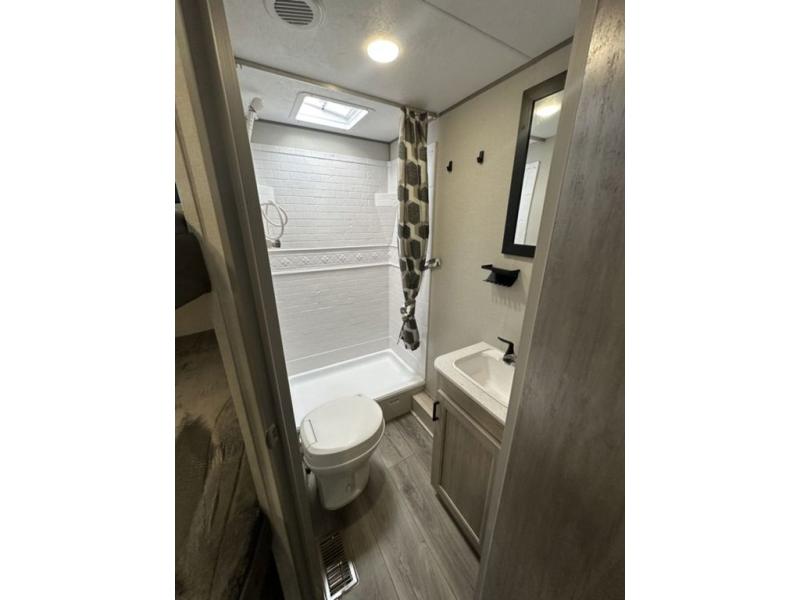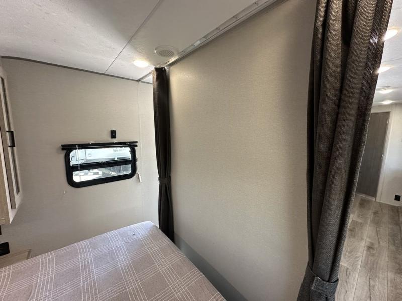 This is the perfect mid-size travel trailer for you and your family! The 46" x 74" double-size bunk beds with lower interior storage offer a comfortable sleeping space for the kids and you will have your own private sleeping space with the 60" x 74" queen bed in the front bedroom. Freshen up each morning in the rear corner bathroom with the tub/shower and a mirror to get ready each morning. You can prepare your best home cooked meals with the GE stainless three burner cooktop and GE stainless 10.7 cu. ft. 12V refrigerator, then enjoy them together at the booth dinette. The sofa is near the entertainment center for a relaxing movie night. Don't leave any of your outdoor gear behind either, thanks to the front pass-through storage area and the exterior outside storage area. You could even add the optional outside camper kitchen to grill the catch of the day on the pull out griddle!