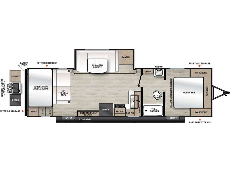 This bunkhouse travel trailer will be perfect for your whole crew! There is a large slide out in the main living area so you can stretch out, and here you'll find the U-shaped dinette and spacious pantry for snacks! The double-size bunks include steps leading up to them plus a wardrobe nearby for your guests' clothes. This model includes a walk-through bath with a tub/shower that will make bath time for little ones easier than ever, and you'll love having your own bedroom up front. A queen bed comes standard, along with dual wardrobes, plus one of the dual entry doors for convenience. The interior kitchen includes a three burner cooktop and a microwave oven, and the outdoor camper kitchen includes a pull-out griddle, a refrigerator, and a cabinet for storage!