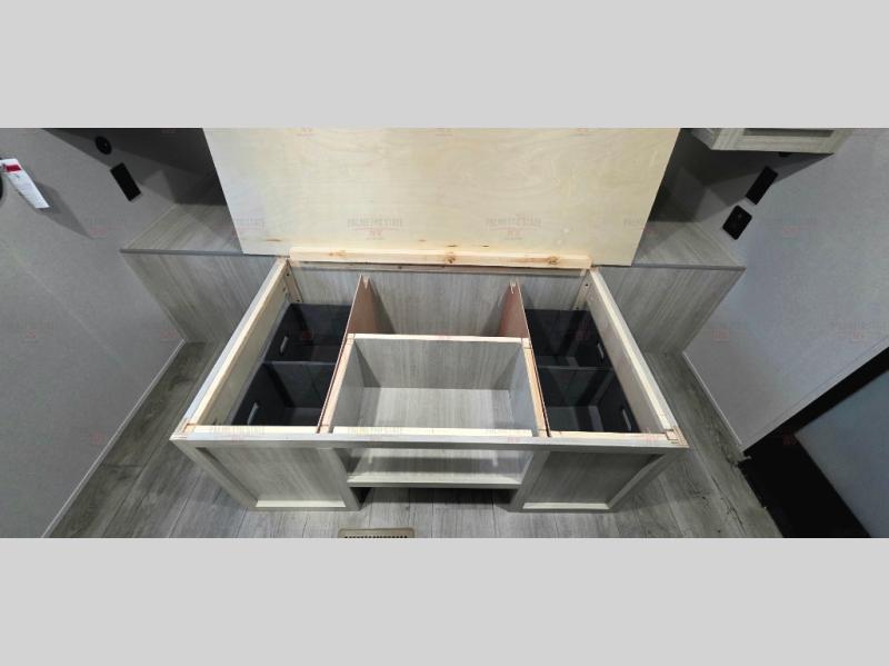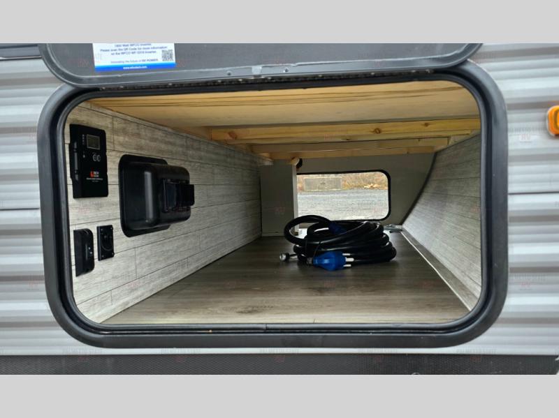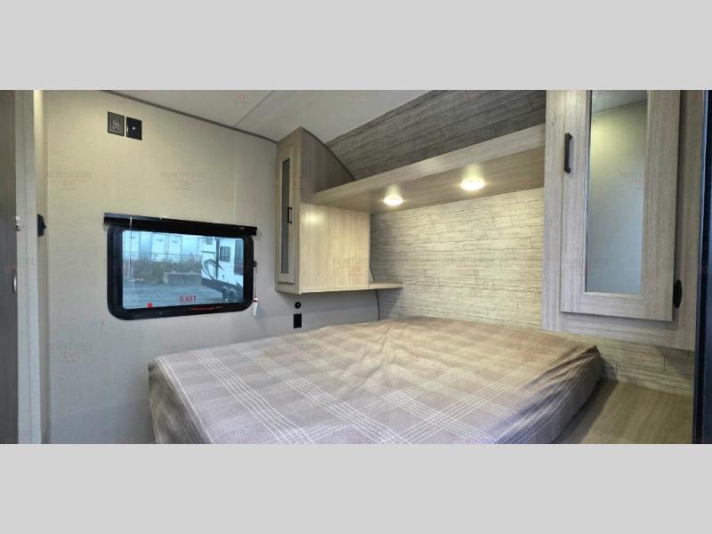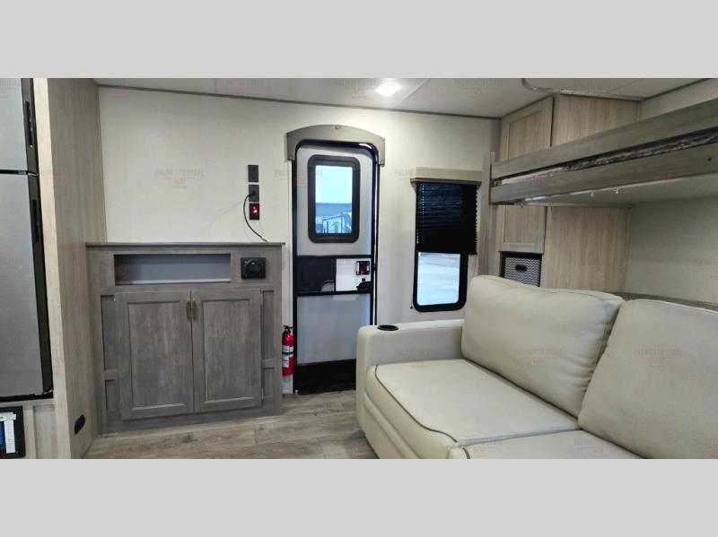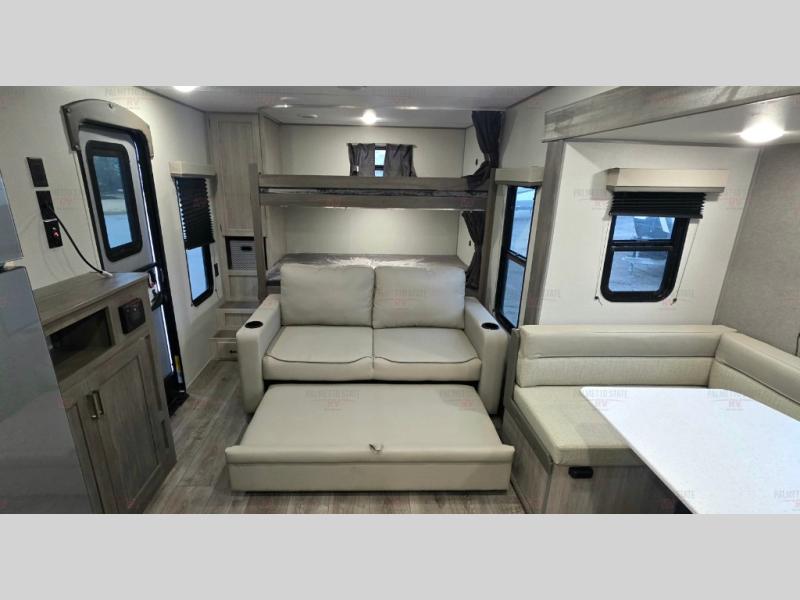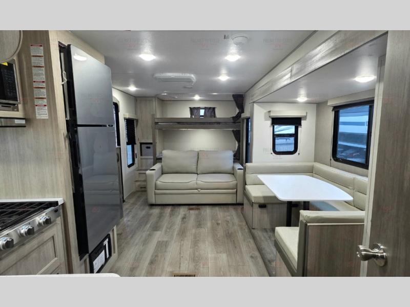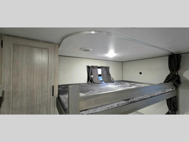 This bunkhouse travel trailer will be perfect for your whole crew! There is a large slide out in the main living area so you can stretch out, and here you'll find the U-shaped dinette and spacious pantry for snacks! The double-size bunks include steps leading up to them plus a wardrobe nearby for your guests' clothes. This model includes a walk-through bath with a tub/shower that will make bath time for little ones easier than ever, and you'll love having your own bedroom up front. A queen bed comes standard, along with dual wardrobes, plus one of the dual entry doors for convenience. The interior kitchen includes a three-burner cooktop and a microwave oven, and the outdoor camper kitchen includes a pull-out griddle, a refrigerator, and a cabinet for storage!