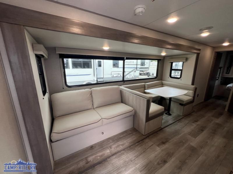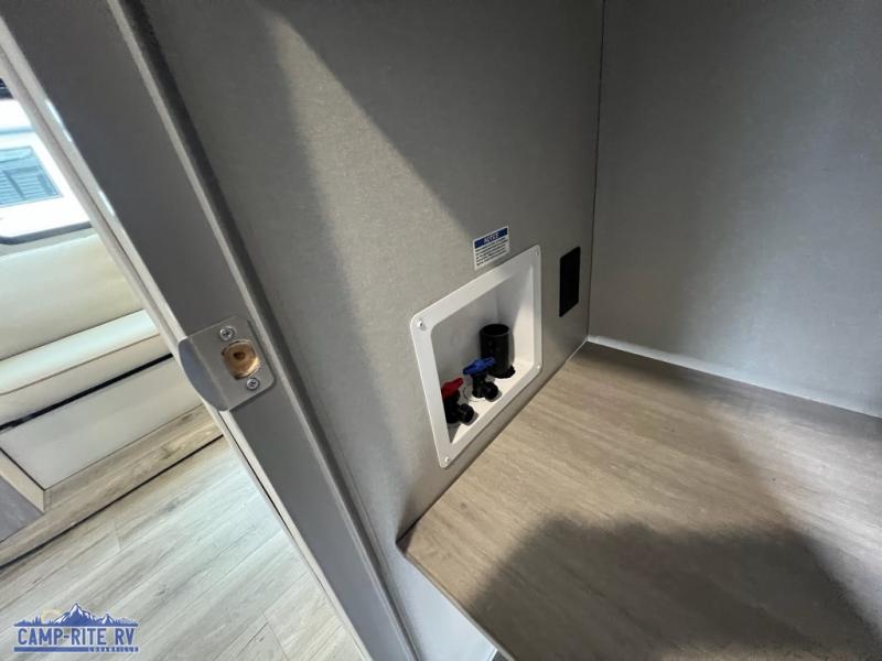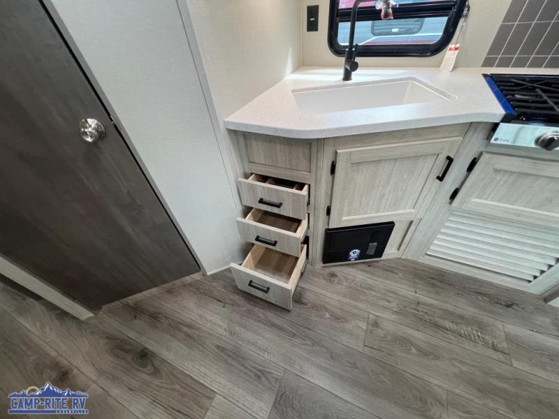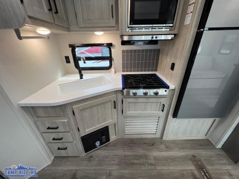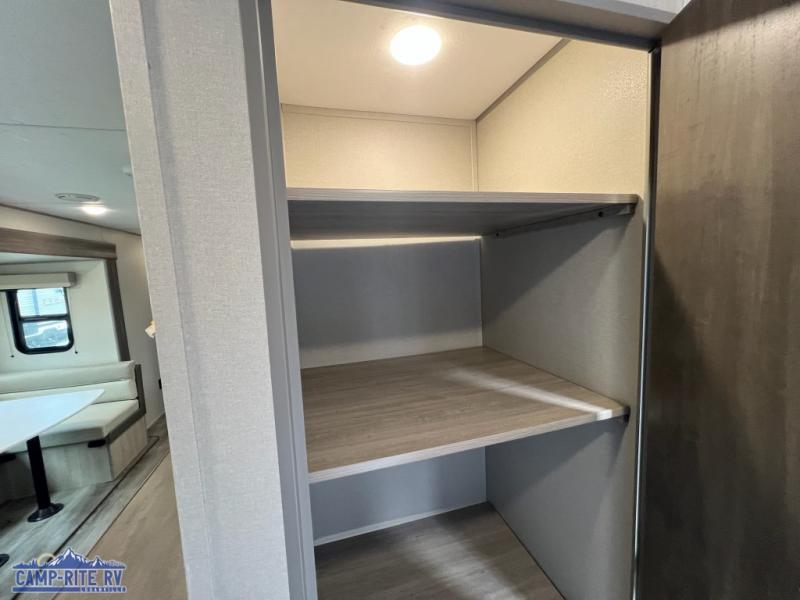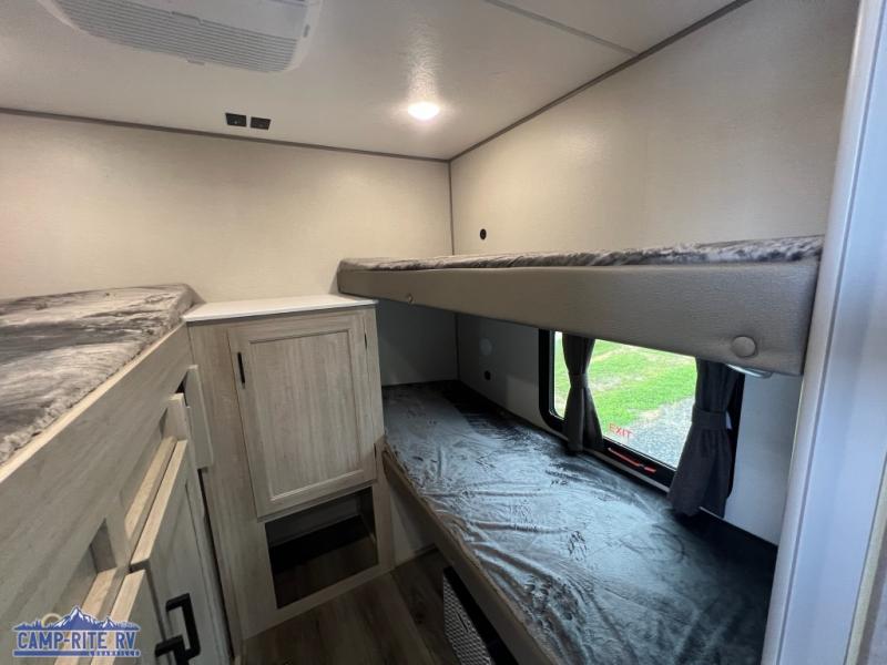 If you enjoy camping with family or a larger friend group, this trailer is sure to meet your needs! The rear private bunkhouse includes single-size bunks plus double-size bunks, allowing you to sleep up to six here alone! You'll have the 60" x 74" RV queen bed all to yourselves in the front master bedroom, and any additional guests can sleep on the U-shaped dinette and sofa within the large slide out. The chef of your group can use the GE stainless three burner cooktop or microwave oven to create meals each day, and an optional full-size exterior camp kitchen can be added if you enjoy cooking outdoors. The optional exterior kitchen replaces the lower bunk. A walk-in pantry includes washer and dryer prep if you choose to add these appliances, and everyone can stay clean all week thanks to the dual entry full bath!