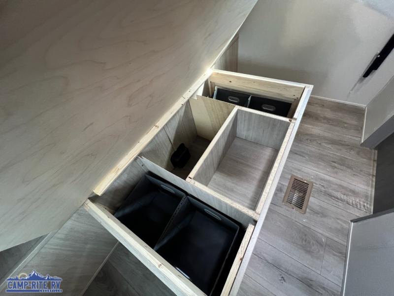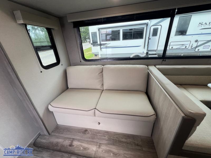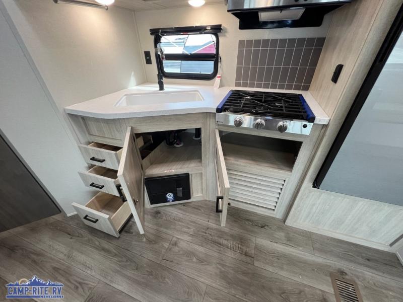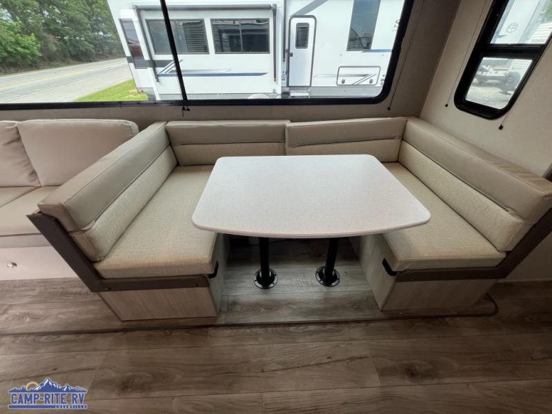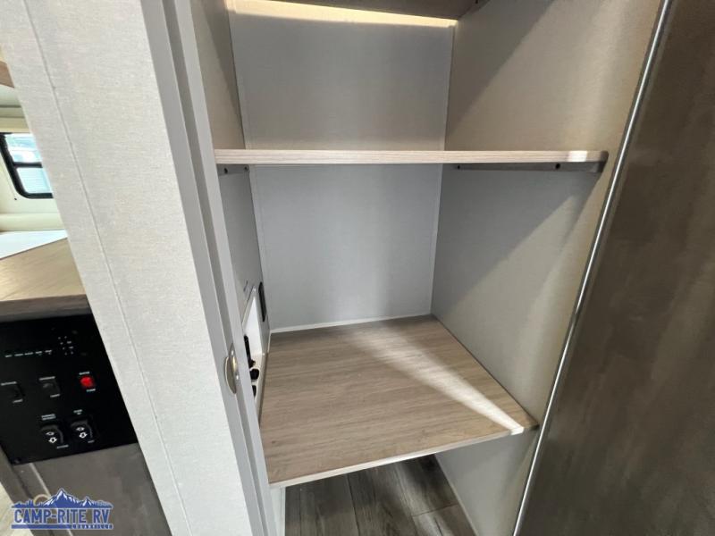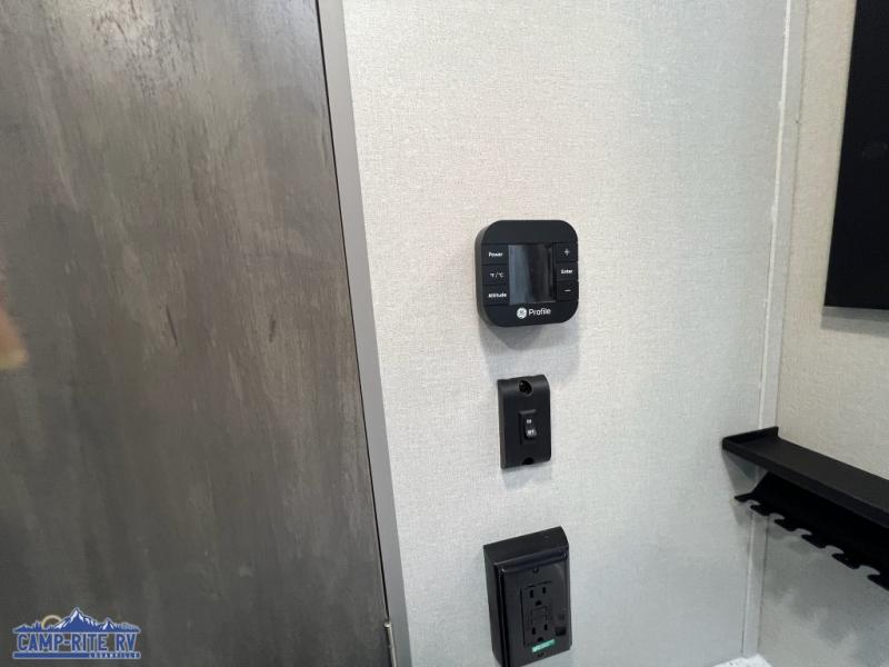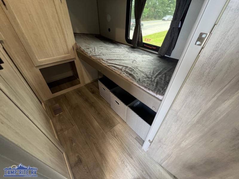 If you enjoy camping with family or a larger friend group, this trailer is sure to meet your needs! The rear private bunkhouse includes single-size bunks plus double-size bunks, allowing you to sleep up to six here alone! You'll have the 60" x 74" RV queen bed all to yourselves in the front master bedroom, and any additional guests can sleep on the U-shaped dinette and sofa within the large slide out. The chef of your group can use the GE stainless three burner cooktop or microwave oven to create meals each day, and an optional full-size exterior camp kitchen can be added if you enjoy cooking outdoors. The optional exterior kitchen replaces the lower bunk. A walk-in pantry includes washer and dryer prep if you choose to add these appliances, and everyone can stay clean all week thanks to the dual entry full bath!