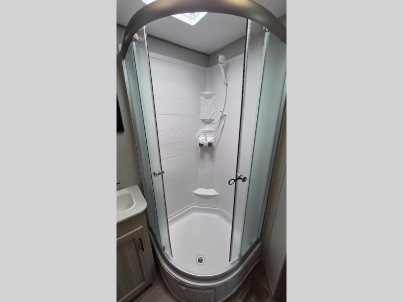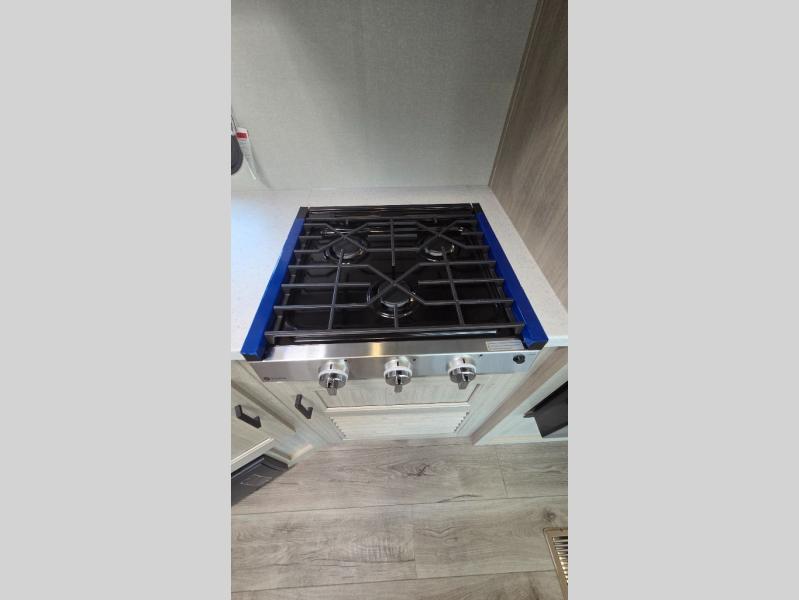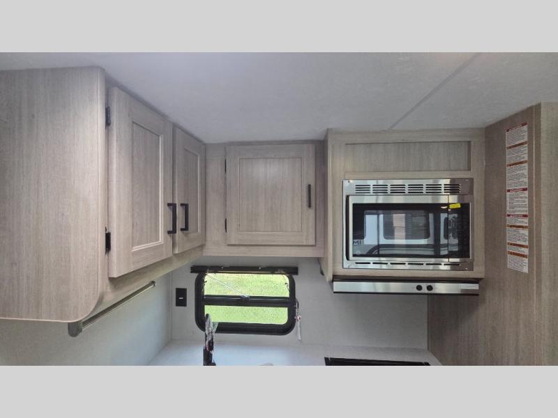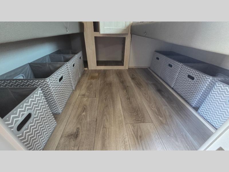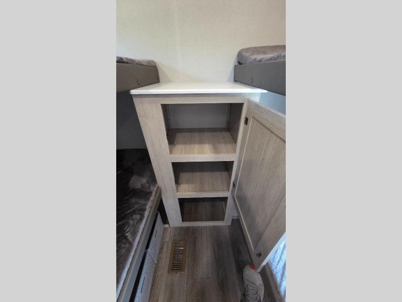If you enjoy camping with family or a larger friend group, this trailer is sure to meet your needs! The rear private bunkhouse includes single-size bunks plus double-size bunks, allowing you to sleep up to six here alone! You'll have the 60" x 74" RV queen bed all to yourselves in the front master bedroom, and any additional guests can sleep on the U-shaped dinette and sofa within the large slide out. The chef of your group can use the GE stainless three burner cooktop or microwave oven to create meals each day, and an optional full-size exterior camp kitchen can be added if you enjoy cooking outdoors. The optional exterior kitchen replaces the lower bunk. A walk-in pantry includes washer and dryer prep if you choose to add these appliances, and everyone can stay clean all week thanks to the dual entry full bath!