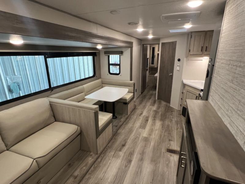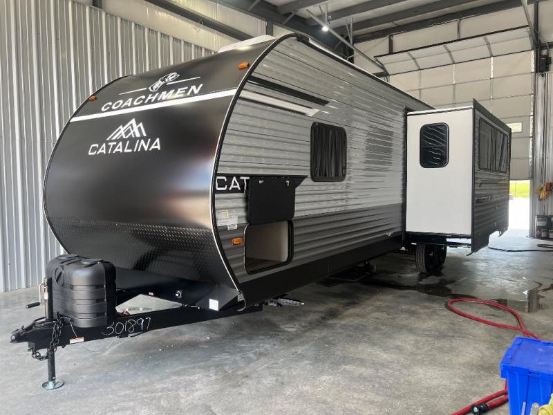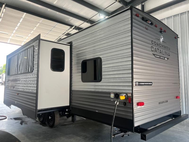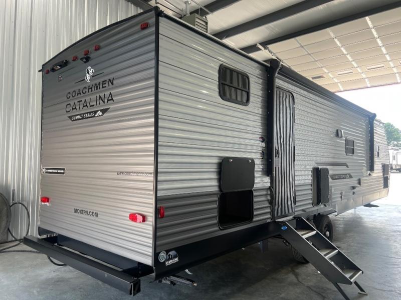 With any Catalina Summit Series 8 by Coachmen you will enjoy an affordable travel trailer packed with at-home comforts! The solid construction includes a Norco electromagnetic powder coated chassis, a seamless Alpha roof membrane, and full length frame outriggers for maximum support and durability. EZ lube axles with leaf spring suspension and self adjusting brakes provide smooth towing from home to campground, and the premium exterior graphics package is sure to turn heads as you travel down the highway. You will love the features included, such as a JBL Aura Cube media center, magnetic baggage door latches, 4,000 lumen interior touch lighting, and the list goes on!