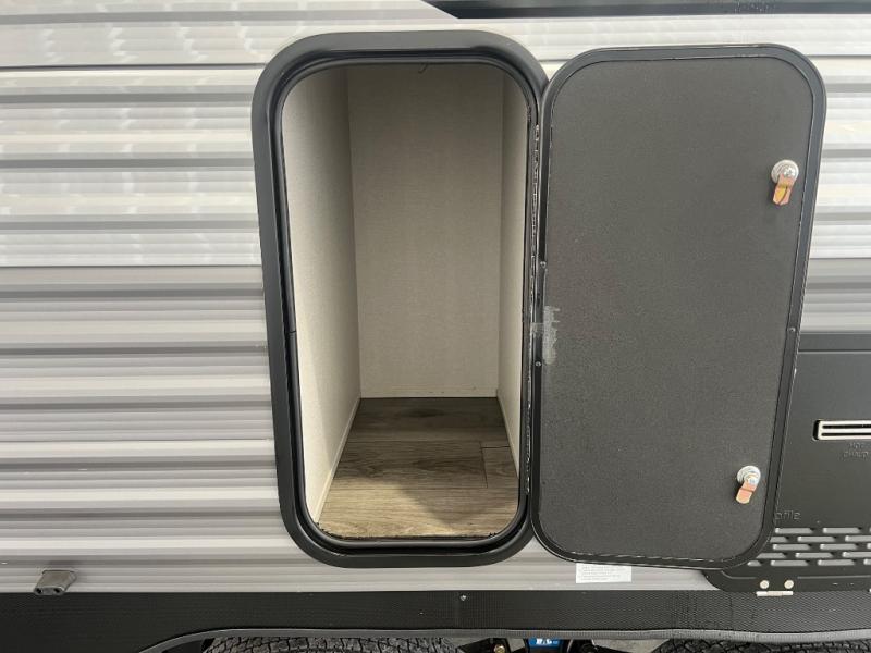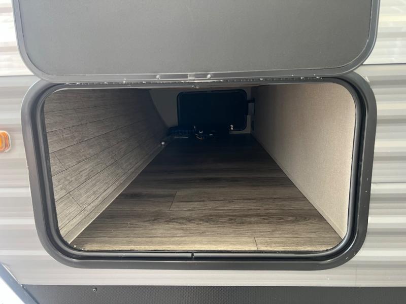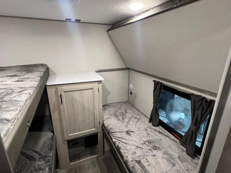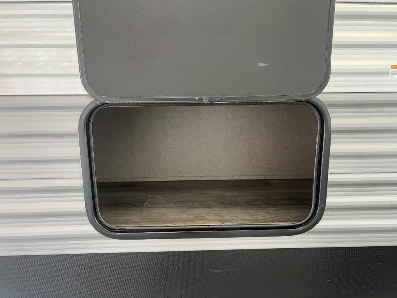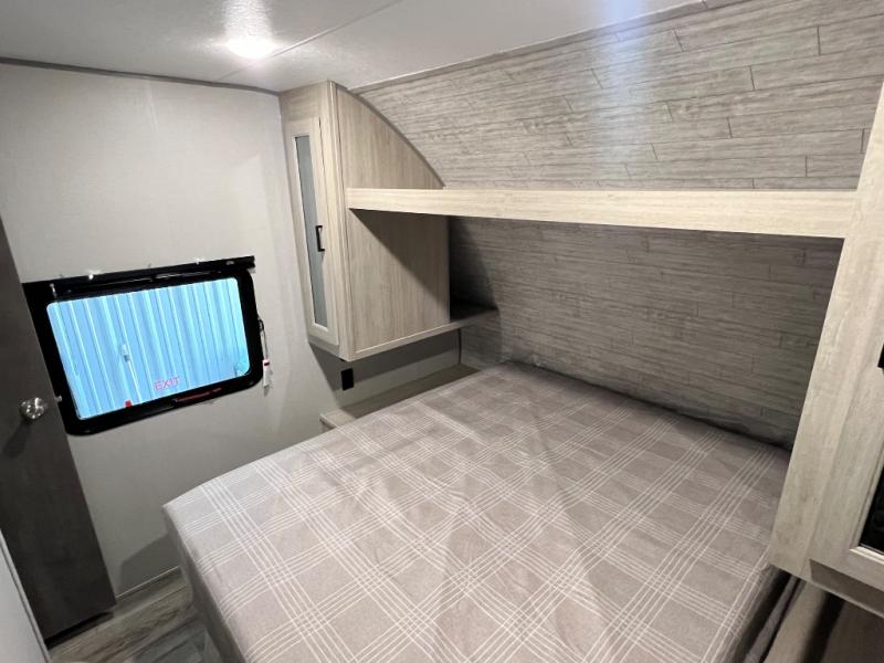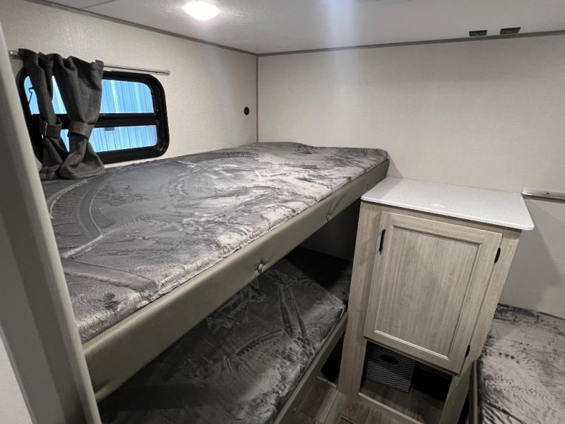 If you enjoy camping with family or a larger friend group, this trailer is sure to meet your needs! The rear private bunkhouse includes single-size bunks plus double-size bunks, allowing you to sleep up to six here alone! You'll have the 60" x 74" RV queen bed all to yourselves in the front master bedroom, and any additional guests can sleep on the U-shaped dinette and sofa within the large slide out. The chef of your group can use the GE stainless three burner cooktop or microwave oven to create meals each day, and an optional full-size exterior camp kitchen can be added if you enjoy cooking outdoors. The optional exterior kitchen replaces the lower bunk. A walk-in pantry includes washer and dryer prep if you choose to add these appliances, and everyone can stay clean all week thanks to the dual entry full bath!