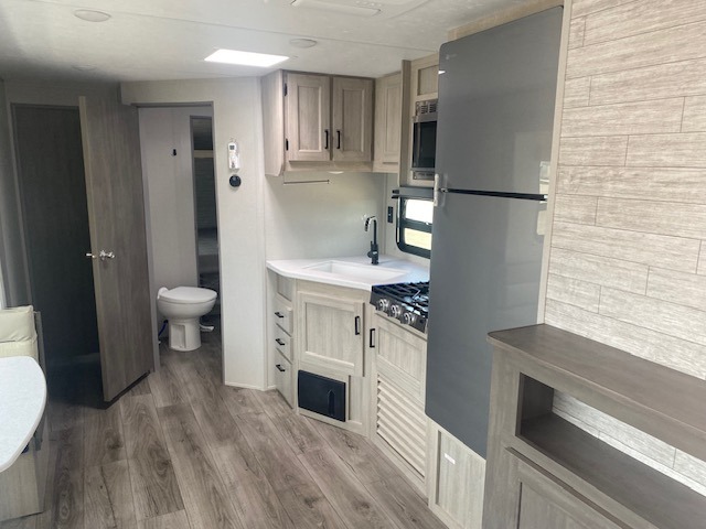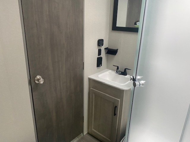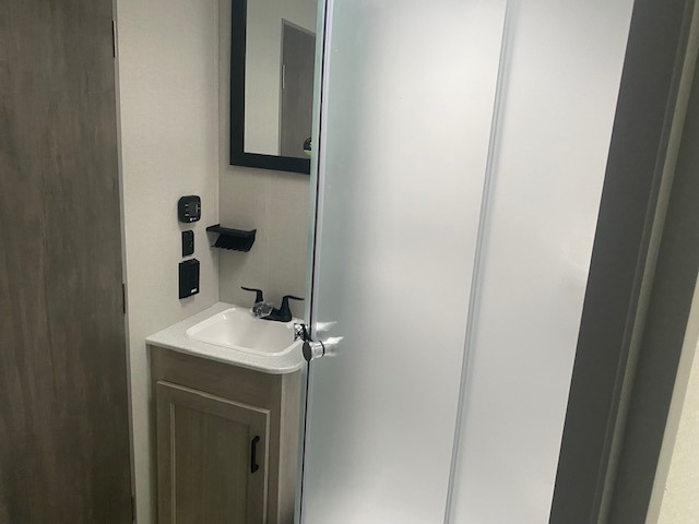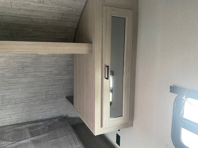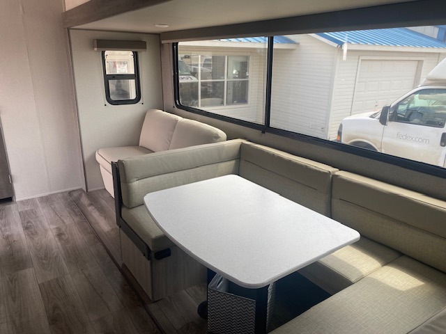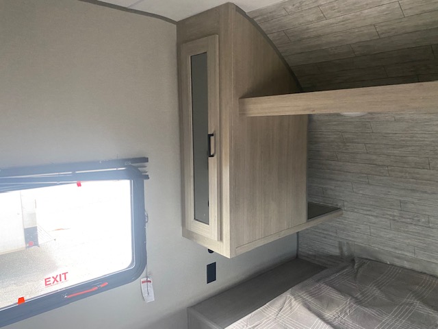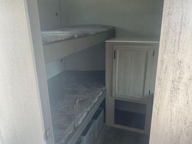 If you enjoy camping with family or a larger friend group, this trailer is sure to meet your needs! The rear private bunkhouse includes single-size bunks plus double-size bunks, allowing you to sleep up to six here alone! You'll have the 60" x 74" RV queen bed all to yourselves in the front master bedroom, and any additional guests can sleep on the U-shaped dinette and sofa within the large slide out. The chef of your group can use the GE stainless three burner cooktop or microwave oven to create meals each day, and an optional full-size exterior camp kitchen can be added if you enjoy cooking outdoors. The optional exterior kitchen replaces the lower bunk. A walk-in pantry includes washer and dryer prep if you choose to add these appliances, and everyone can stay clean all week thanks to the dual entry full bath!