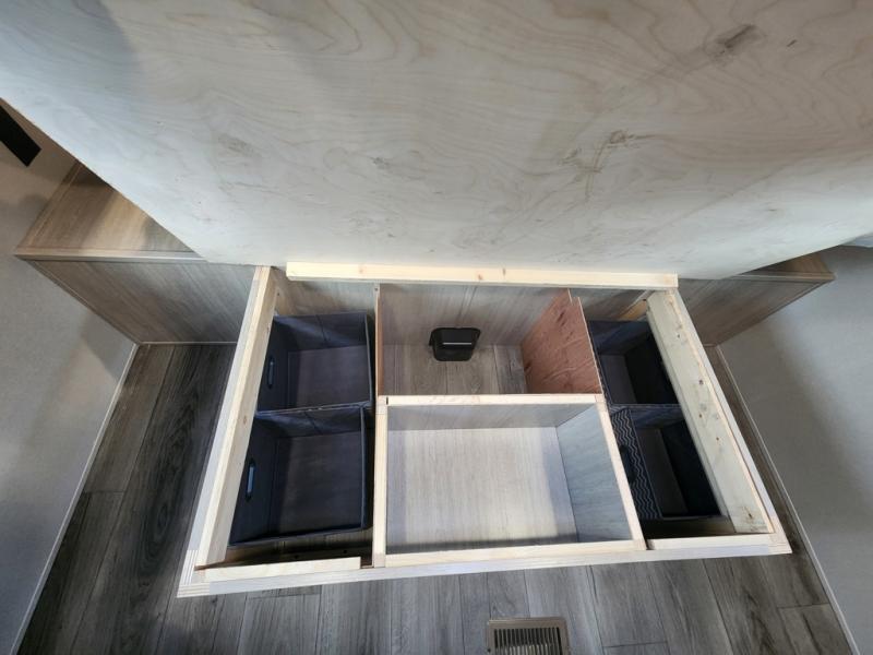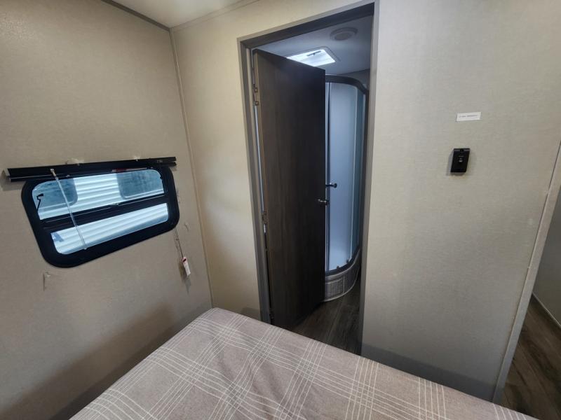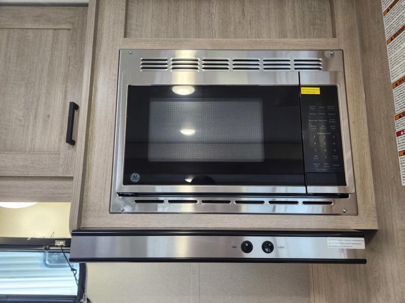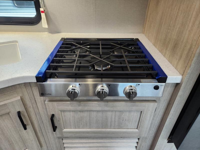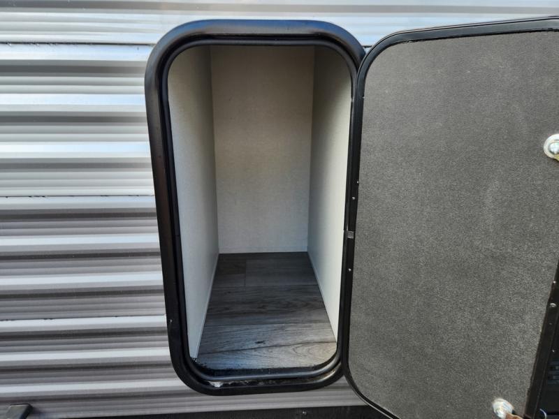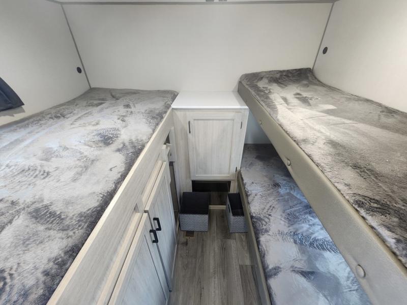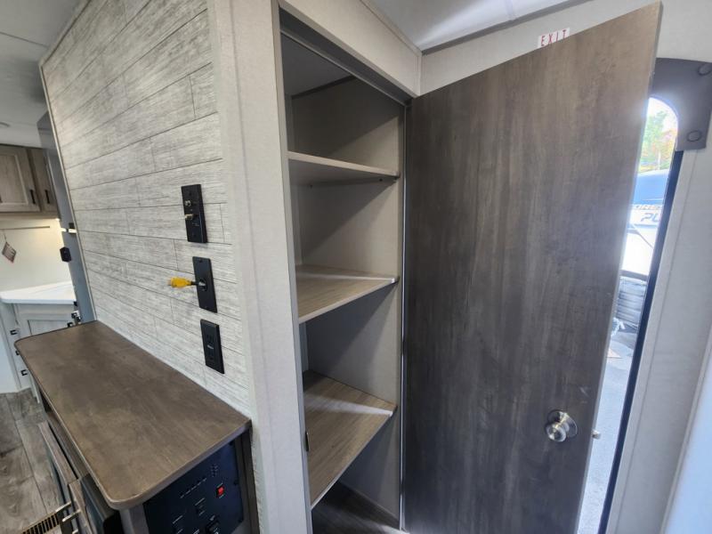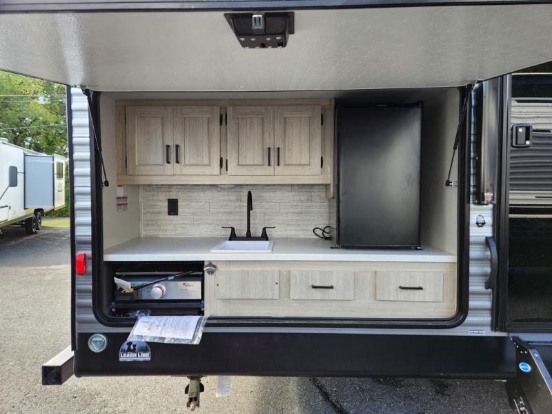 If you enjoy camping with family or a larger friend group, this trailer is sure to meet your needs! The rear private bunkhouse includes single-size bunks plus double-size bunks, allowing you to sleep up to six here alone! You'll have the 60" x 74" RV queen bed all to yourselves in the front master bedroom, and any additional guests can sleep on the U-shaped dinette and sofa within the large slide out. The chef of your group can use the GE stainless three burner cooktop or microwave oven to create meals each day, and an optional full-size exterior camp kitchen can be added if you enjoy cooking outdoors. The optional exterior kitchen replaces the lower bunk. A walk-in pantry includes washer and dryer prep if you choose to add these appliances, and everyone can stay clean all week thanks to the dual entry full bath!