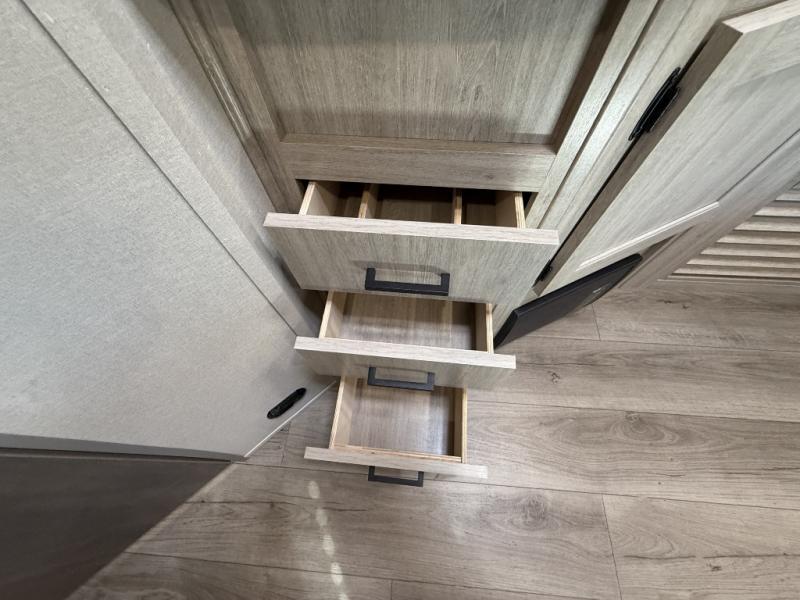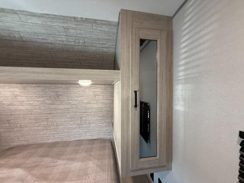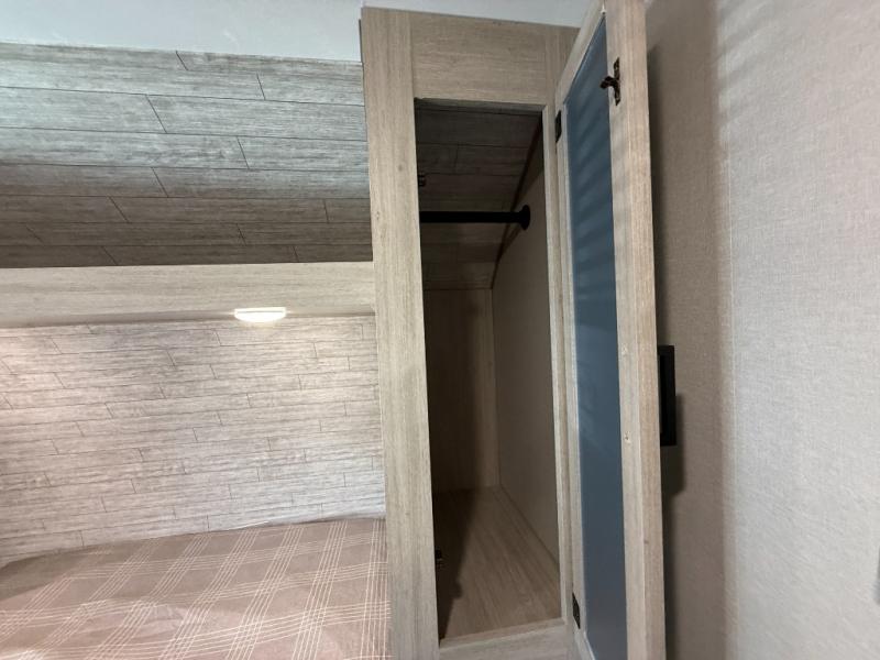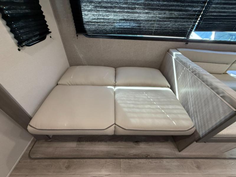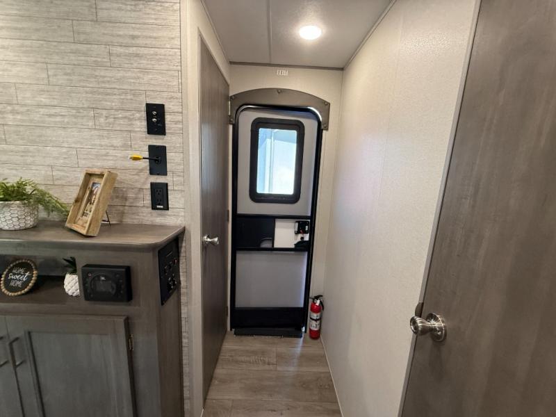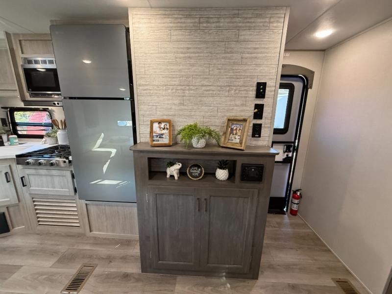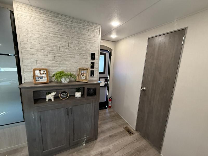 If you enjoy camping with family or a larger friend group, this trailer is sure to meet your needs! The rear private bunkhouse includes single-size bunks plus double-size bunks, allowing you to sleep up to six here alone! You'll have the 60" x 74" RV queen bed all to yourselves in the front master bedroom, and any additional guests can sleep on the U-shaped dinette and sofa within the large slide out. The chef of your group can use the GE stainless three burner cooktop or microwave oven to create meals each day, and an optional full-size exterior camp kitchen can be added if you enjoy cooking outdoors. The optional exterior kitchen replaces the lower bunk. A walk-in pantry includes washer and dryer prep if you choose to add these appliances, and everyone can stay clean all week thanks to the dual entry full bath!