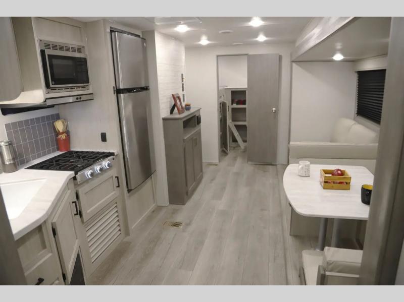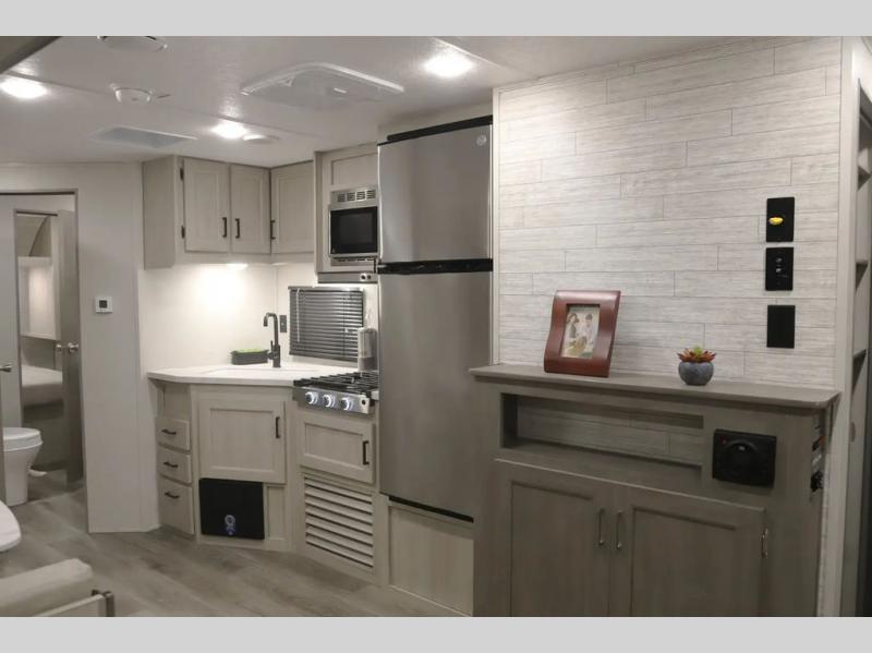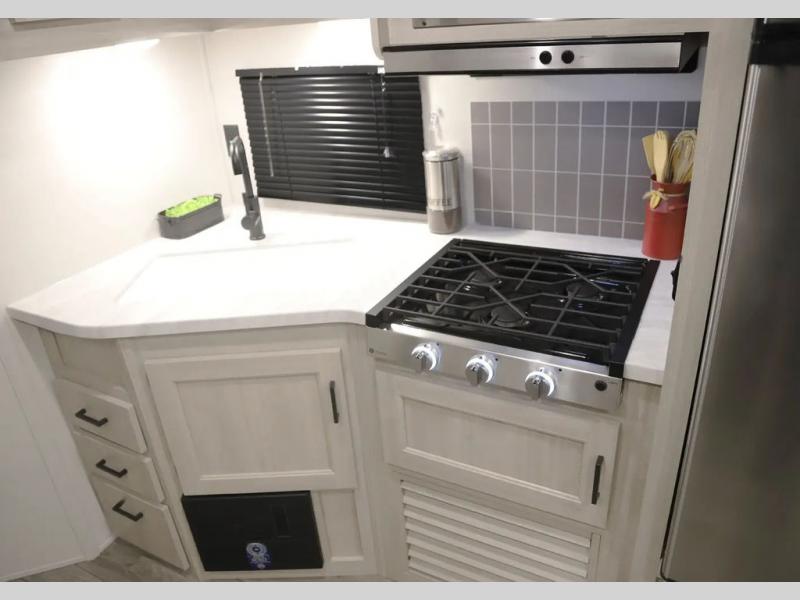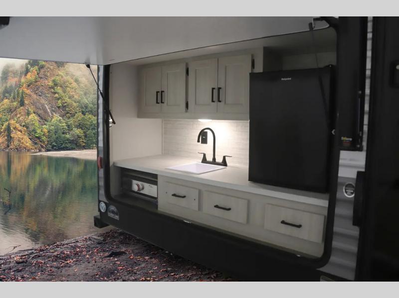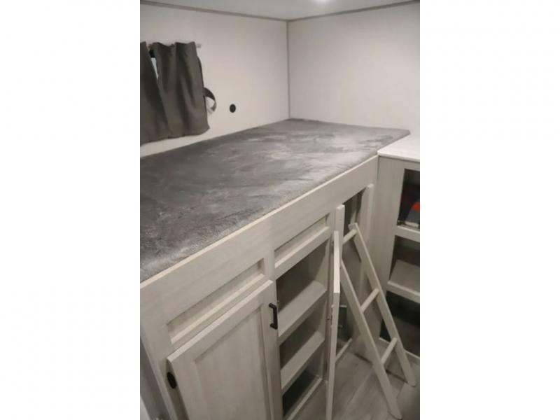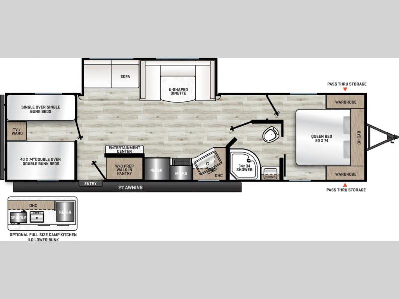 If you enjoy camping with family or a larger friend group, this trailer is sure to meet your needs! The rear private bunkhouse includes single-size bunks plus double-size bunks, allowing you to sleep up to six here alone! You'll have the 60" x 74" queen bed all to yourselves in the front master bedroom, and any additional guests can sleep on the U-shaped dinette and sofa within the large slide out. The chef of your group can use the GE stainless three burner cooktop or microwave oven to create meals each day, and an optional full-size exterior camp kitchen can be added if you enjoy cooking outdoors. A walk-in pantry includes washer and dryer prep if you choose to add these appliances, and everyone can stay clean all week thanks to the dual entry full bath!