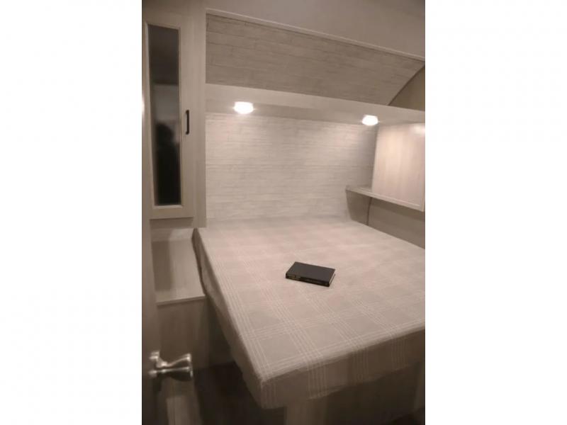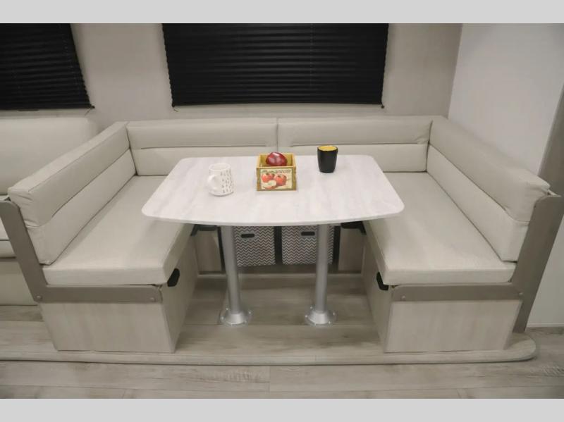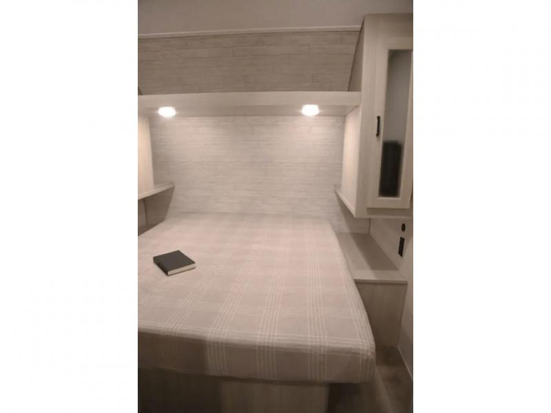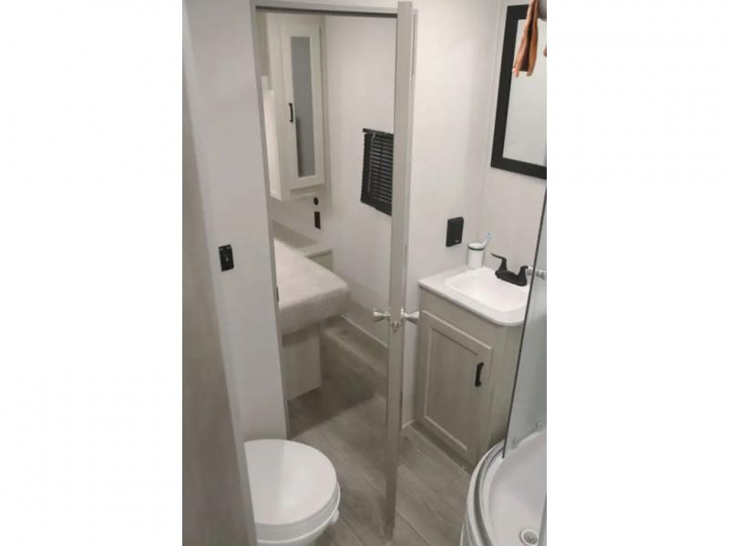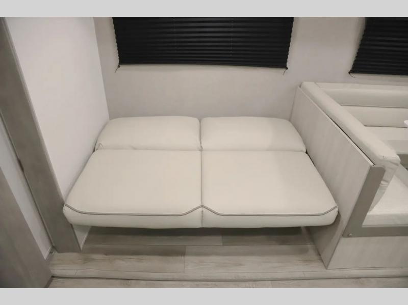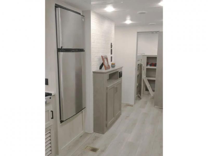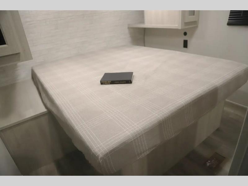 If you enjoy camping with family or a larger friend group, this trailer is sure to meet your needs! The rear private bunkhouse includes single-size bunks plus double-size bunks, allowing you to sleep up to six here alone! You'll have the 60" x 74" queen bed all to yourselves in the front master bedroom, and any additional guests can sleep on the U-shaped dinette and sofa within the large slide out. The chef of your group can use the GE stainless three burner cooktop or microwave oven to create meals each day, and an optional full-size exterior camp kitchen can be added if you enjoy cooking outdoors. A walk-in pantry includes washer and dryer prep if you choose to add these appliances, and everyone can stay clean all week thanks to the dual entry full bath!