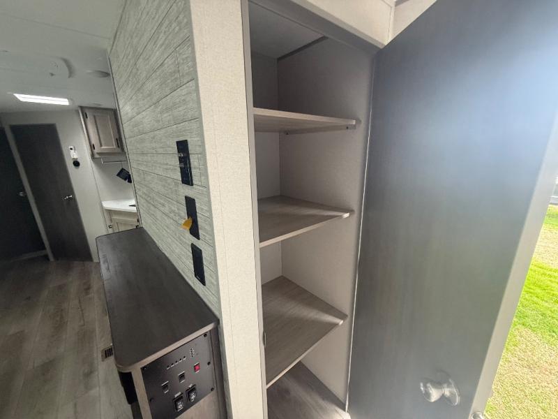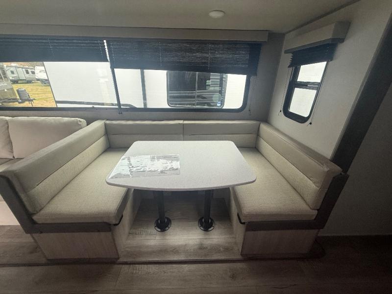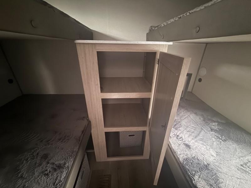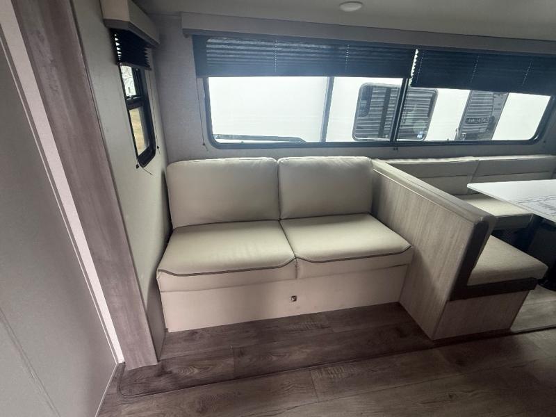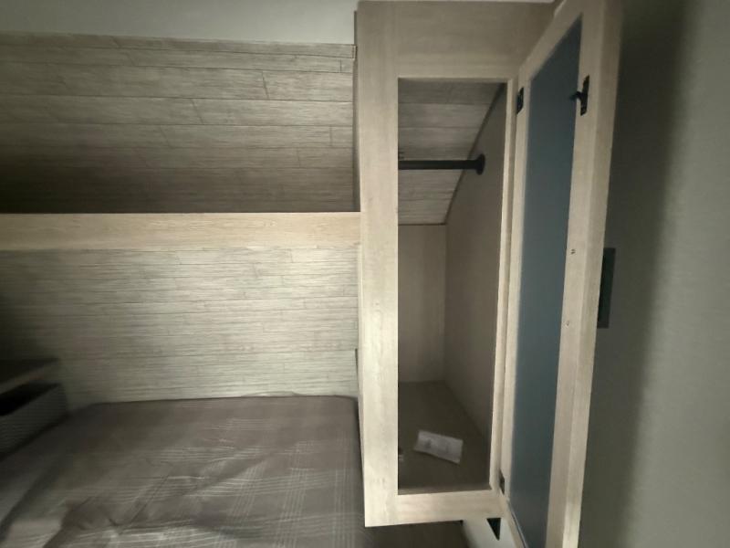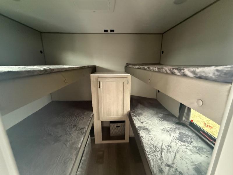 If you enjoy camping with family or a larger friend group, this trailer is sure to meet your needs! The rear private bunkhouse includes single-size bunks plus double-size bunks, allowing you to sleep up to six here alone! You'll have the 60" x 74" queen bed all to yourselves in the front master bedroom, and any additional guests can sleep on the U-shaped dinette and sofa within the large slide out. The chef of your group can use the GE stainless three burner cooktop or microwave oven to create meals each day, and an optional full-size exterior camp kitchen can be added if you enjoy cooking outdoors. A walk-in pantry includes washer and dryer prep if you choose to add these appliances, and everyone can stay clean all week thanks to the dual entry full bath!