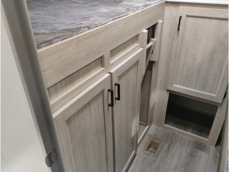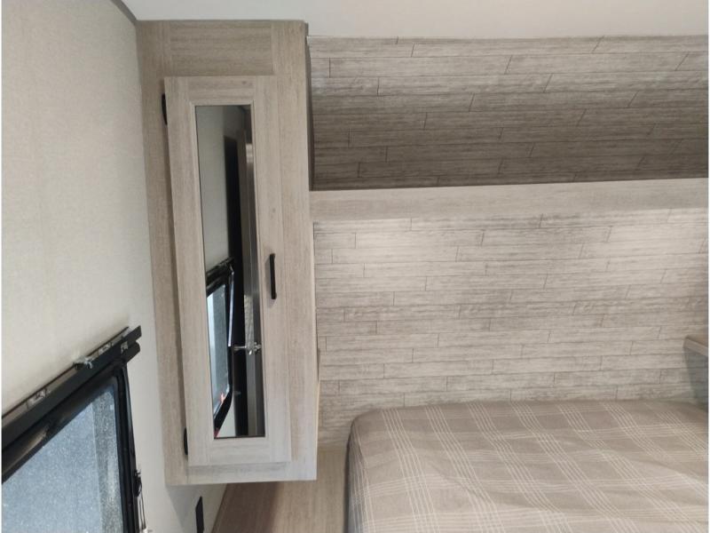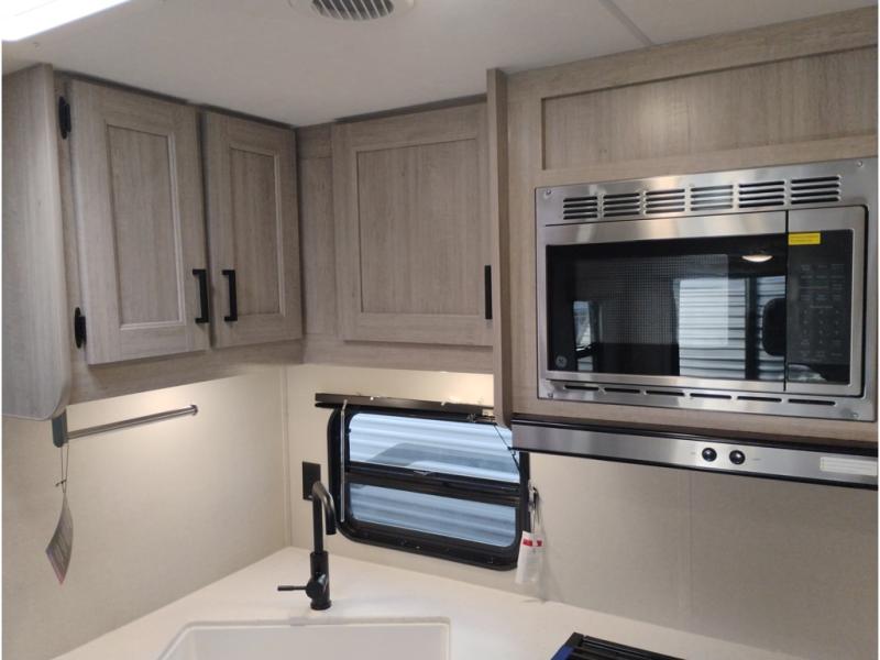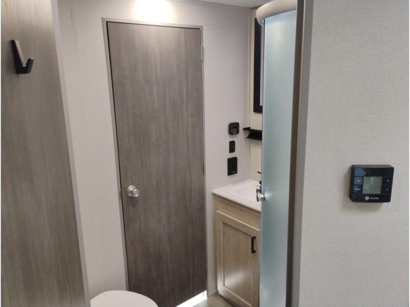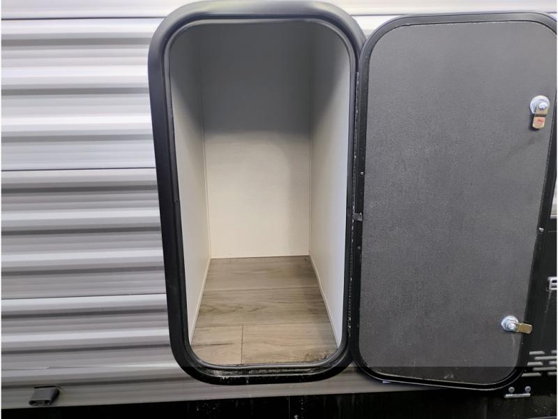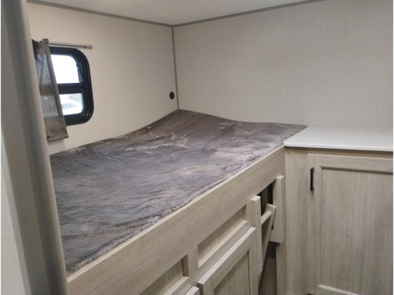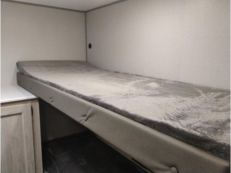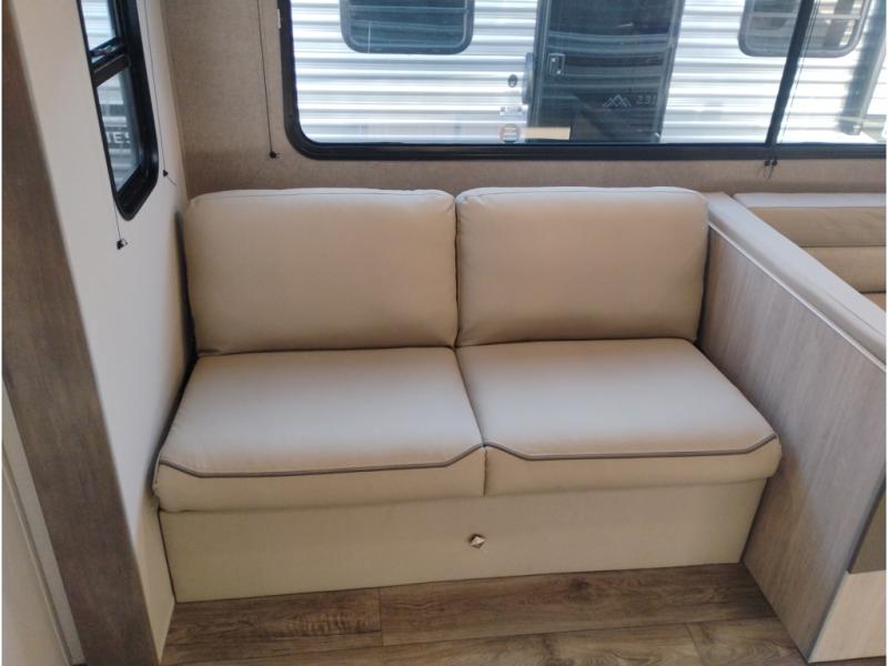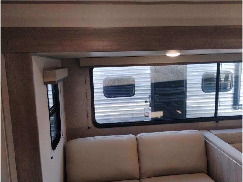 If you enjoy camping with family or a larger friend group, this trailer is sure to meet your needs! The rear private bunkhouse includes single-size bunks plus double-size bunks, allowing you to sleep up to six here alone! You'll have the 60" x 74" queen bed all to yourselves in the front master bedroom, and any additional guests can sleep on the U-shaped dinette and sofa within the large slide out. The chef of your group can use the GE stainless three burner cooktop or microwave oven to create meals each day, and an optional full-size exterior camp kitchen can be added if you enjoy cooking outdoors. A walk-in pantry includes washer and dryer prep if you choose to add these appliances, and everyone can stay clean all week thanks to the dual entry full bath!