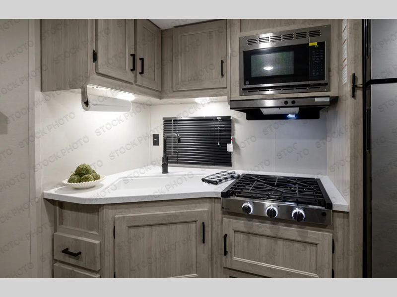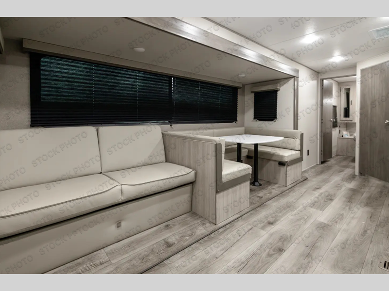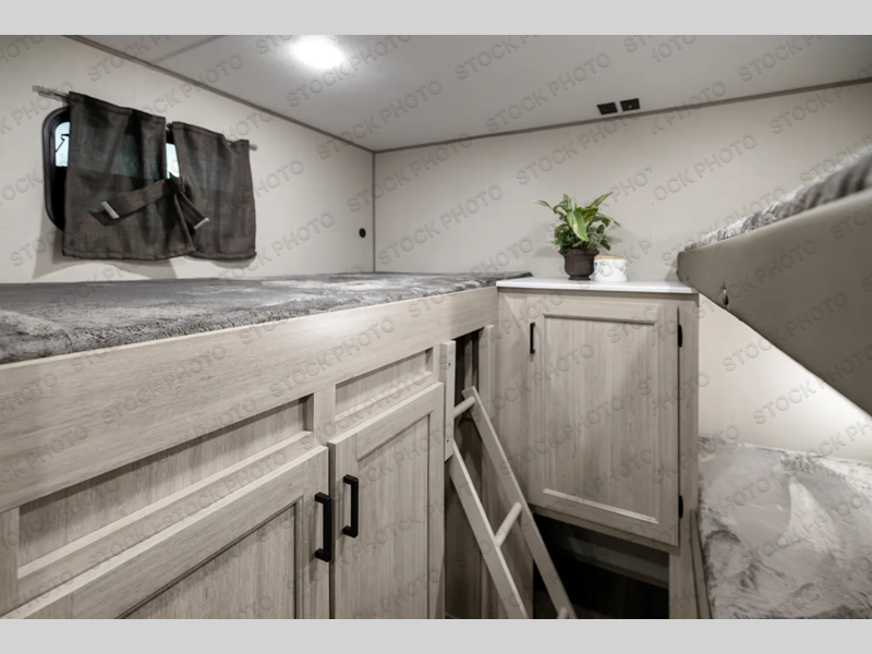 If you enjoy camping with family or a larger friend group, this trailer is sure to meet your needs! The rear private bunkhouse includes single-size bunks plus double-size bunks, allowing you to sleep up to six here alone! You'll have the 60" x 74" queen bed all to yourselves in the front master bedroom, and any additional guests can sleep on the U-shaped dinette and sofa within the large slide out. The chef of your group can use the GE stainless three burner cooktop or microwave oven to create meals each day, and an optional full-size exterior camp kitchen can be added if you enjoy cooking outdoors. A walk-in pantry includes washer and dryer prep if you choose to add these appliances, and everyone can stay clean all week thanks to the dual entry full bath!