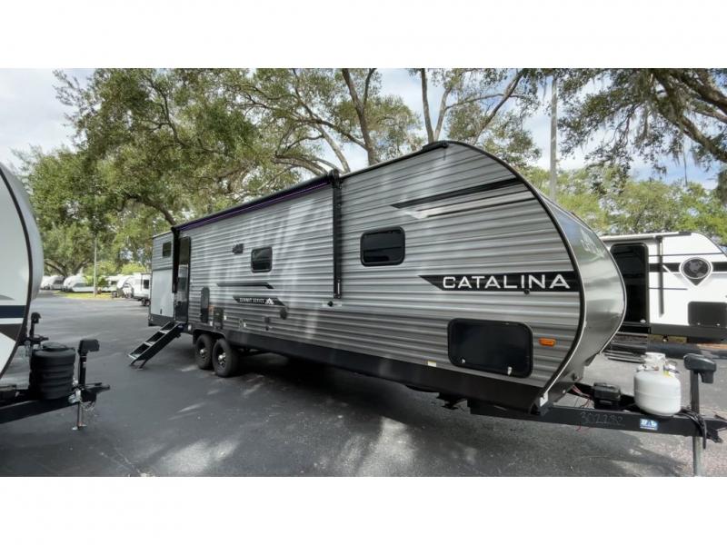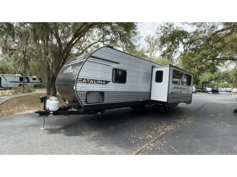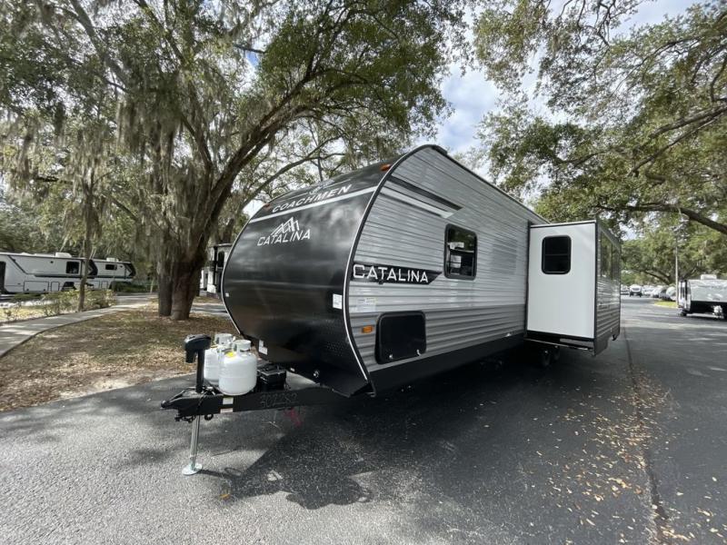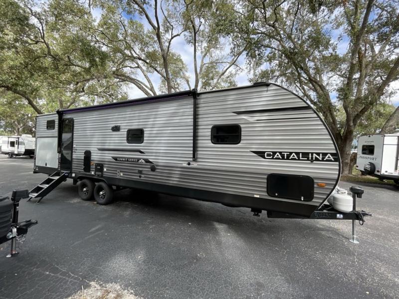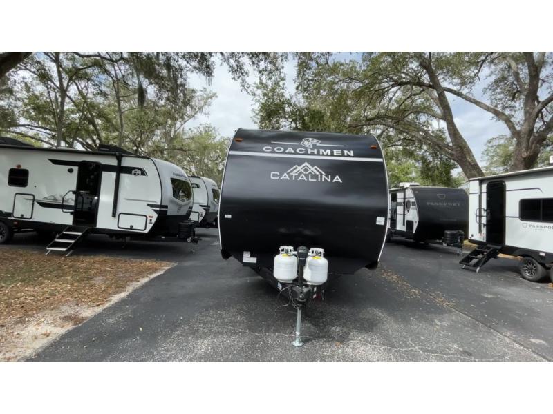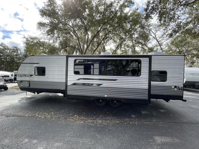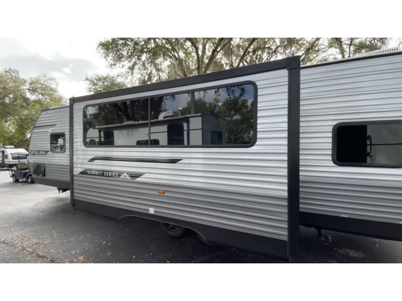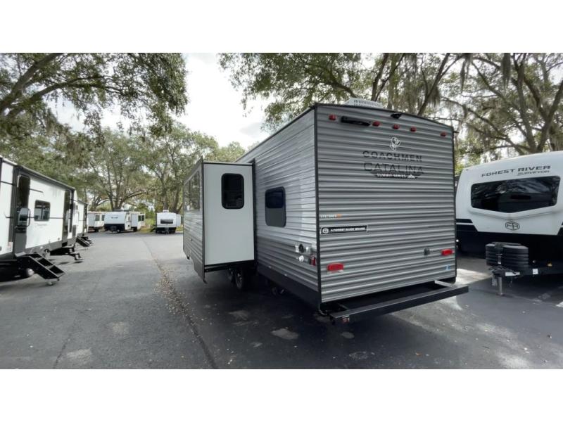 With any Catalina Summit Series 8 by Coachmen you will enjoy an affordable travel trailer packed with at-home comforts! The solid construction includes a Norco electromagnetic powder coated chassis, a seamless Alpha roof membrane, and full length frame outriggers for maximum support and durability. EZ lube axles with leaf spring suspension and self adjusting brakes provide smooth towing from home to campground, and the premium exterior graphics package is sure to turn heads as you travel down the highway. You will love the features included, such as a JBL Aura Cube media center, magnetic baggage door latches, 4,000 lumen interior touch lighting, and the list goes on!