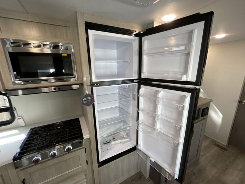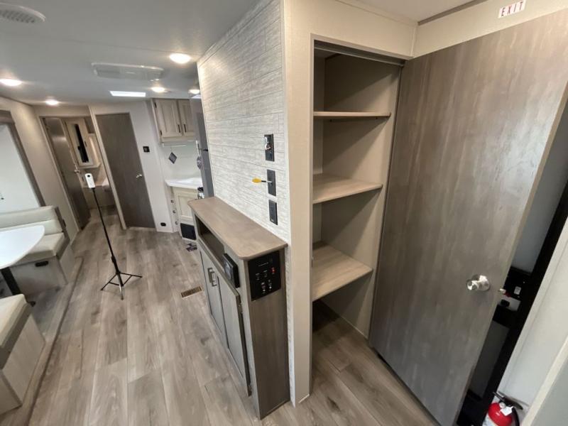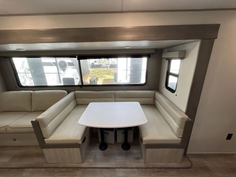 If you enjoy camping with family or a larger friend group, this trailer is sure to meet your needs! The rear private bunkhouse includes single-size bunks plus double-size bunks, allowing you to sleep up to six here alone! You'll have the 60" x 74" queen bed all to yourselves in the front master bedroom, and any additional guests can sleep on the U-shaped dinette and sofa within the large slide out. The chef of your group can use the GE stainless three burner cooktop or microwave oven to create meals each day, and an optional full-size exterior camp kitchen can be added if you enjoy cooking outdoors. A walk-in pantry includes washer and dryer prep if you choose to add these appliances, and everyone can stay clean all week thanks to the dual entry full bath!