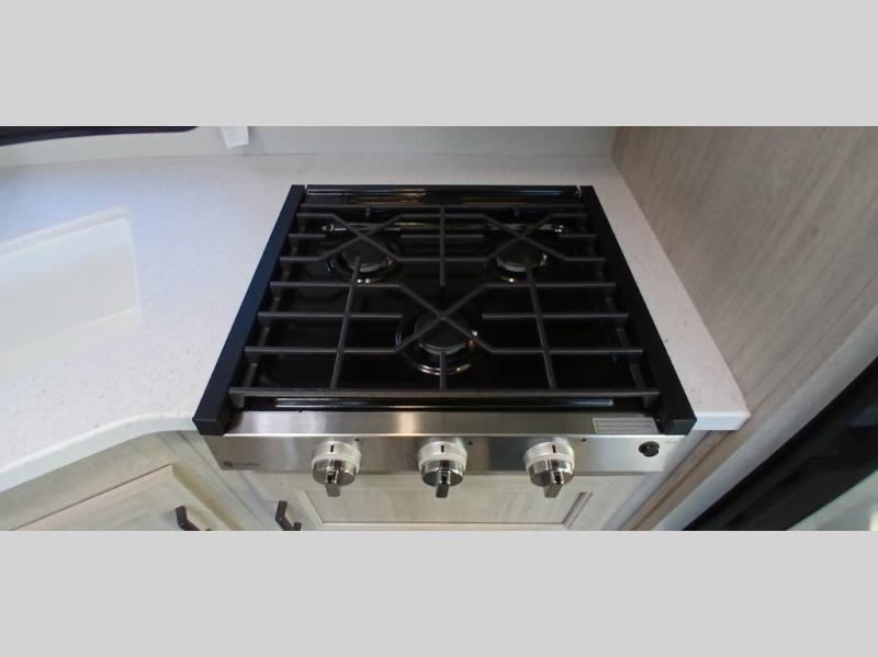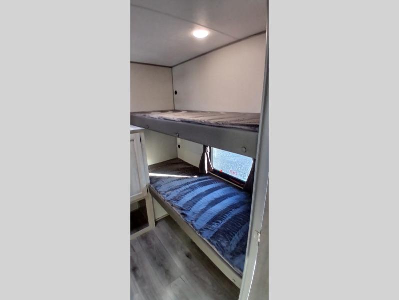 If you enjoy camping with family or a larger friend group, this trailer is sure to meet your needs! The rear private bunkhouse includes single-size bunks plus double-size bunks, allowing you to sleep up to six here alone! You'll have the 60" x 74" queen bed all to yourselves in the front master bedroom, and any additional guests can sleep on the U-shaped dinette and sofa within the large slide out. The chef of your group can use the GE stainless three burner cooktop or microwave oven to create meals each day, and an optional full-size exterior camp kitchen can be added if you enjoy cooking outdoors. A walk-in pantry includes washer and dryer prep if you choose to add these appliances, and everyone can stay clean all week thanks to the dual entry full bath!