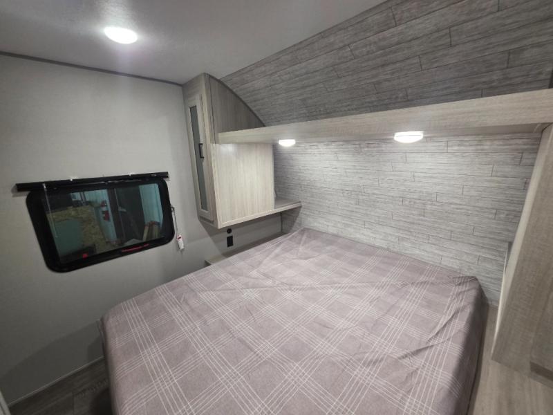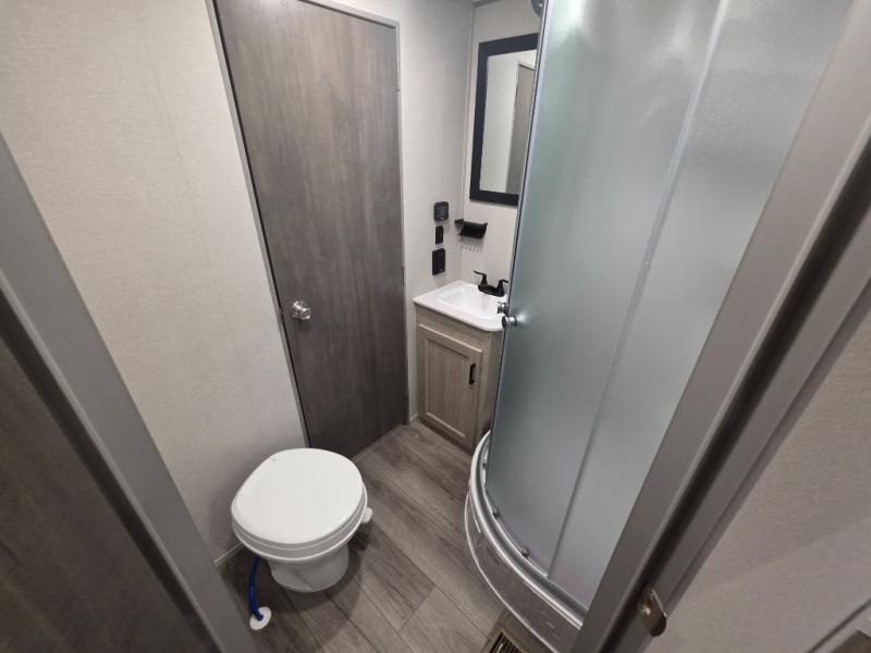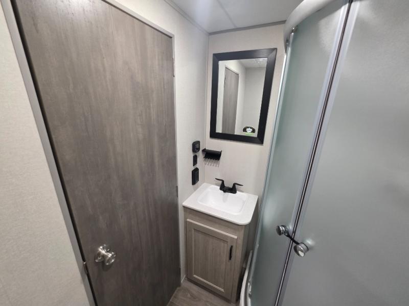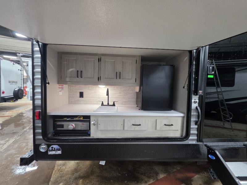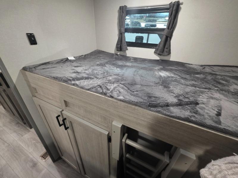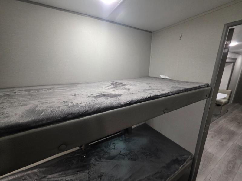 If you enjoy camping with family or a larger friend group, this trailer is sure to meet your needs! The rear private bunkhouse includes single-size bunks plus double-size bunks, allowing you to sleep up to six here alone! You'll have the 60" x 74" queen bed all to yourselves in the front master bedroom, and any additional guests can sleep on the U-shaped dinette and sofa within the large slide out. The chef of your group can use the GE stainless three burner cooktop or microwave oven to create meals each day, and an optional full-size exterior camp kitchen can be added if you enjoy cooking outdoors. A walk-in pantry includes washer and dryer prep if you choose to add these appliances, and everyone can stay clean all week thanks to the dual entry full bath!