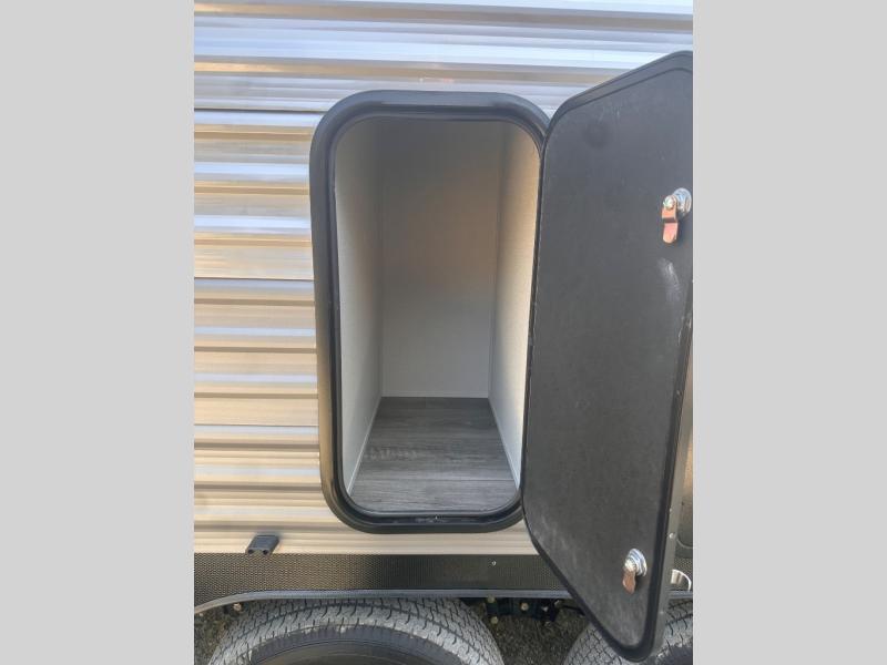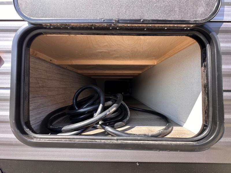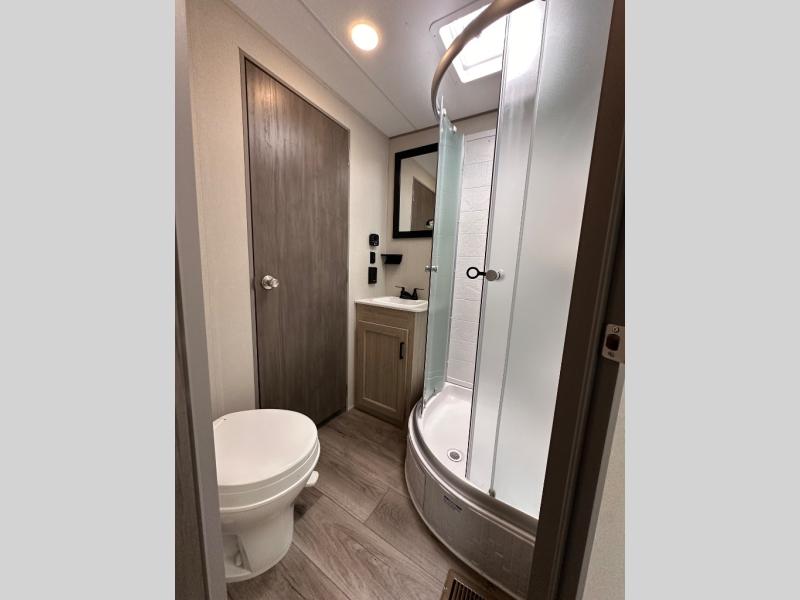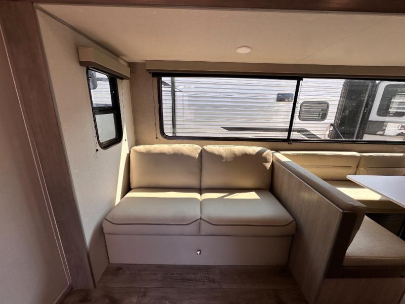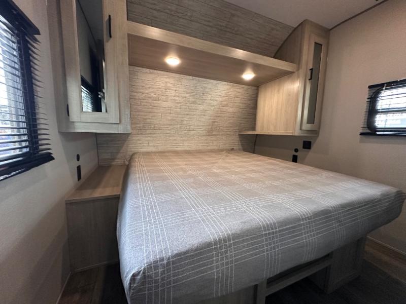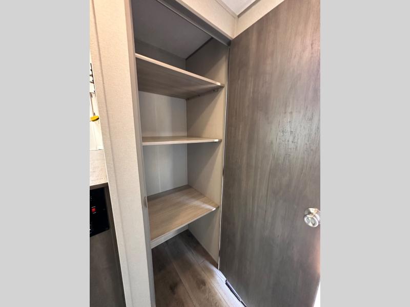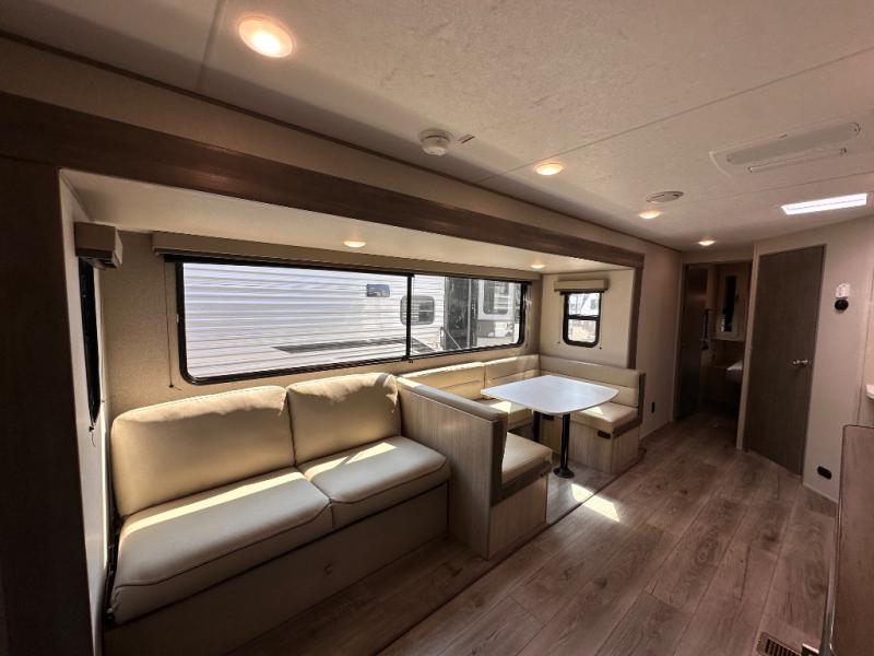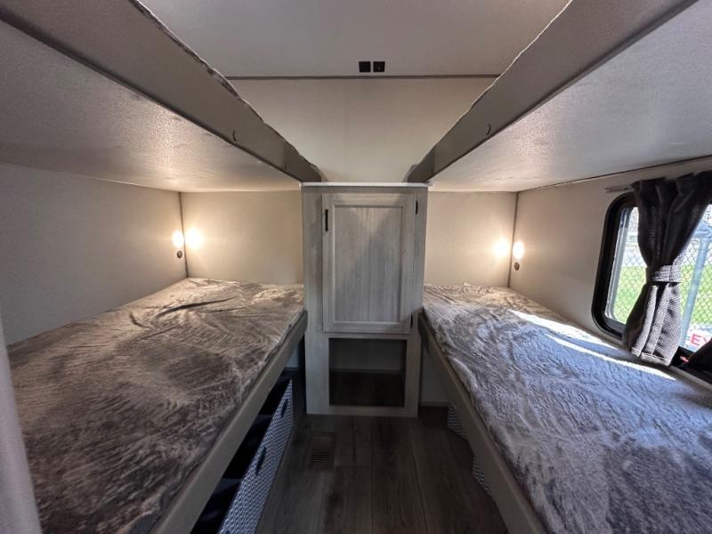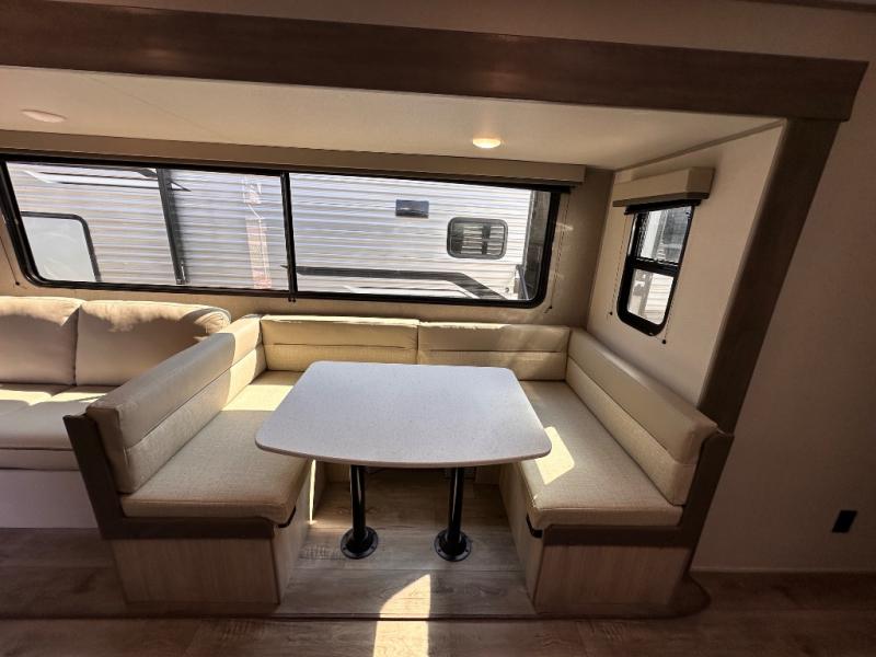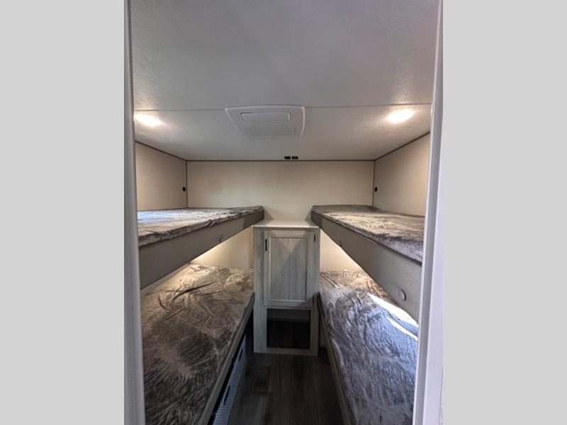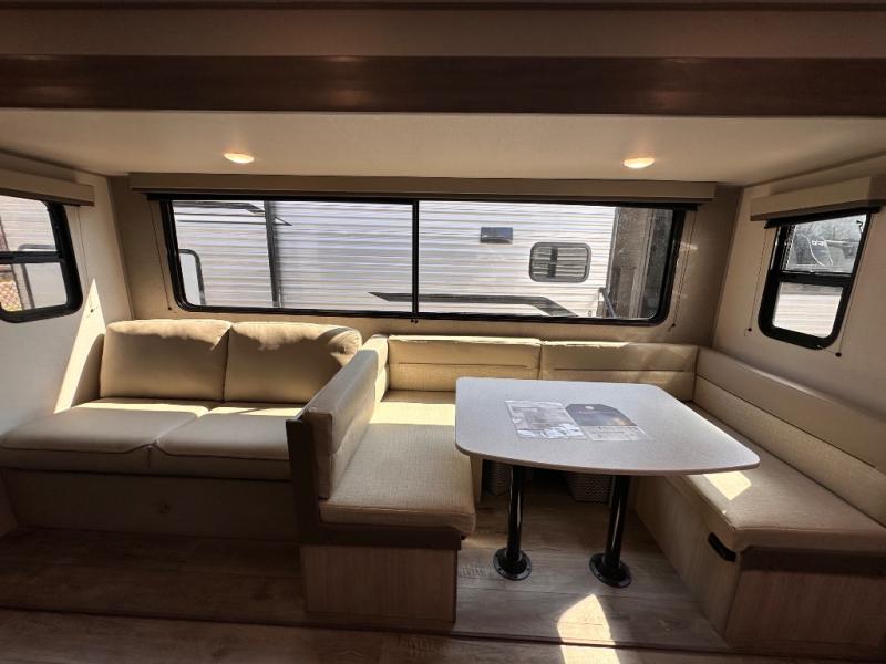 If you enjoy camping with family or a larger friend group, this trailer is sure to meet your needs! The rear private bunkhouse includes single-size bunks plus double-size bunks, allowing you to sleep up to six here alone! You'll have the 60" x 74" queen bed all to yourselves in the front master bedroom, and any additional guests can sleep on the U-shaped dinette and sofa within the large slide out. The chef of your group can use the GE stainless three burner cooktop or microwave oven to create meals each day, and an optional full-size exterior camp kitchen can be added if you enjoy cooking outdoors. A walk-in pantry includes washer and dryer prep if you choose to add these appliances, and everyone can stay clean all week thanks to the dual entry full bath!