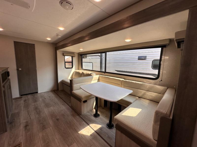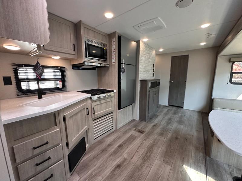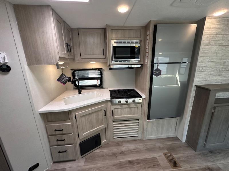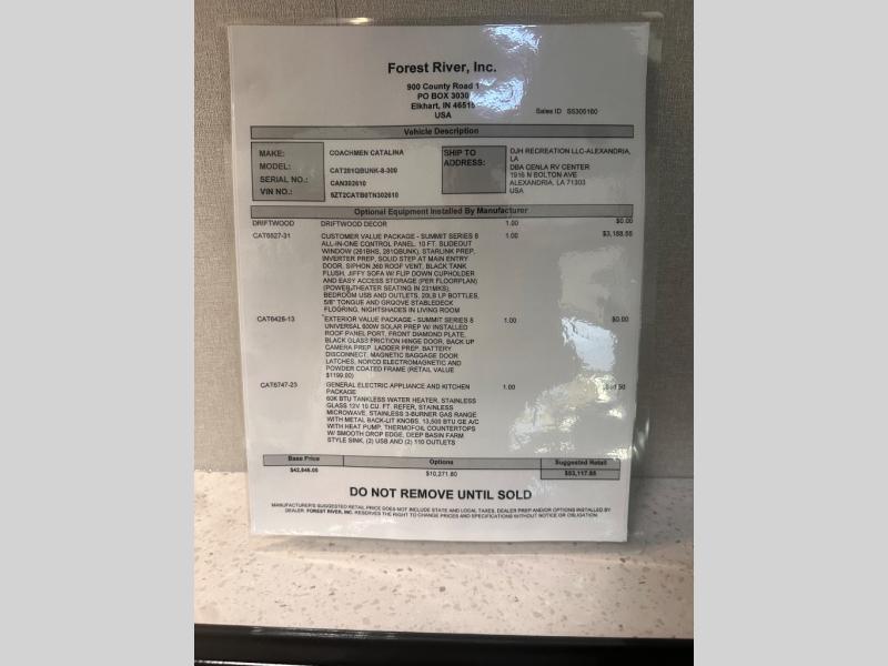 With any Catalina Summit Series 8 by Coachmen you will enjoy an affordable travel trailer packed with at-home comforts! The solid construction includes a Norco electromagnetic powder coated chassis, a seamless Alpha roof membrane, and full length frame outriggers for maximum support and durability. EZ lube axles with leaf spring suspension and self adjusting brakes provide smooth towing from home to campground, and the premium exterior graphics package is sure to turn heads as you travel down the highway. You will love the features included, such as a JBL Aura Cube media center, magnetic baggage door latches, 4,000 lumen interior touch lighting, and the list goes on!