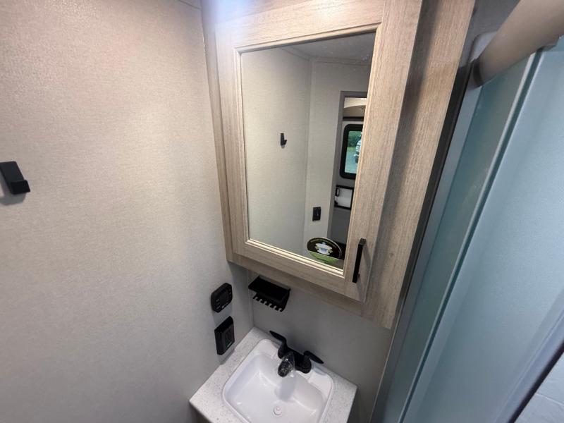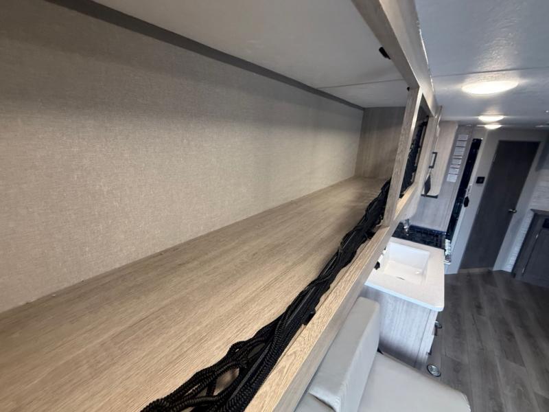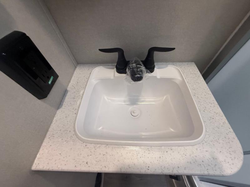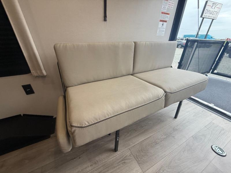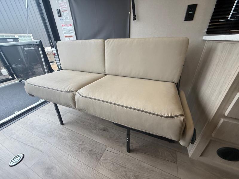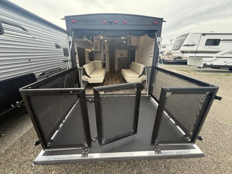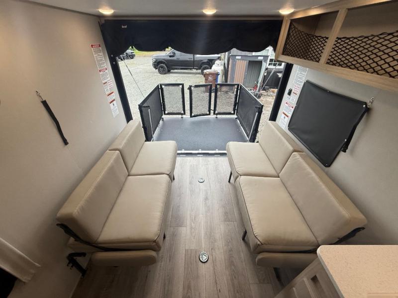 There are many reasons that you will want to own this Catalina Trail Blazer toy hauler, but one of those reasons is the great walk-through bathroom! Since there are entry doors on either side of this bathroom, you can access it from the main living area as well as from the front private bedroom. There is also a little bit of extra space in the bathroom since it spans the width of the trailer, and the shower skylight keeps this area bright. You'll definitely be spending most of your time out on the trails riding your bikes or out on the lake paddling your kayaks, but when you do come back inside this trailer, you will be met with two fold-down sofas, and you might want to add the optional recliners. There is also an optional party deck available if you want to extend your living space!
