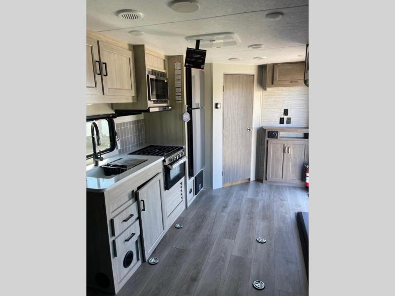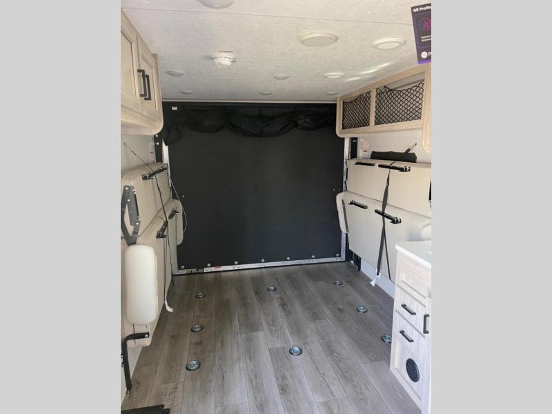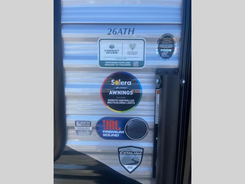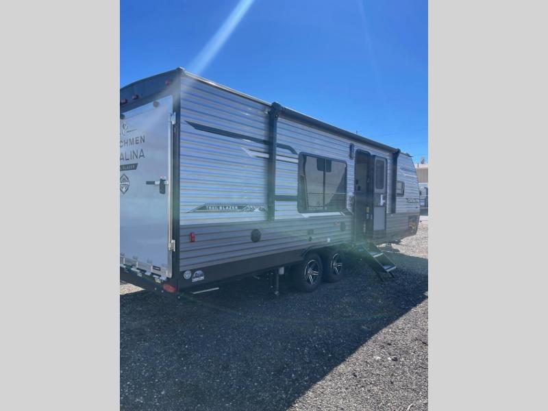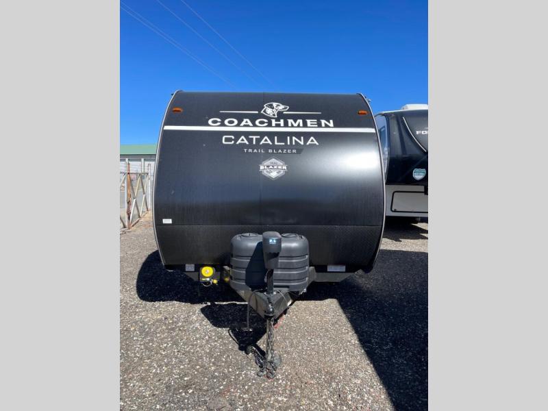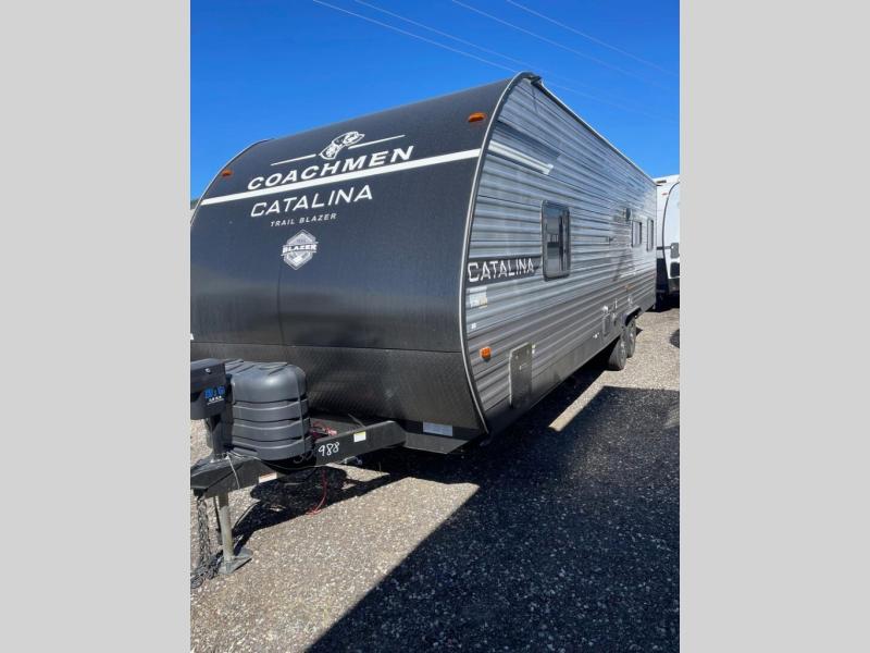 The best looking, most affordable toy hauler is found in the Catalina Trailer Blazer by Coachmen. Each one is constructed with a seamless alpha roof membrane, an enclosed and fully sealed underbelly, and a cambered structural steel I-beam frame for added support. There is a rear loading cargo door with a 3,000 lb. capacity, a black out screen wall with a zip walk-thru and windows, plus 500 lb. tie-downs to secure your toys. You'll love the interior with its Congoleum woodplank linoleum flooring and LED interior lighting. Head outside to find an electric awning with multicolored LED lights and a remote, a 15' Toy Loc cable, a "Leash Link" quick hookup D-ring for pets, and upgraded aluminum wheels. The Catalina Trail Blazer also comes with a JBL Aura Cube media center, plus premium JBL interior speakers for your pleasure!