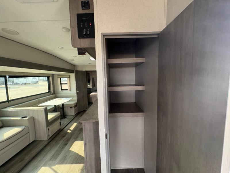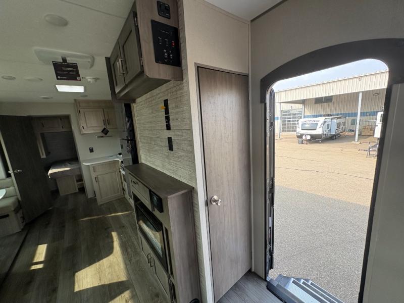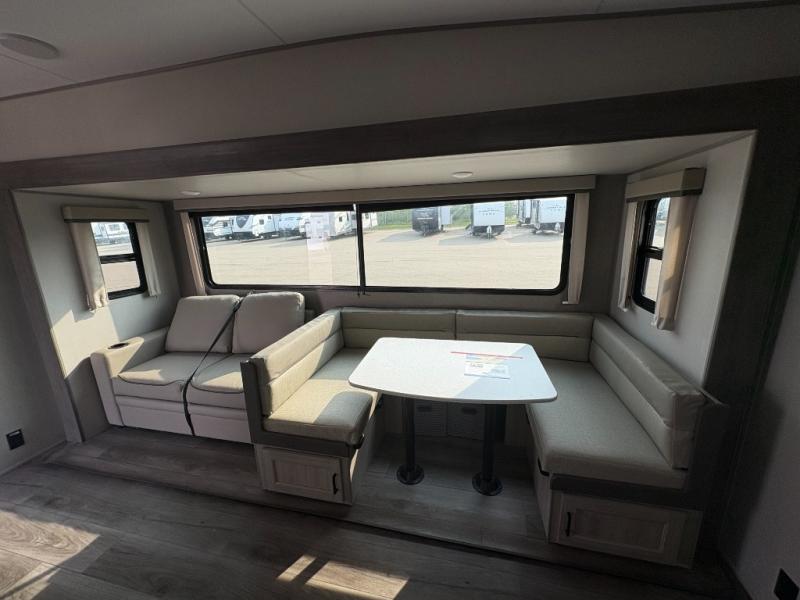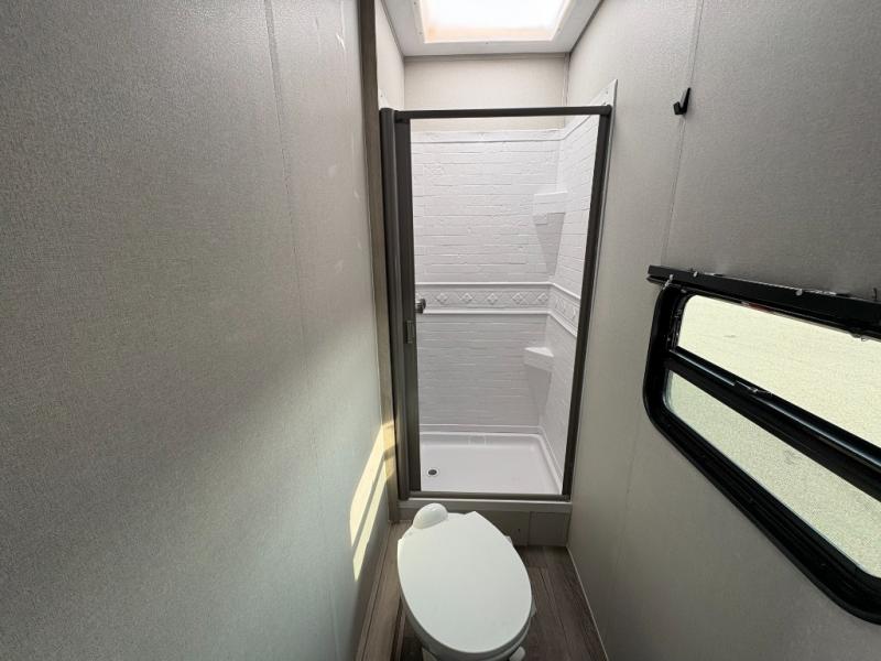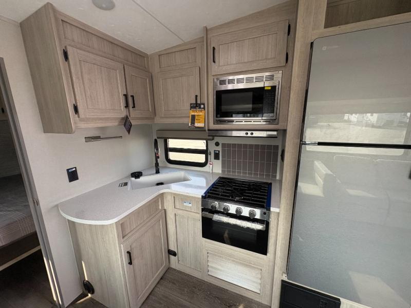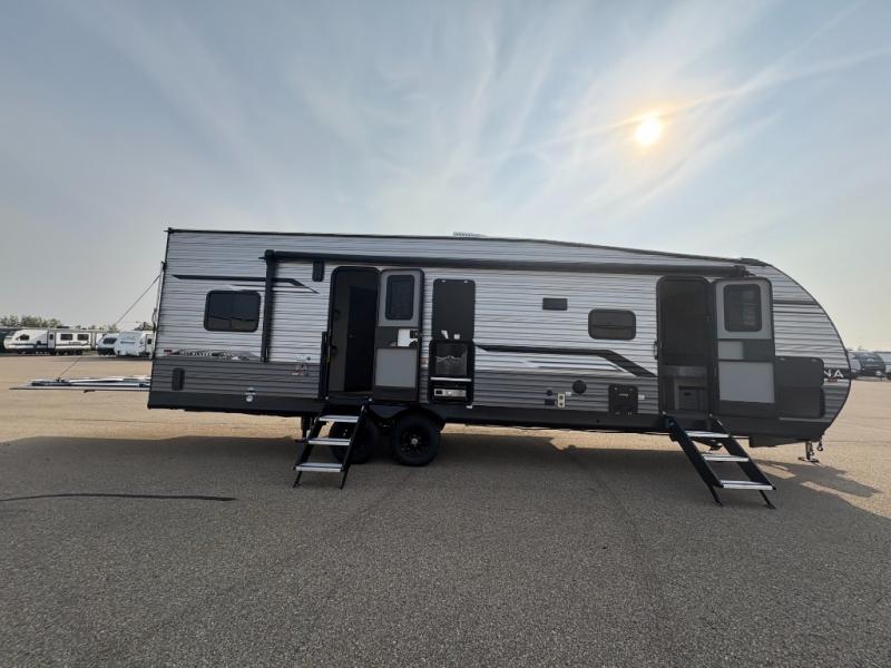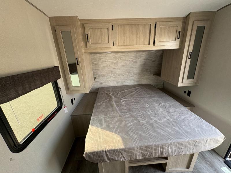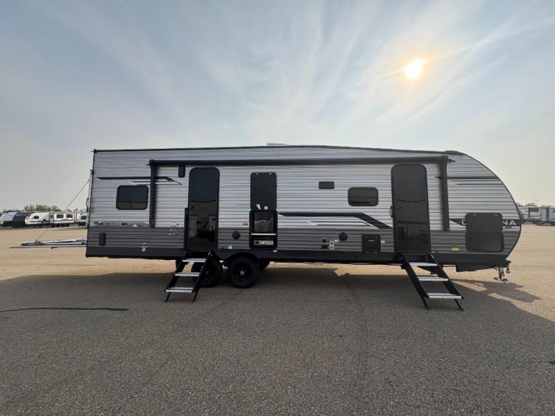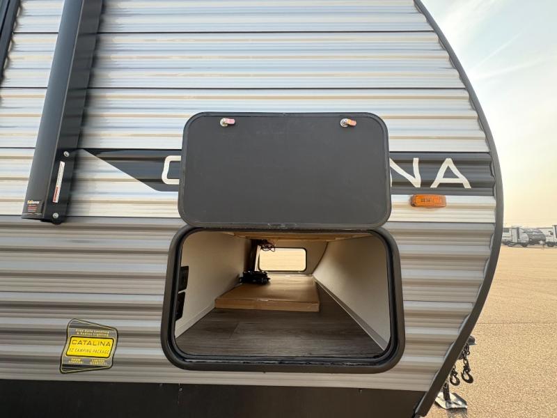 The best looking, most affordable toy hauler is found in the Catalina Trailer Blazer by Coachmen. Each one is constructed with a seamless alpha roof membrane, an enclosed and fully sealed underbelly, and a cambered structural steel I-beam frame for added support. There is a rear loading cargo door with a 3,000 lb. capacity, a black out screen wall with a zip walk-thru and windows, plus 500 lb. tie-downs to secure your toys. You'll love the interior with its Congoleum woodplank linoleum flooring and LED interior lighting. Head outside to find an electric awning with multicolored LED lights and a remote, a 15' Toy Loc cable, a "Leash Link" quick hookup D-ring for pets, and upgraded aluminum wheels. The Catalina Trail Blazer also comes with RV-LINK 4G LTE connectivity with a WiFi booster and extender, a JBL Aura Cube media center, plus premium JBL interior speakers for your pleasure!