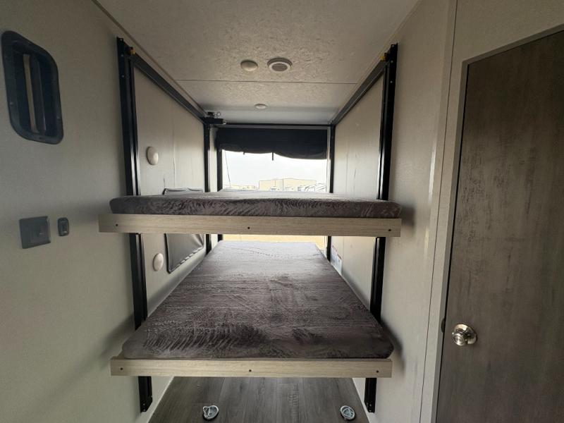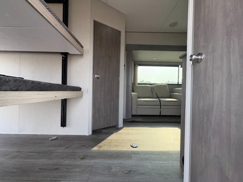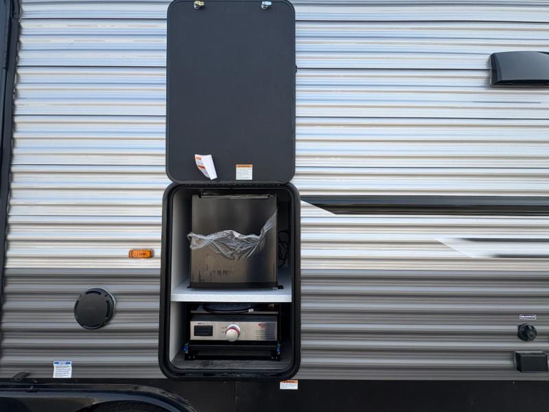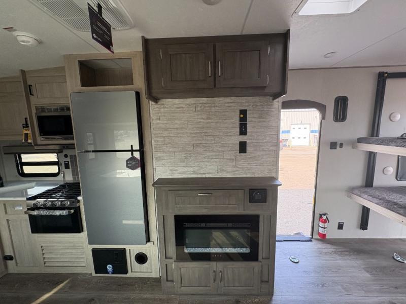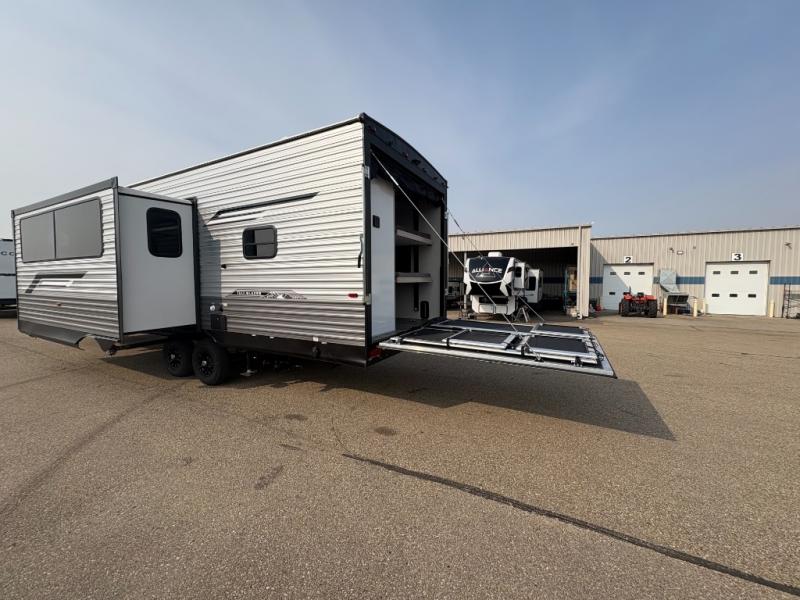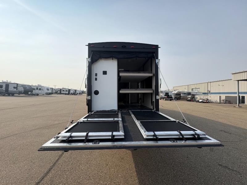 This toy hauler has lots of room for toys and guests! You will love the retreat of the front private bedroom with a queen bed, dual wardrobes and its own entry door. Additional guests can sleep in the double-size bunks with an electric trac bed lift in the cargo area, also with its own entry door. A rear corner bath makes efficient use of space and includes a 24" x 32" shower and a medicine cabinet. The main living area features an entertainment center that can be upgraded with an optional fireplace for maximum coziness. Relax on the sofa or the U-shaped dinette. You'll also appreciate the kitchen with its L-shaped counter, corner sink, microwave, GE stainless 10.7 cu. ft. 12V refrigerator, and three-burner range. Or step outside and use the camper kitchen with a griddle and mini refrigerator!