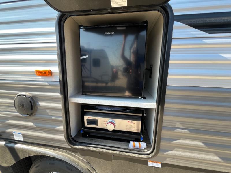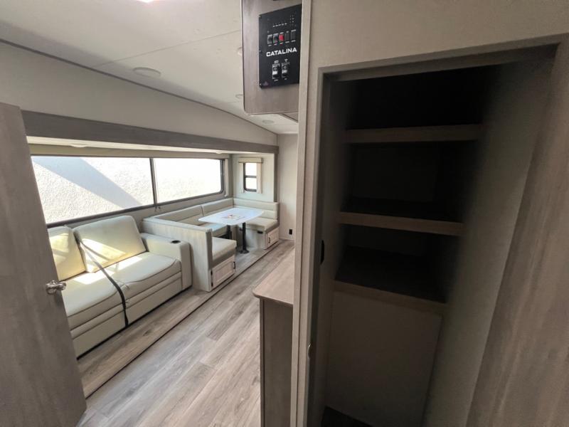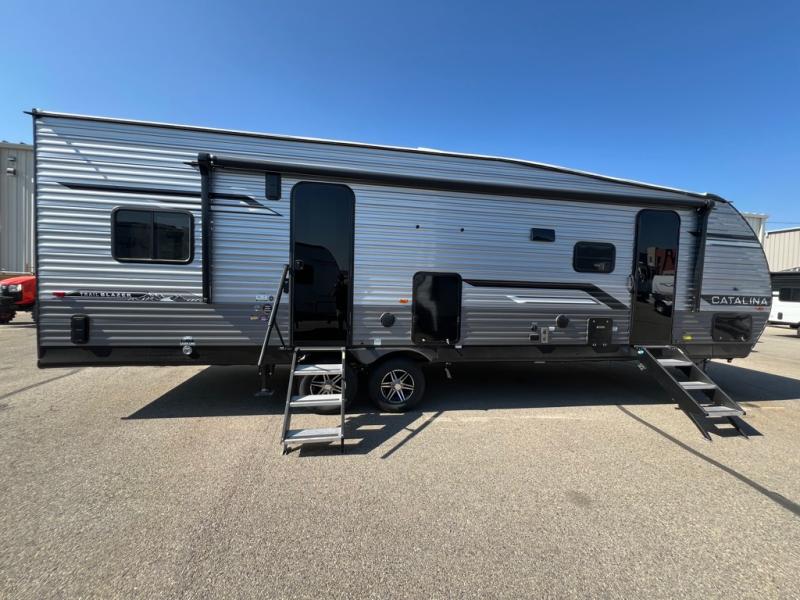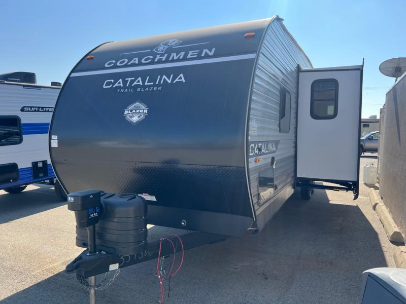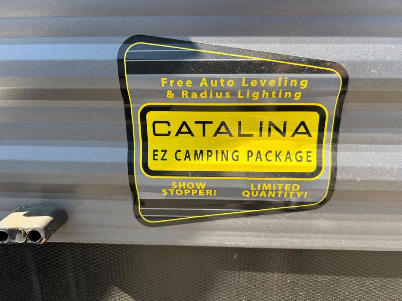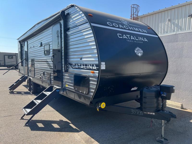 The best looking, most affordable toy hauler is found in the Catalina Trailer Blazer by Coachmen. Each one is constructed with a seamless alpha roof membrane, an enclosed and fully sealed underbelly, and a cambered structural steel I-beam frame for added support. There is a rear loading cargo door with a 3,000 lb. capacity, a black out screen wall with a zip walk-thru and windows, plus 500 lb. tie-downs to secure your toys. You'll love the interior with its Congoleum woodplank linoleum flooring and LED interior lighting. Head outside to find an electric awning with multicolored LED lights and a remote, a 15' Toy Loc cable, a "Leash Link" quick hookup D-ring for pets, and upgraded aluminum wheels. The Catalina Trail Blazer also comes with RV-LINK 4G LTE connectivity with a WiFi booster and extender, a JBL Aura Cube media center, plus premium JBL interior speakers for your pleasure!